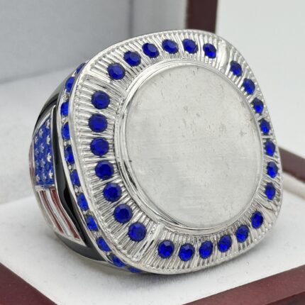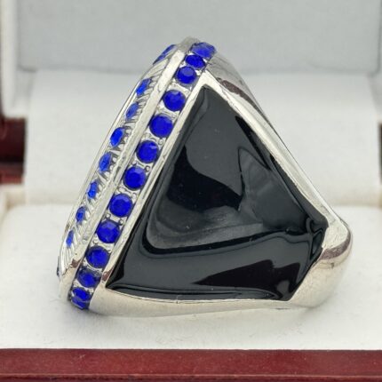 ROUND ADD YOUR LOGO RING — SILVER BODY, BLUE STONES, 2 ENGRAVABLE SIDES (Item #58-193)