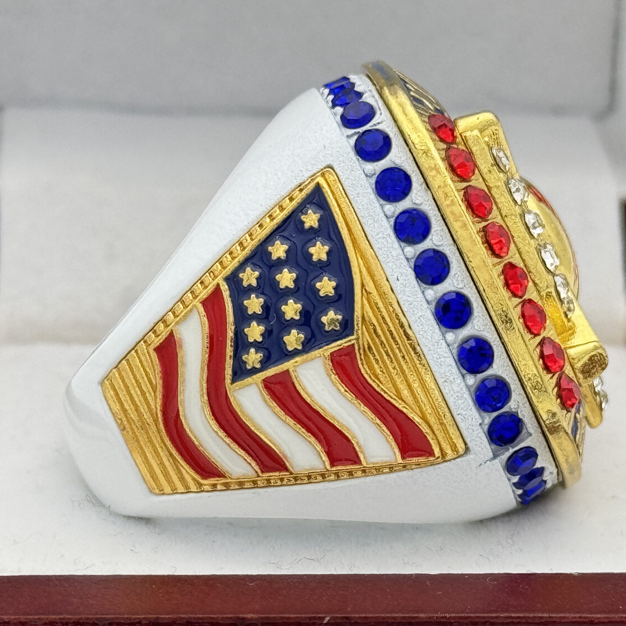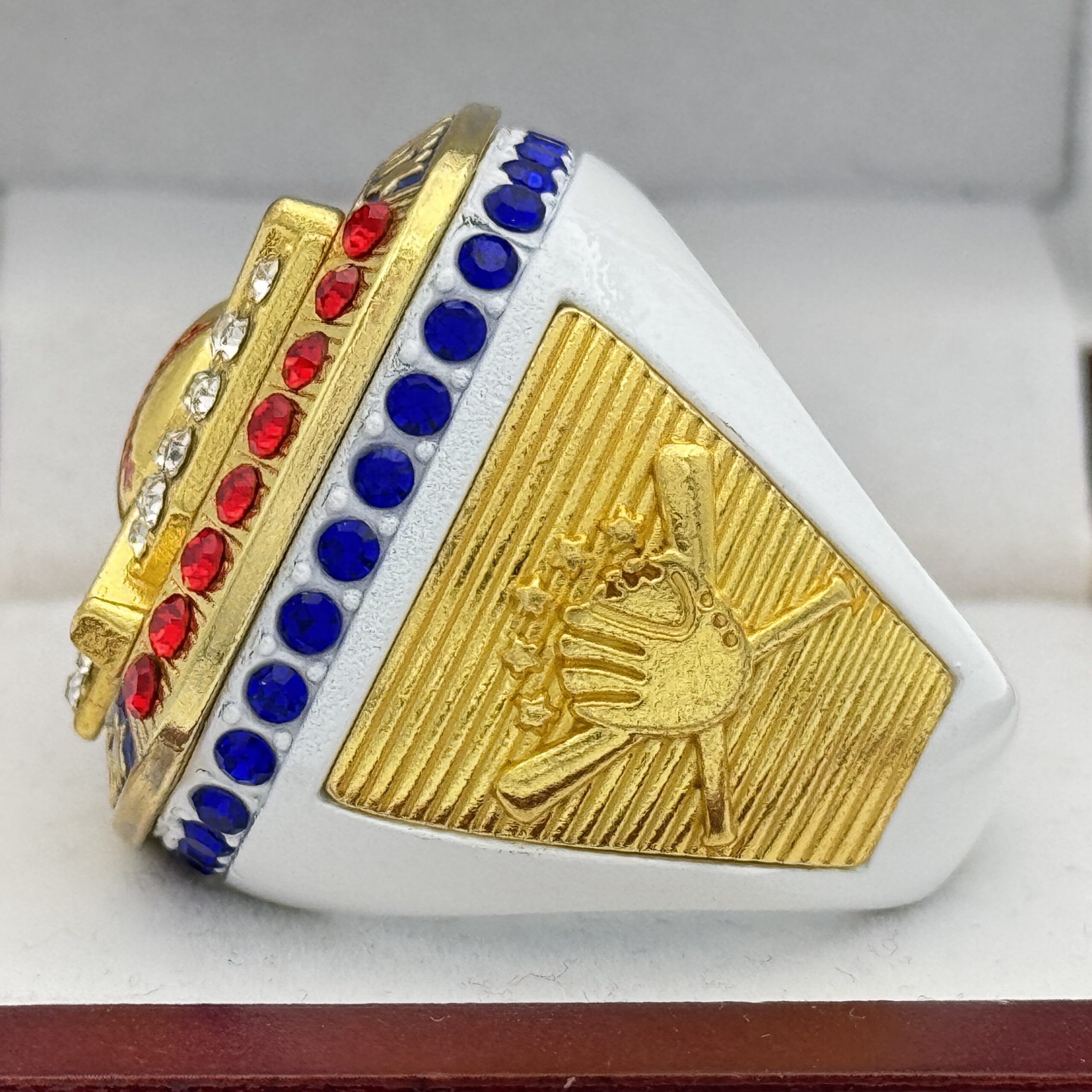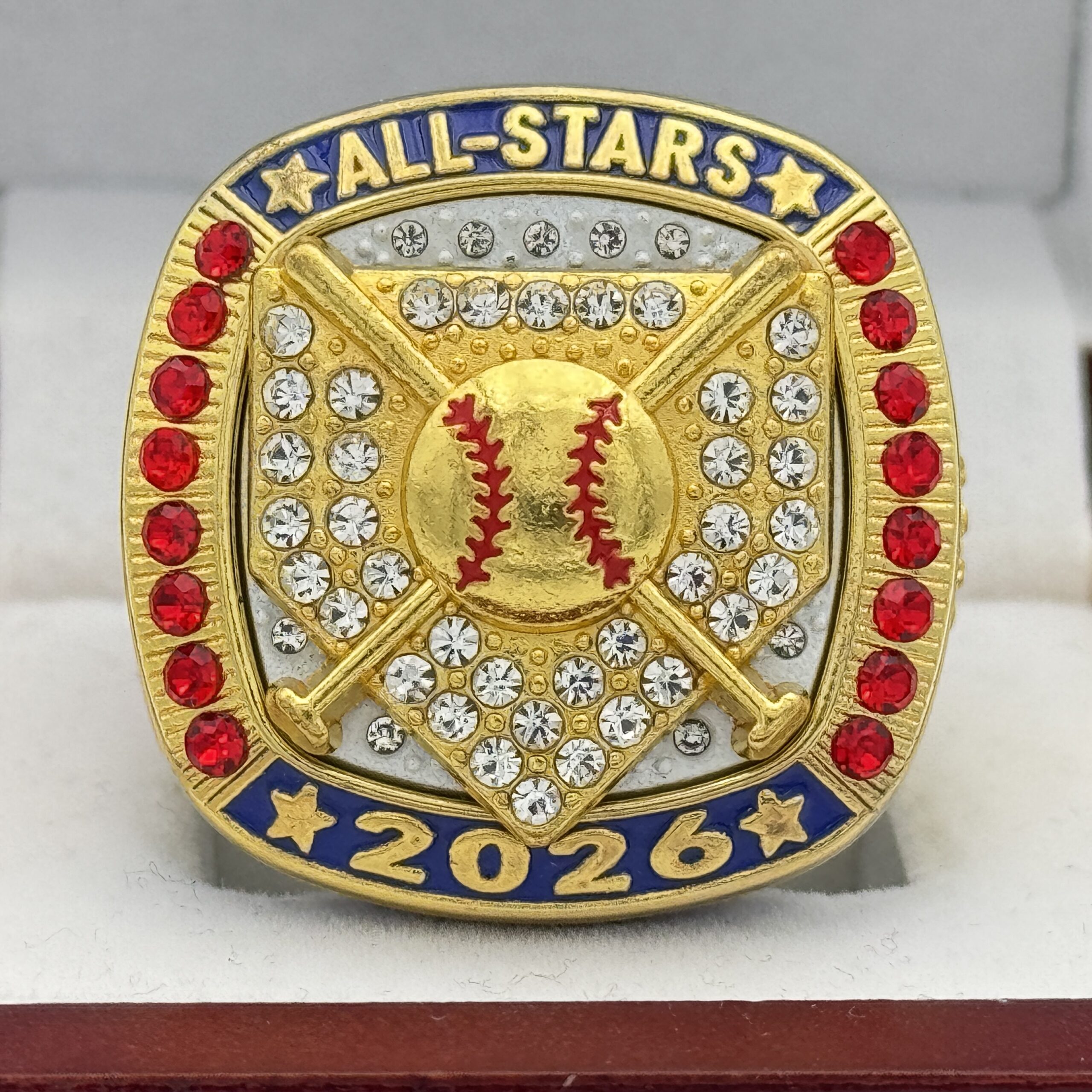 This ring is made of a zinc alloy. The ring body is white in color. The stones on the side bezel are blue in color the stones in the top bezel are red in color. There are gold inserts on the sides of the rings. The left side of the ring shows an American Flag and the right side shows a glove with crossed bats in the background. The top of the ring shows a home plate with crossed bats in the background with clear stones and All-star 2026 on the top.