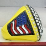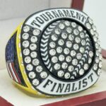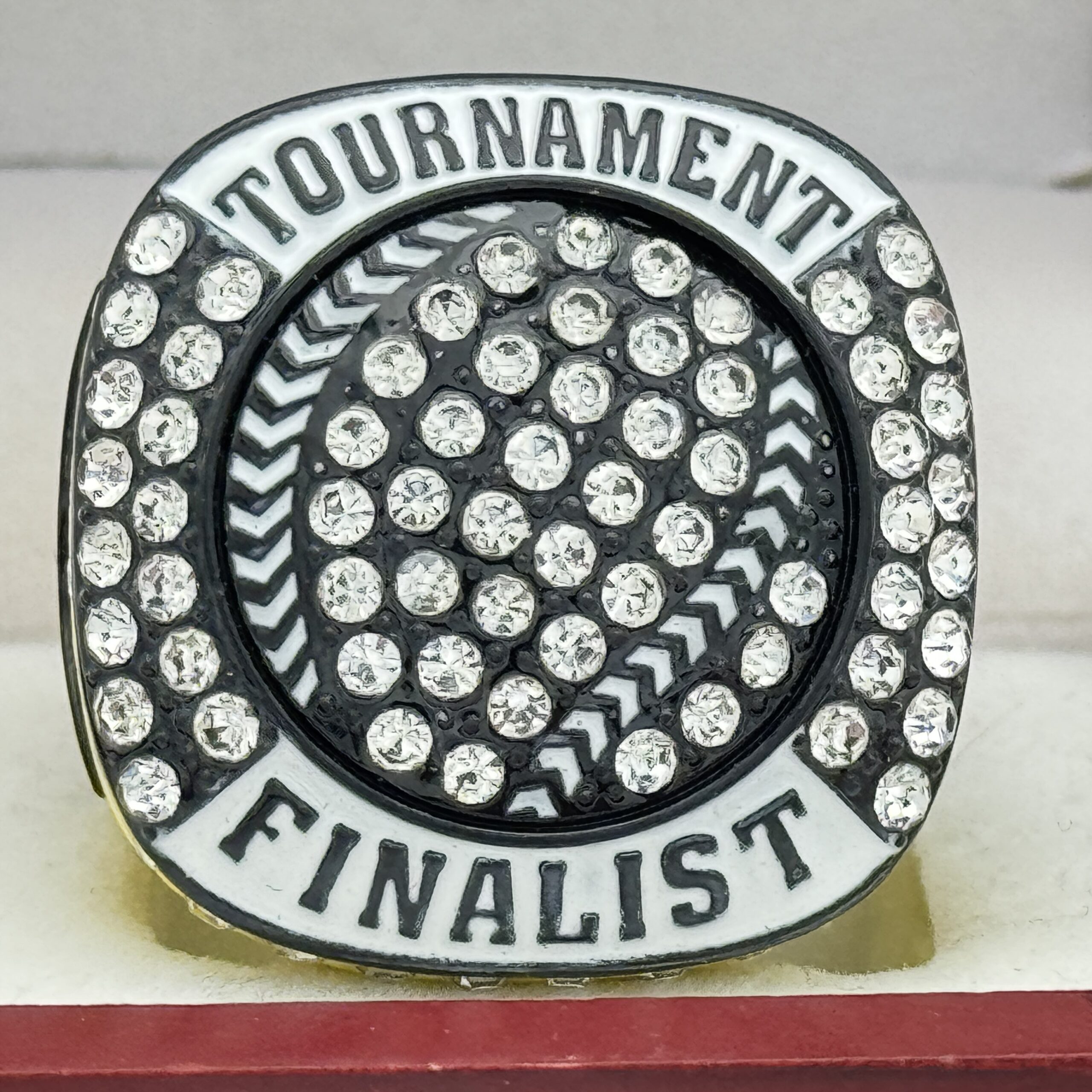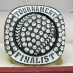 This ring is made of a zinc alloy. The ring body is yellow in color. The stones on the side bezel are clear in color the stones in the top bezel are clear in color. There are black inserts on the sides and top of the rings. The left side of the ring shows an American Flag and the right side shows a glove with crossed bats in the background. The top of the ring shows a ball with clear stones and tournament finalist on the top.