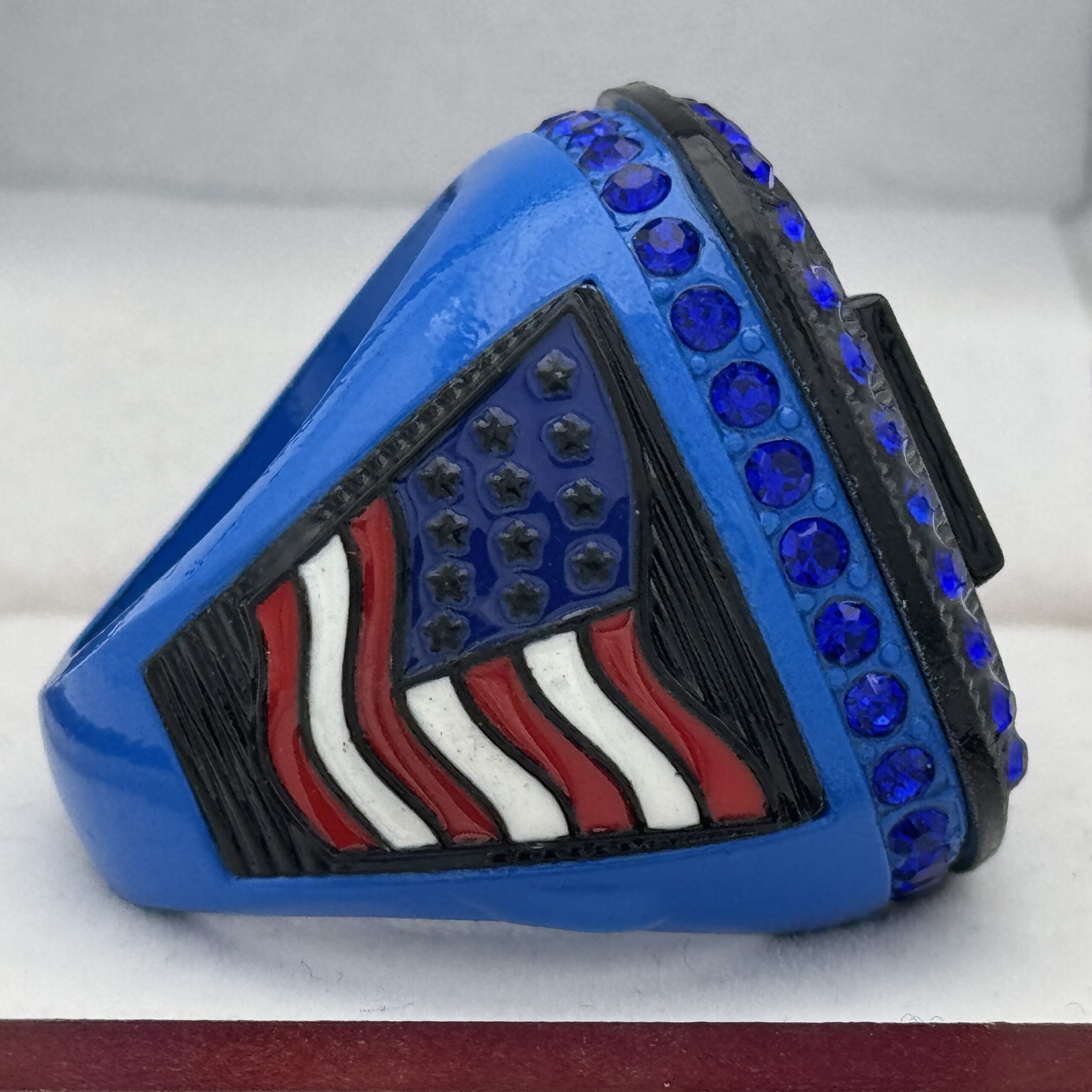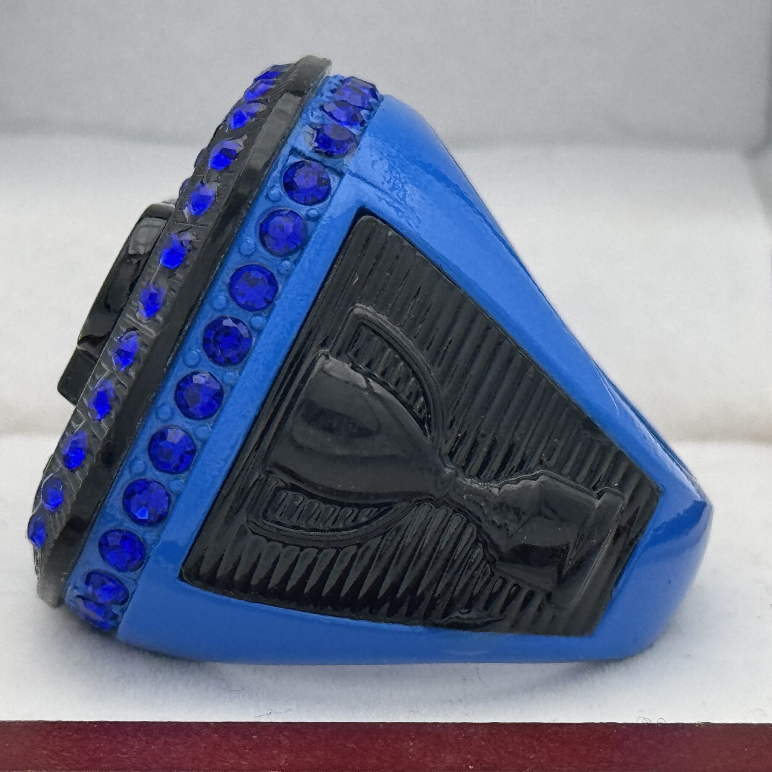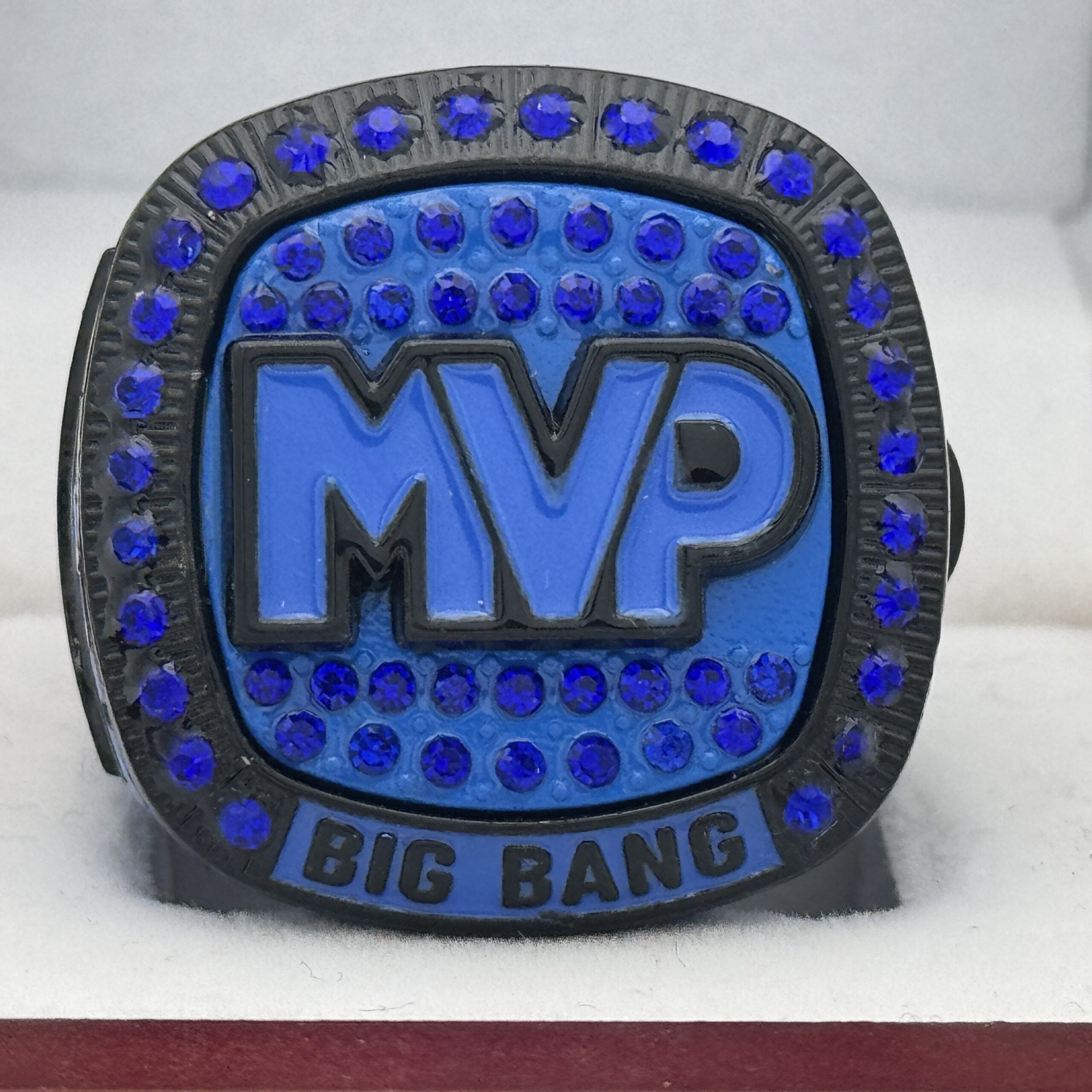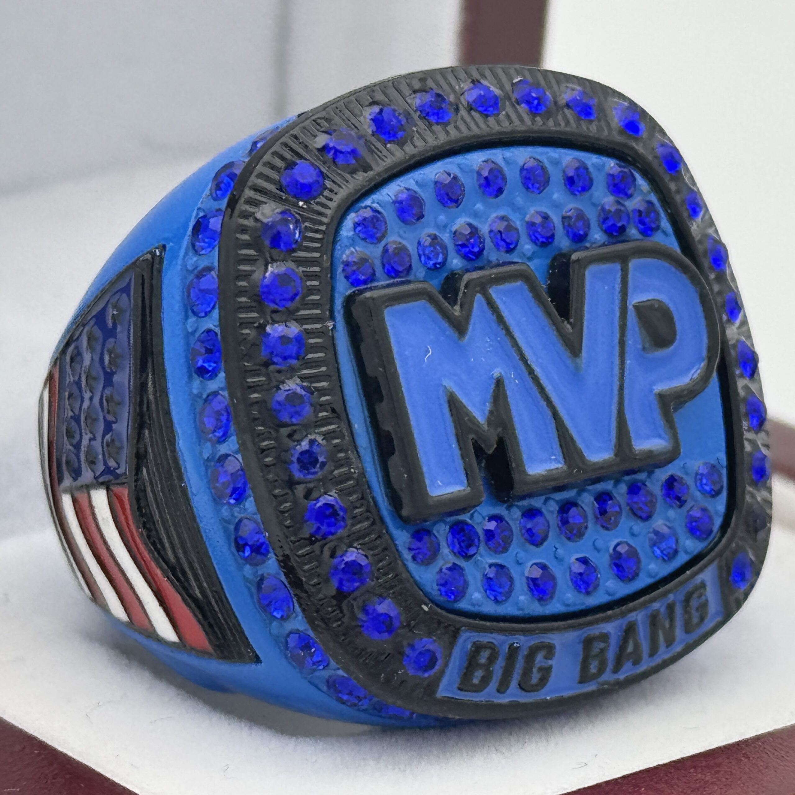 The ring body is neon blue in color. The stones on the side bezel are blue in color the stones in the top bezel are blue in color. There is black color inserts on the sides of the rings. The left side of the ring shows an American Flag and the right side shows a trophy cup. The top of the ring shows MVP and Big Bang on the top.