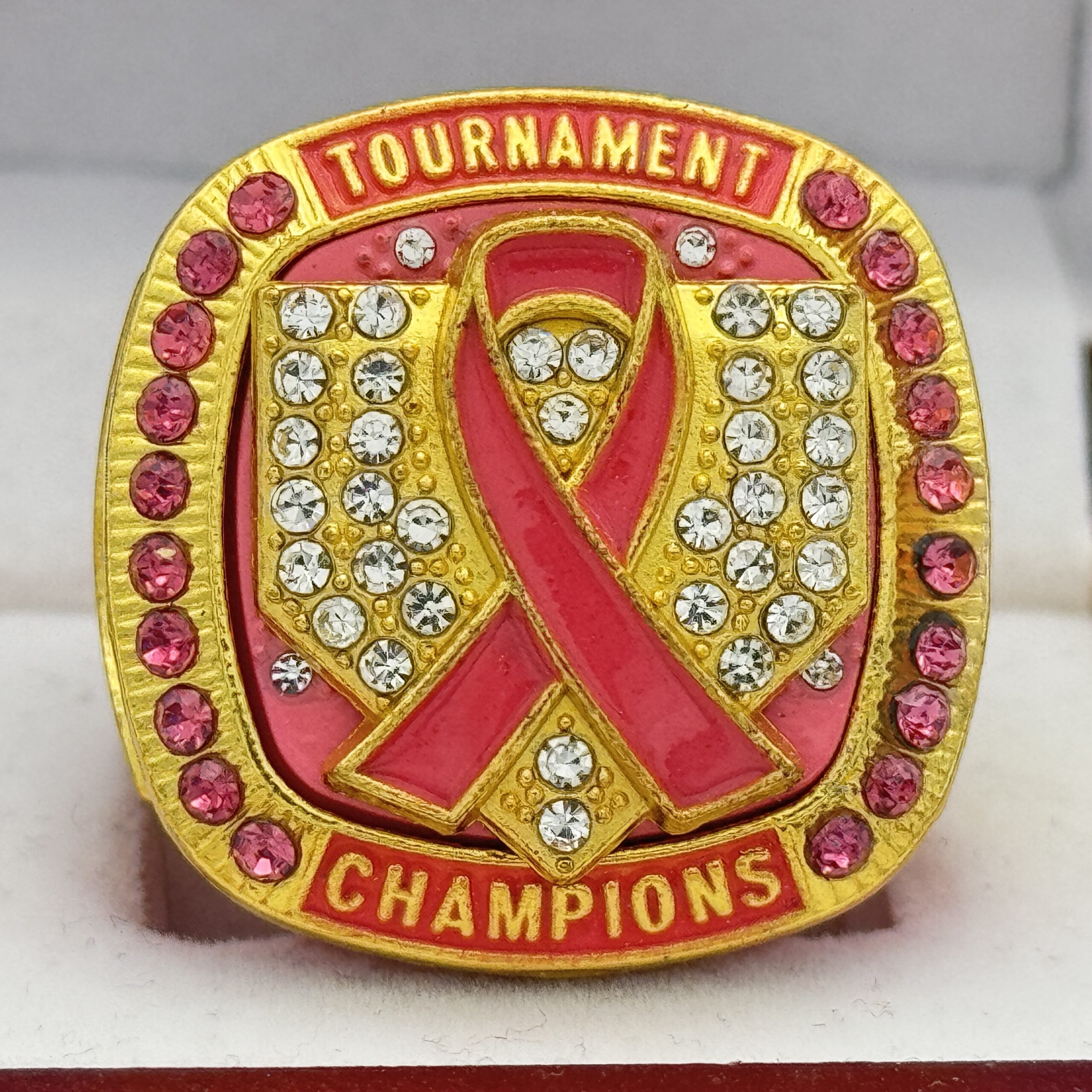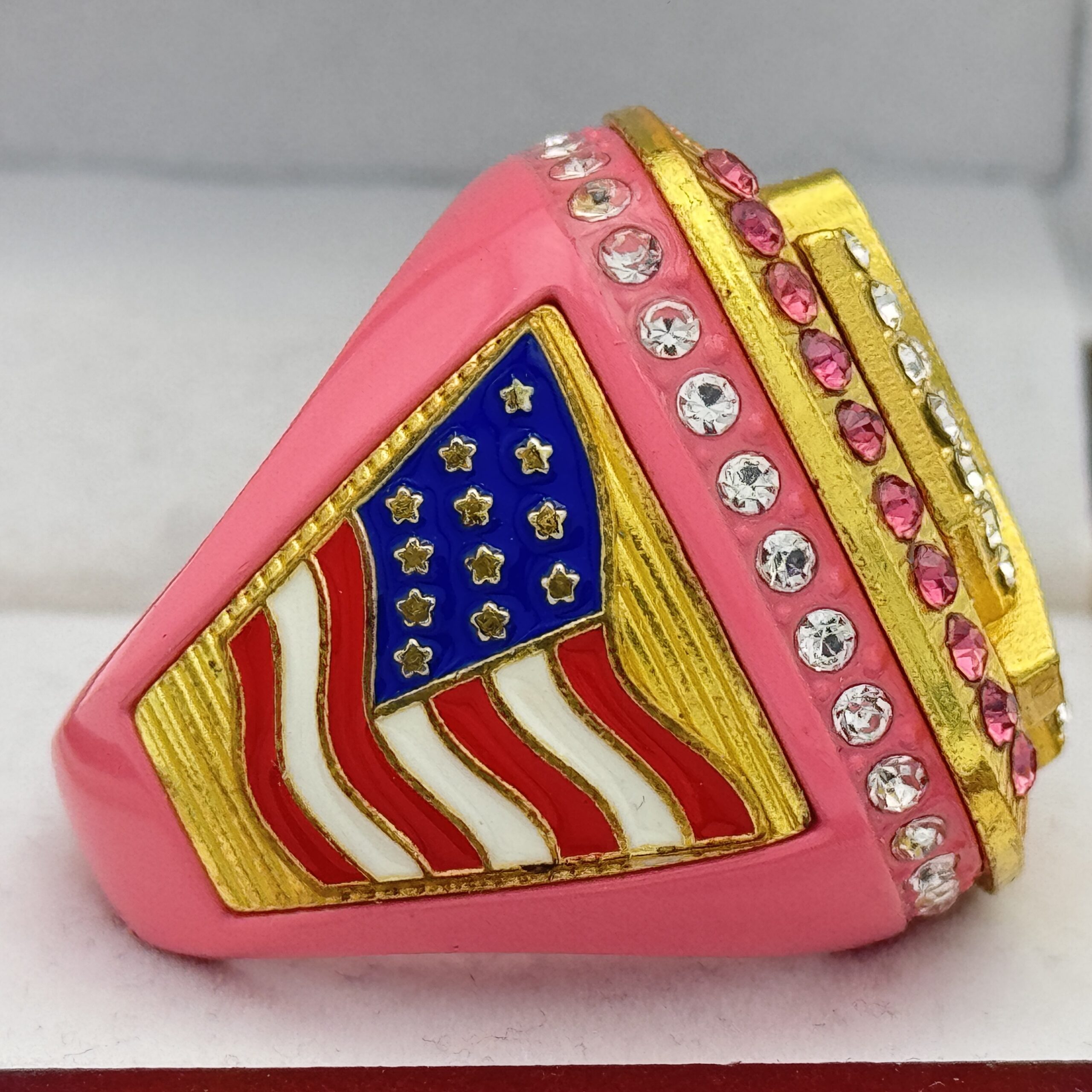 This ring is made of a zinc alloy. The ring body is pink in color. The stones on the side bezel are clear in color the stones in the top bezel are pink in color. There are gold inserts on the tops and sides of the rings. The left side of the ring shows an American Flag and the right side shows a glove with crossed bats in the background and champions. The top of the ring shows a home plate with a breast cancer awareness ribbon and tournament champions on the top.