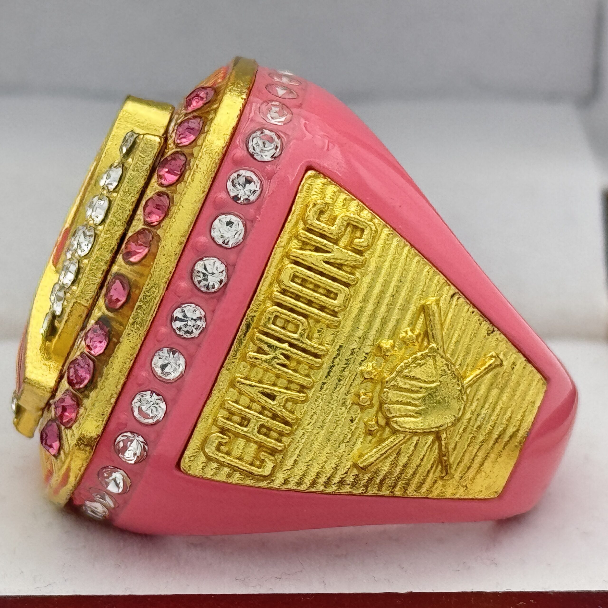 5 STAR DELUXE CANCER RIBBON HOME PLATE CHAMPION RING — PINK BODY, CLEAR/PINK STONES, GOLD INSERTS, SOFTBALL/BASEBALL (Item #34-104)