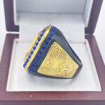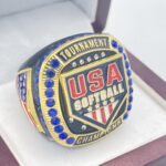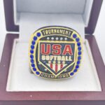 This ring is made of a zinc alloy. The ring body is black in color. The stones on the side bezel are blue in color the stones in the top bezel are blue in color. There are gold inserts on the sides of the rings. The left side of the ring shows an American Flag and the right side shows a glove with crossed bats in the background and champions. The top of the ring shows the USA Softball logo and TOURNAMENT Champions on the top.