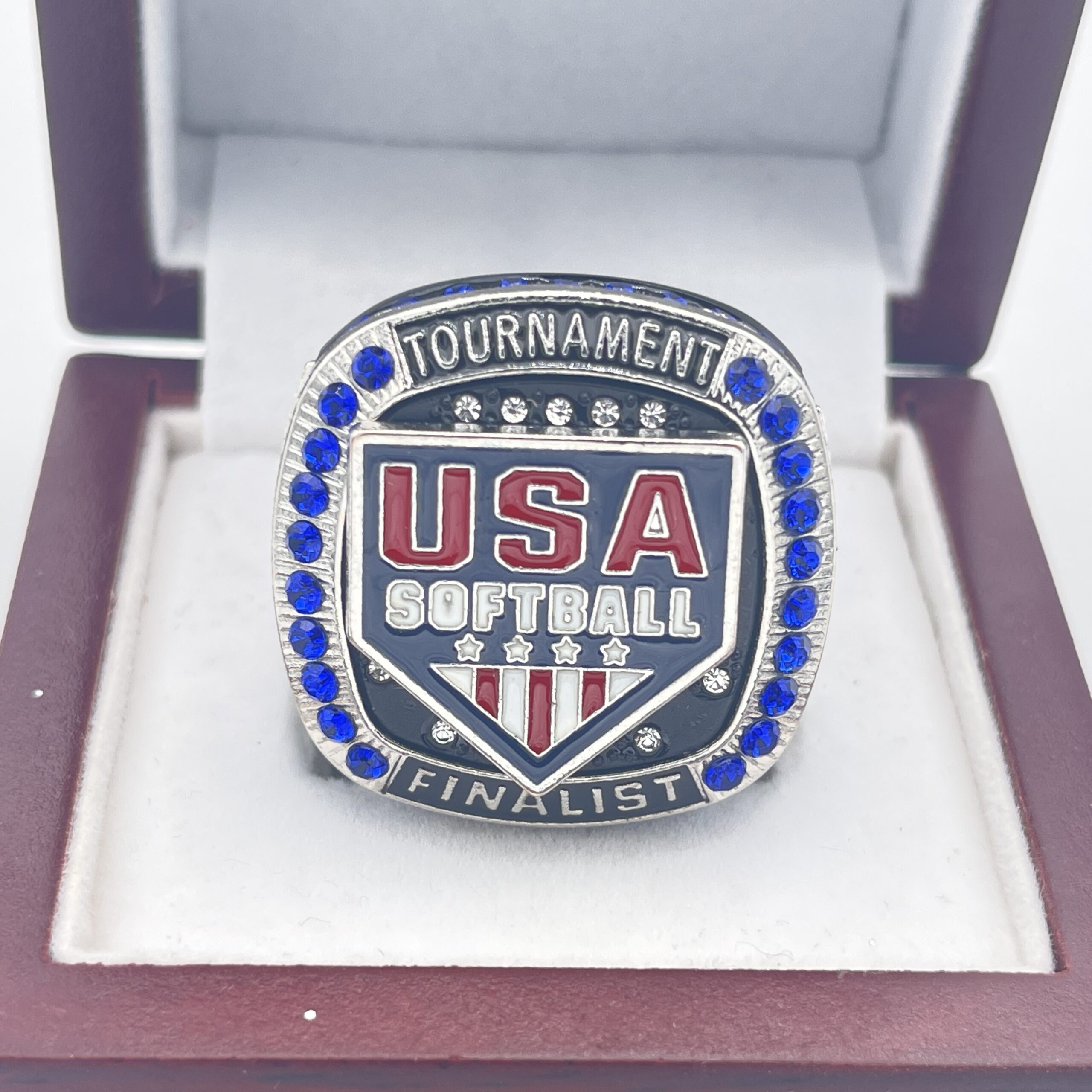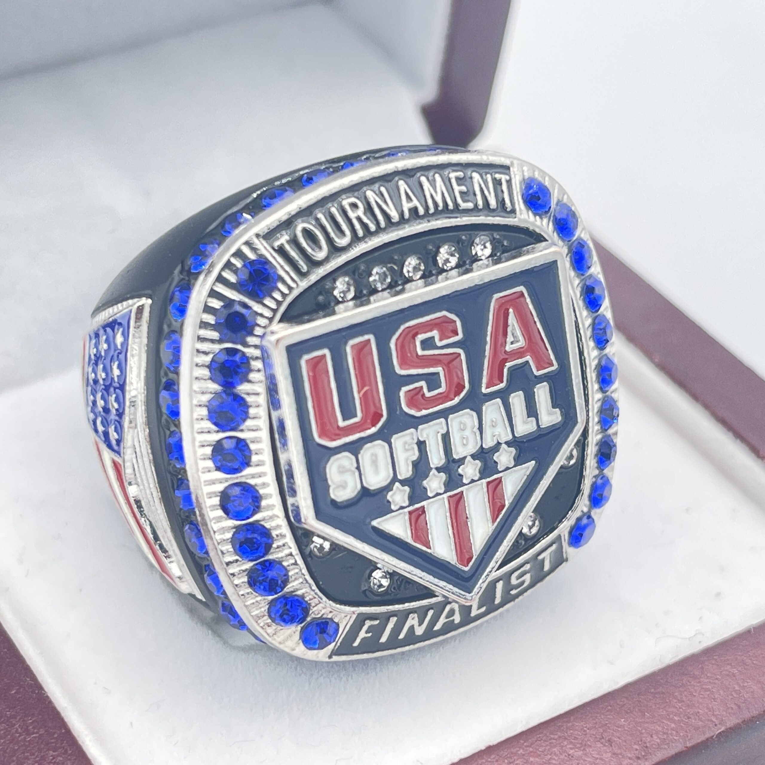 This ring is made of a zinc alloy. The ring body is black in color. The stones on the side bezel are blue in color the stones in the top bezel are blue in color. There are silver inserts on the sides of the rings. The left side of the ring shows an American Flag and the right side shows a glove with crossed bats in the background and champions. The top of the ring shows the USA Softball logo and TOURNAMENT Finalist on the top.