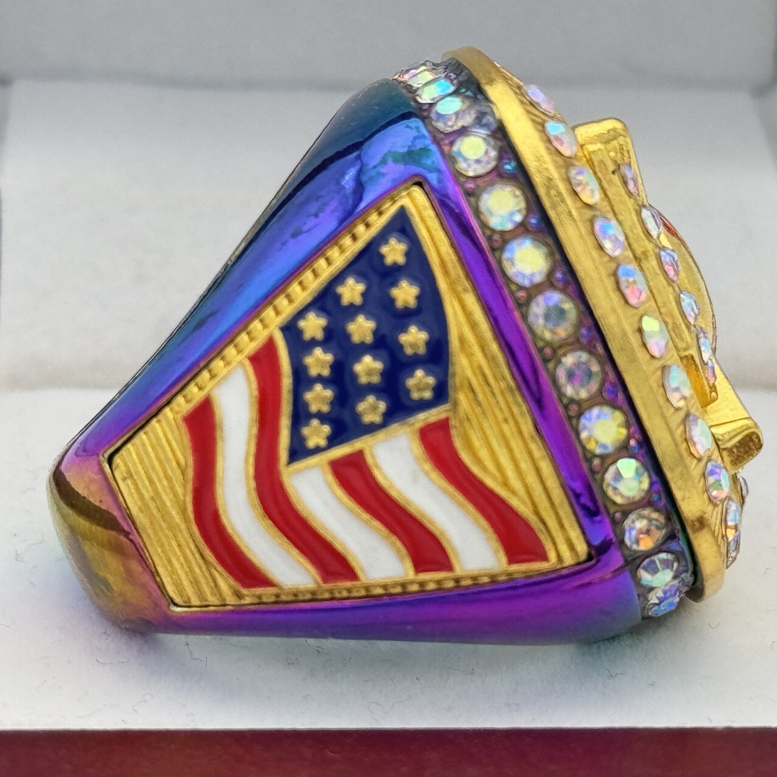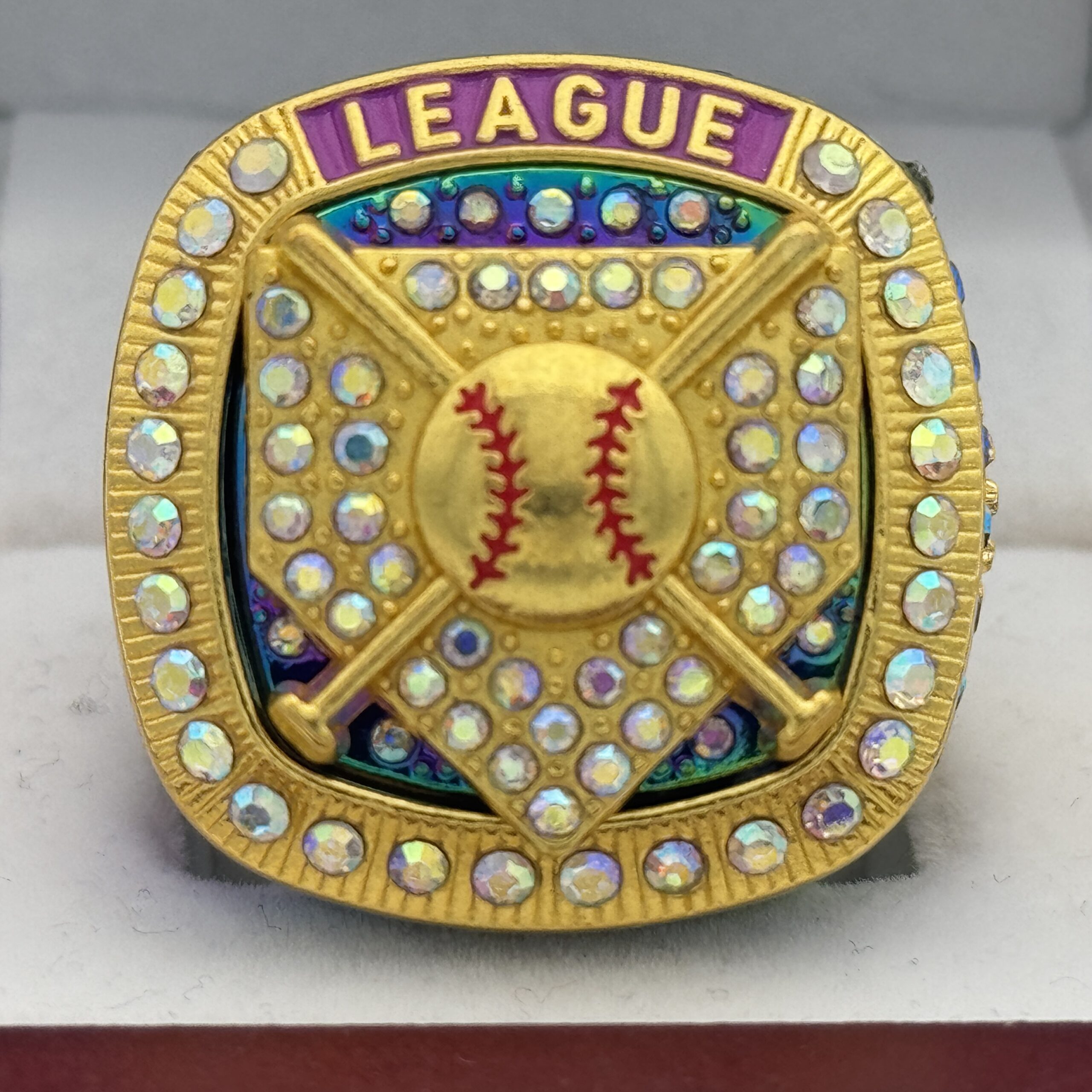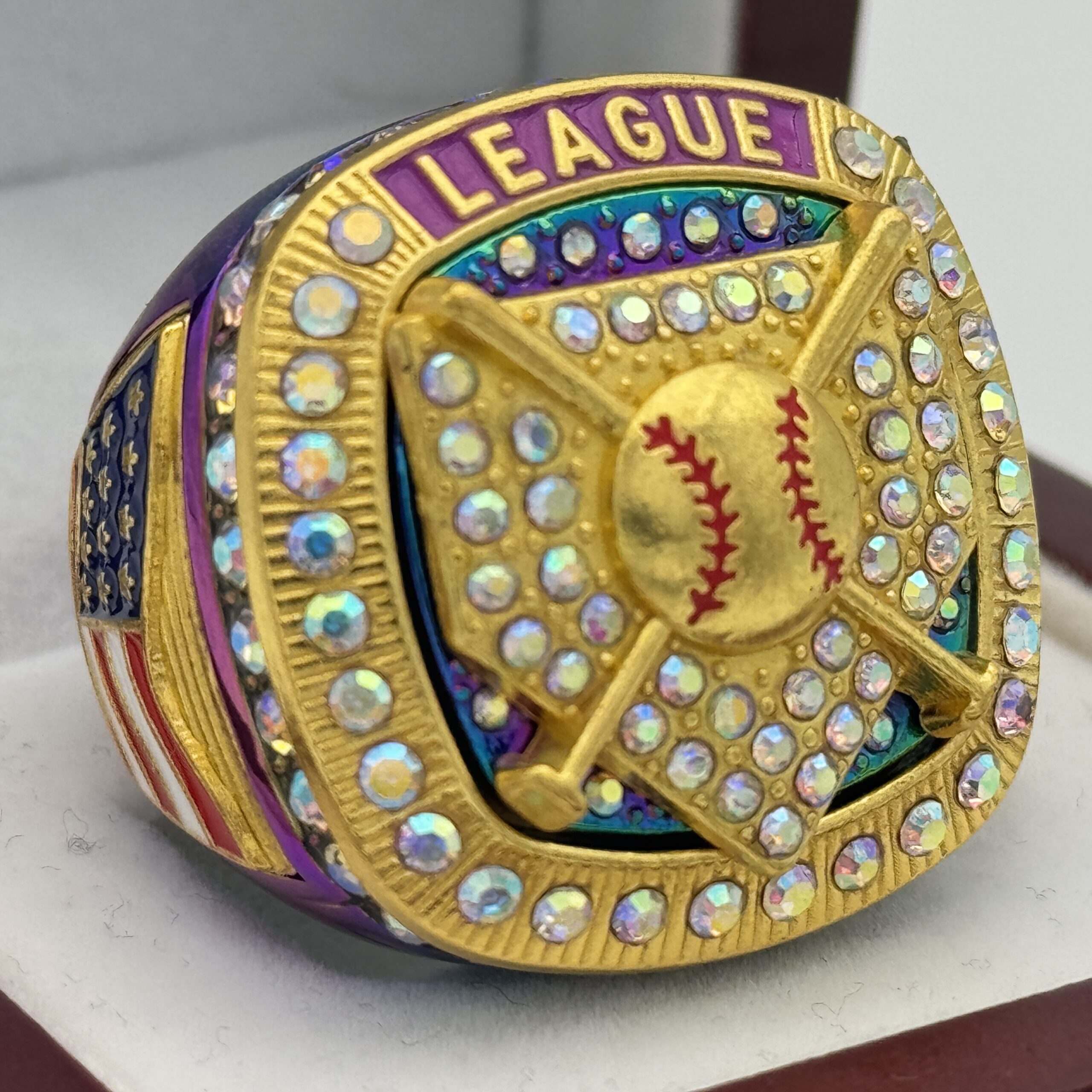 This ring is made of a zinc alloy. The ring body is rainbow in color. The stones on the side bezel are prismatic in color the stones in the top bezel are prismatic in color. There are gold inserts on the sides of the rings. The left side of the ring shows an American Flag and the right side shows a glove with crossed bats in the background and champions. The top of the ring shows a home plate with crossed bats in the background with prismatic stones and league on the top.