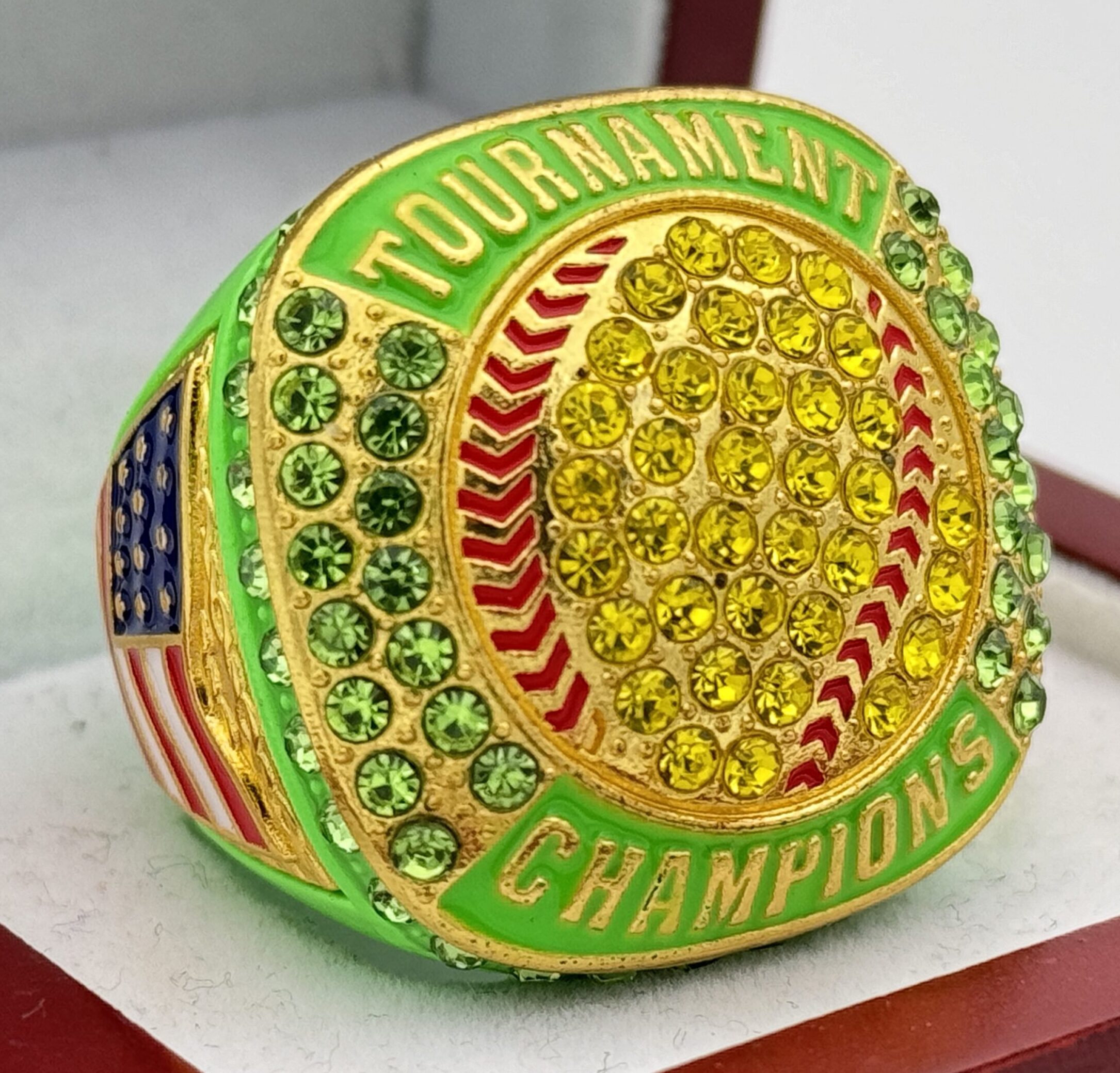 This ring is made of a zinc alloy. The ring body is neon green in color. The stones on the side bezel are green in color the stones in the top bezel are green in color. There are gold inserts on the sides of the rings. The left side of the ring shows an American Flag and the right side shows a glove with crossed bats in the background. The top of the ring shows a ball with yellow stones and tournament champions on the top.