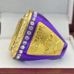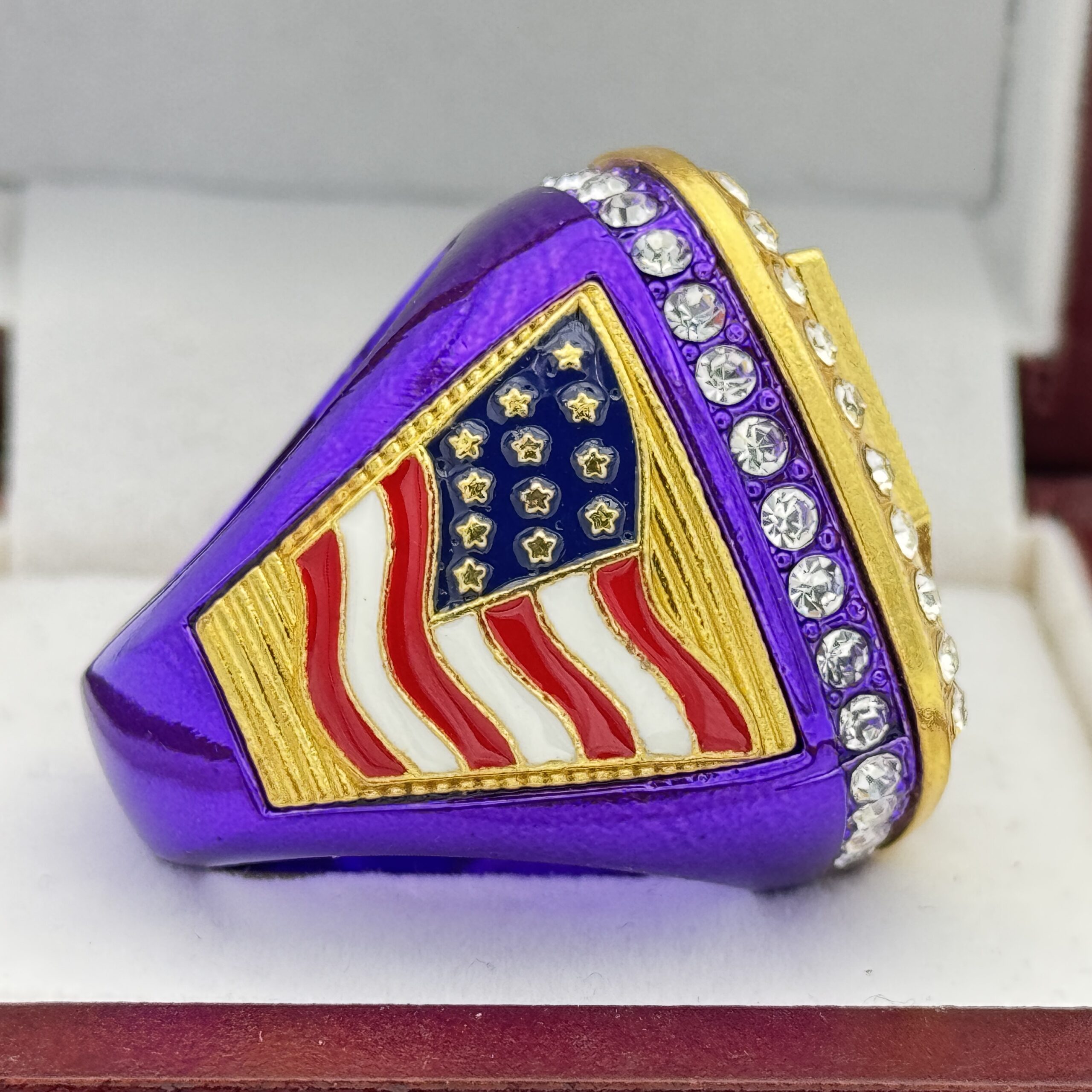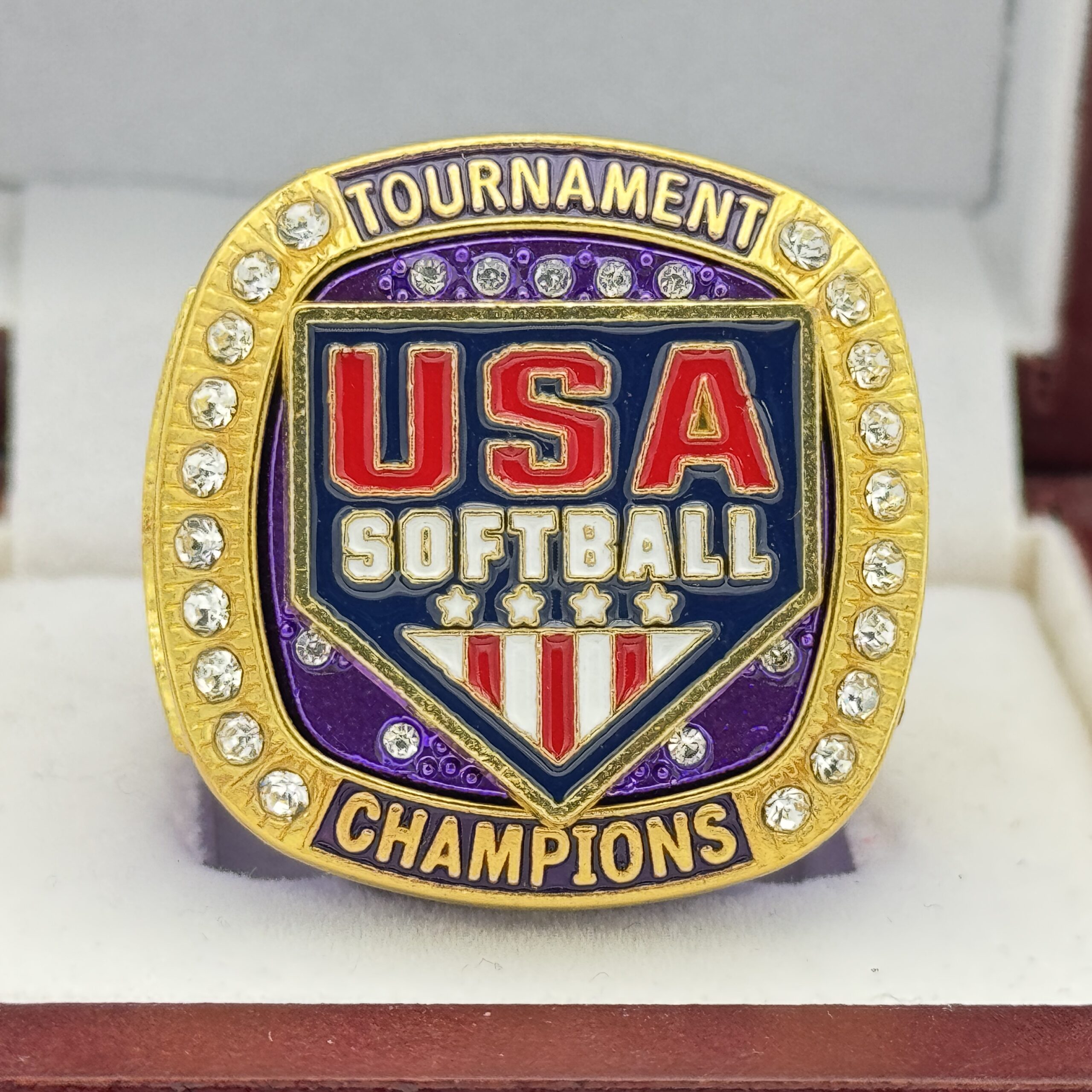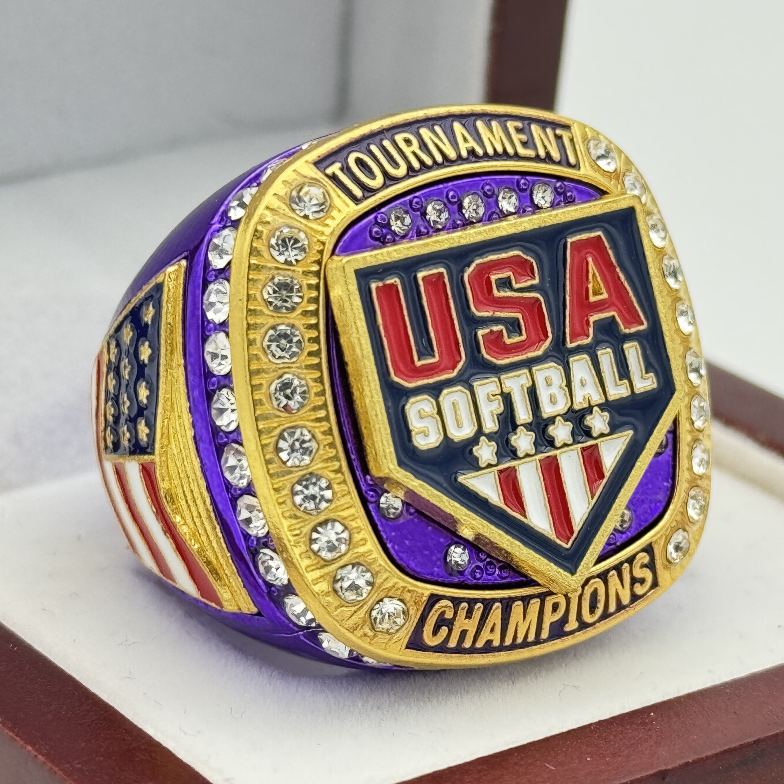 This ring is made of a zinc alloy. The ring body is purple in color. The stones on the side bezel are clear in color the stones in the top bezel are clear in color. There are gold inserts on the sides of the rings. The left side of the ring shows an American Flag and the right side shows a glove with crossed bats in the background and champions. The top of the ring shows the USA Softball logo and tournament champions on the top.