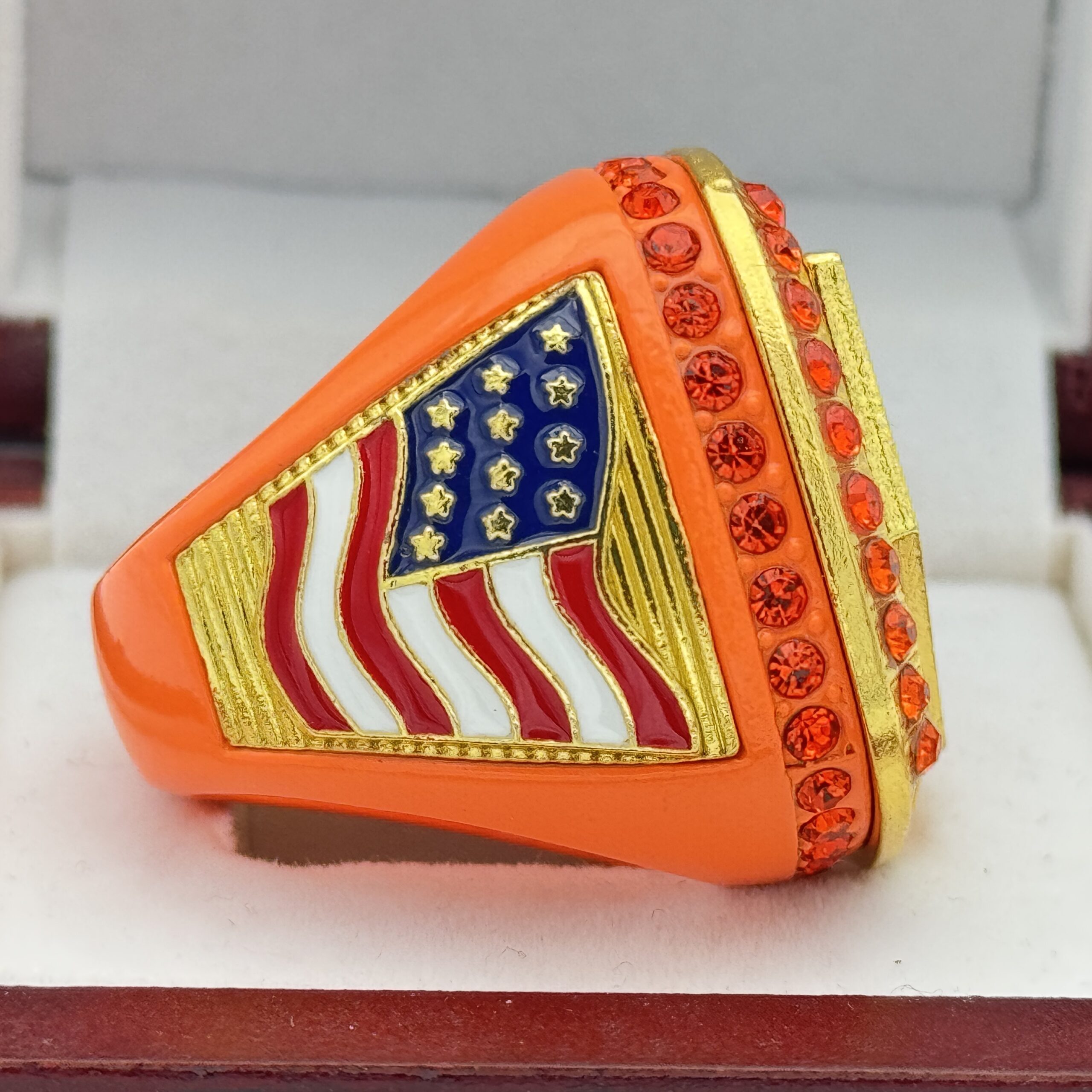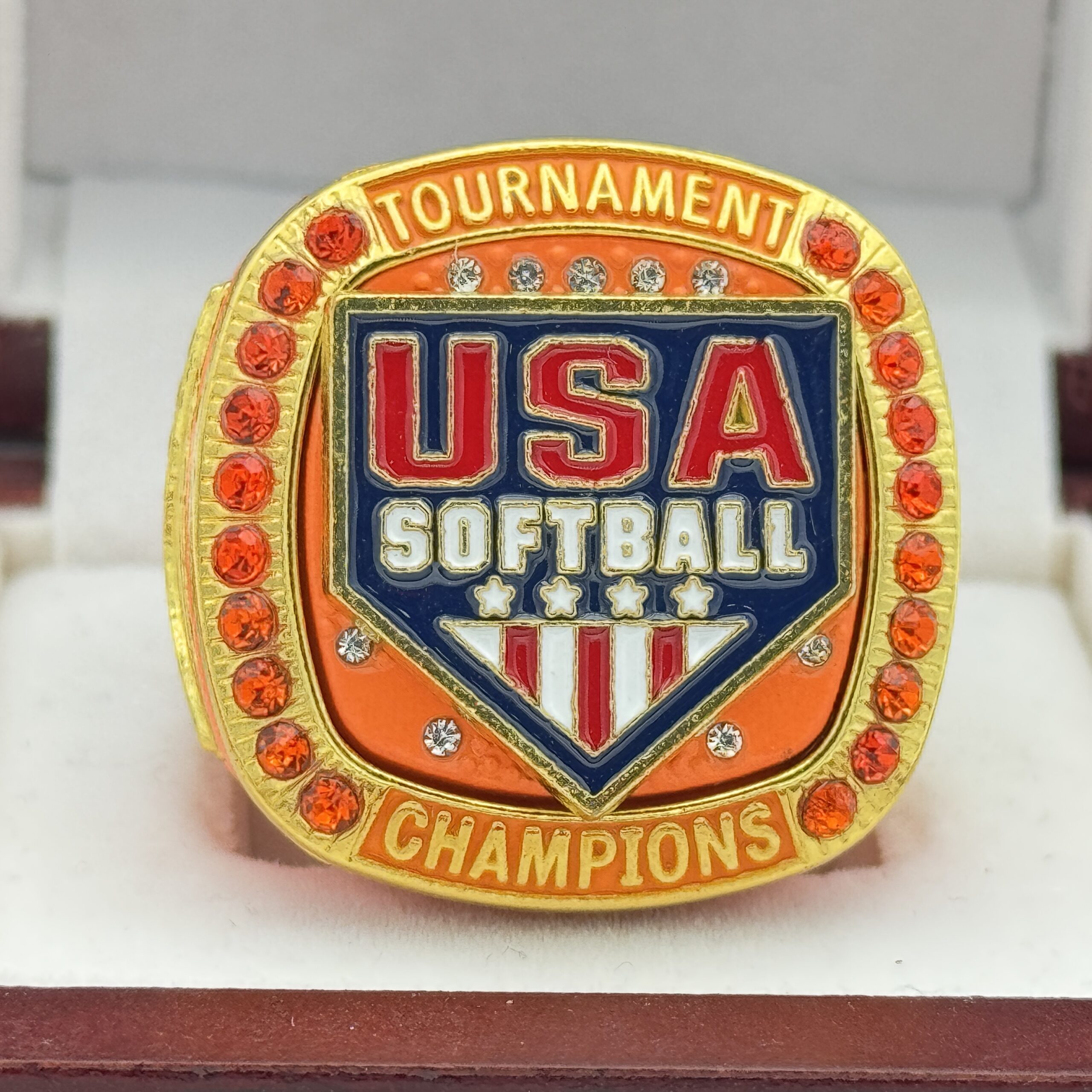 This ring is made of a zinc alloy. The ring body is neon orange in color. The stones on the side bezel are orange in color the stones in the top bezel are orange in color. There are gold inserts on the sides of the rings. The left side of the ring shows an American Flag and the right side shows a glove with crossed bats in the background and champions. The top of the ring shows the USA Softball logo and tournament champions on the top.