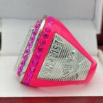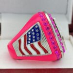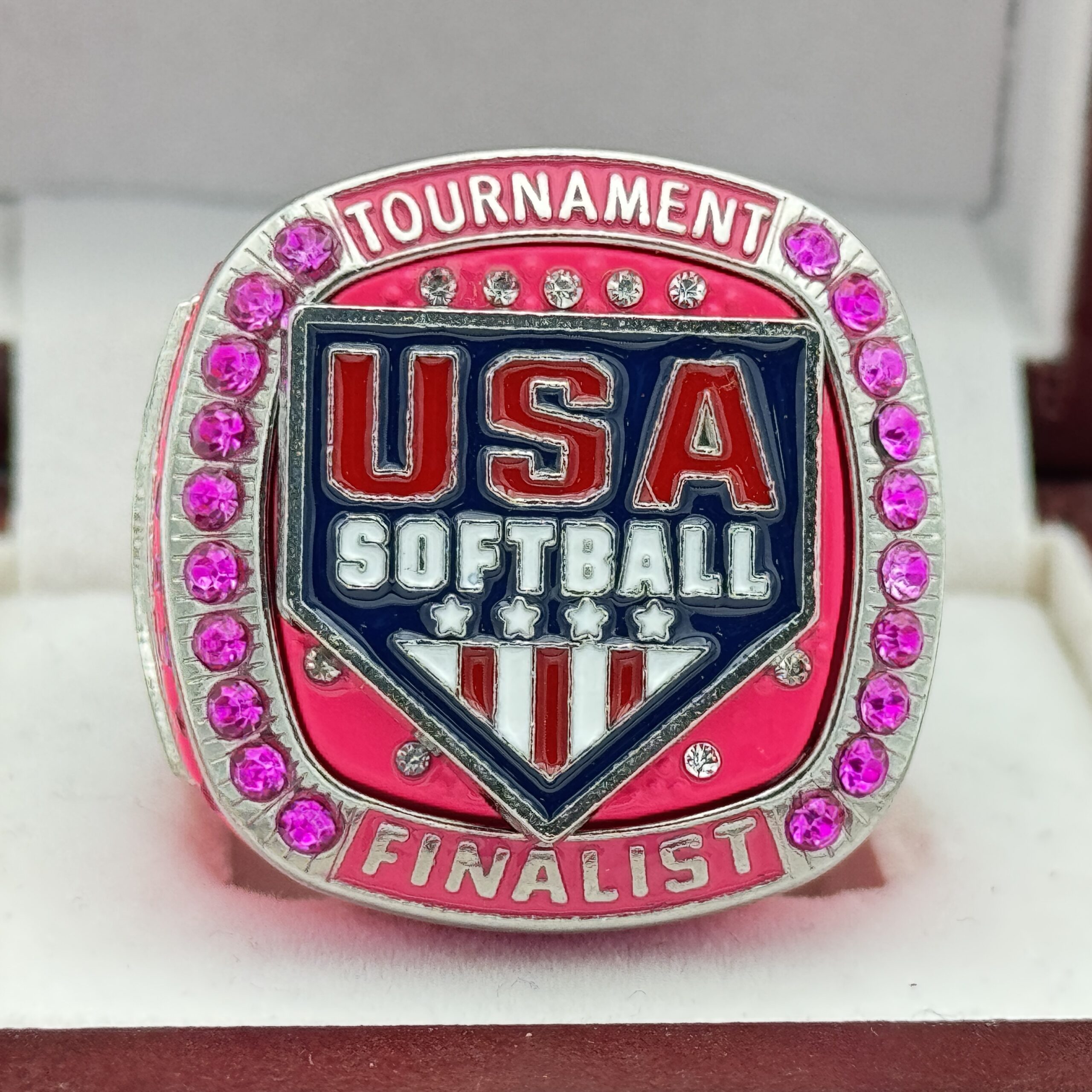 This ring is made of a zinc alloy. The ring body is neon pink in color. The stones on the side bezel are pink in color the stones in the top bezel are pink in color. There are silver inserts on the sides of the rings. The left side of the ring shows an American Flag and the right side shows a glove with crossed bats in the background and finalist. The top of the ring shows the USA Softball logo and tournament finalist on the top.