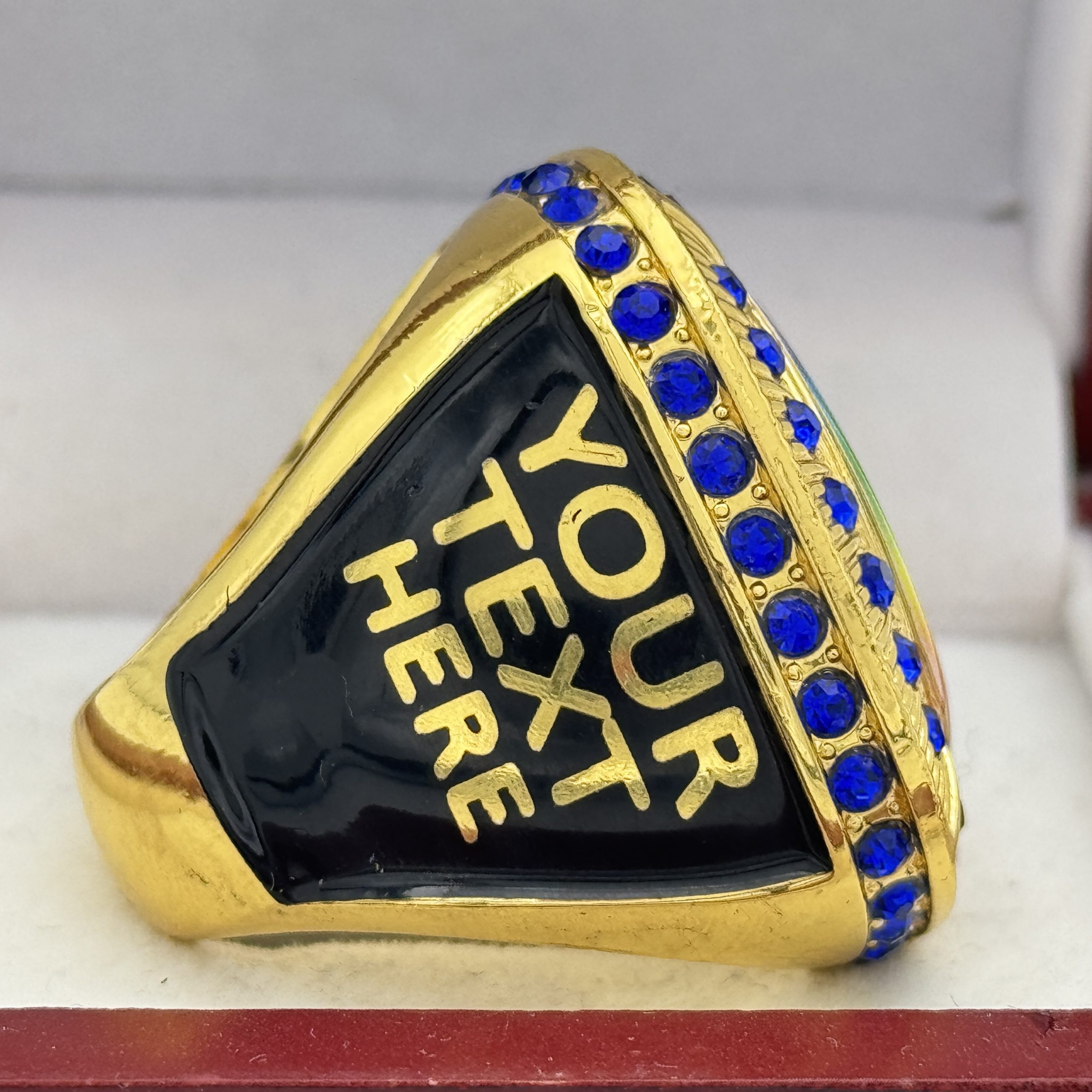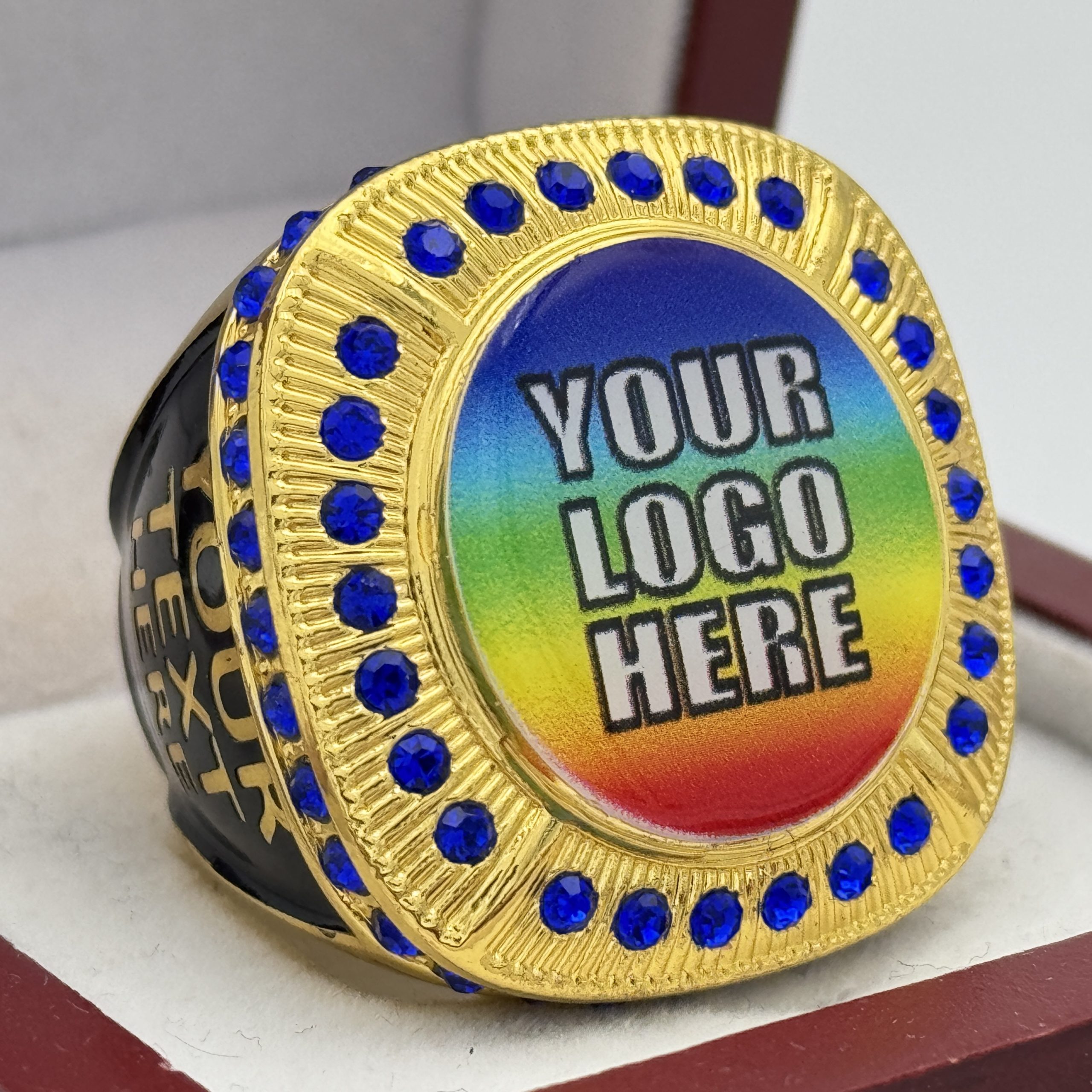 ROUND ADD YOUR LOGO RING — GOLD BODY, BLUE STONES, 2 ENGRAVABLE SIDES (Item #58-196)
