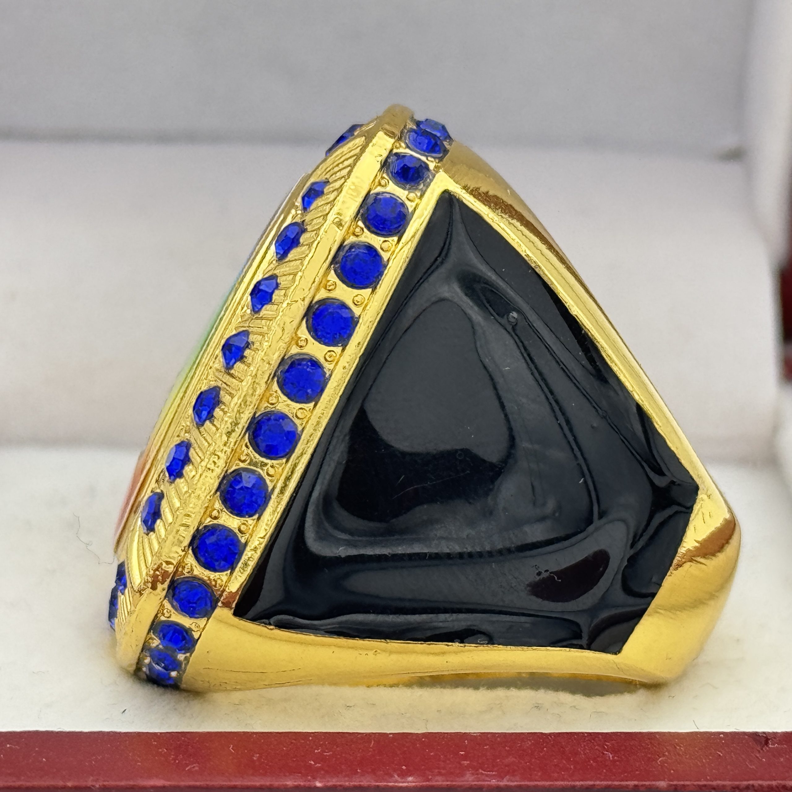 DELUXE HOME PLATE CHAMPION RING — GOLD BODY, BLUE STONES (Item # 57-148)