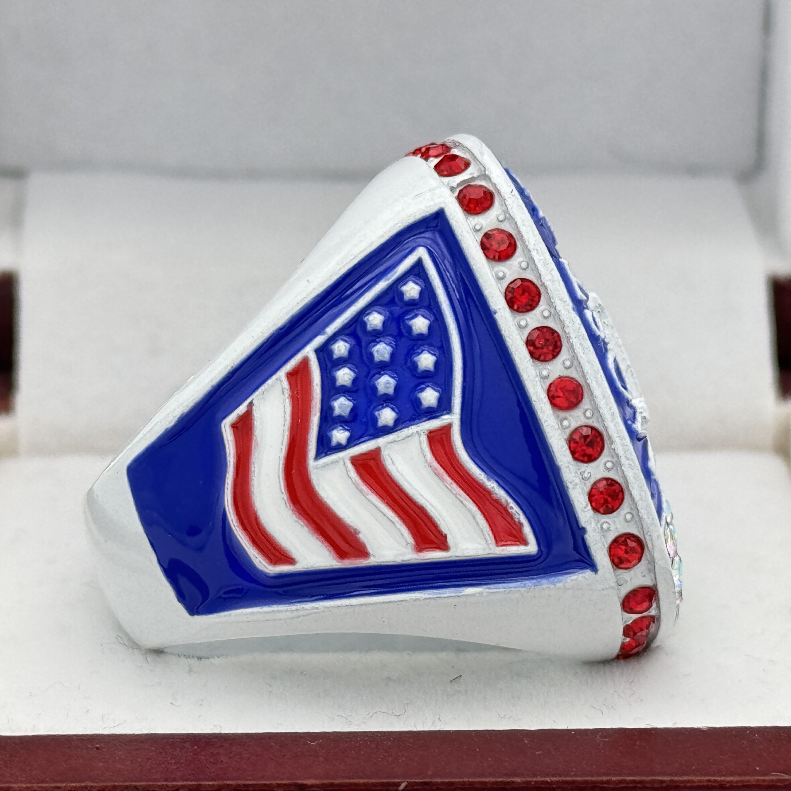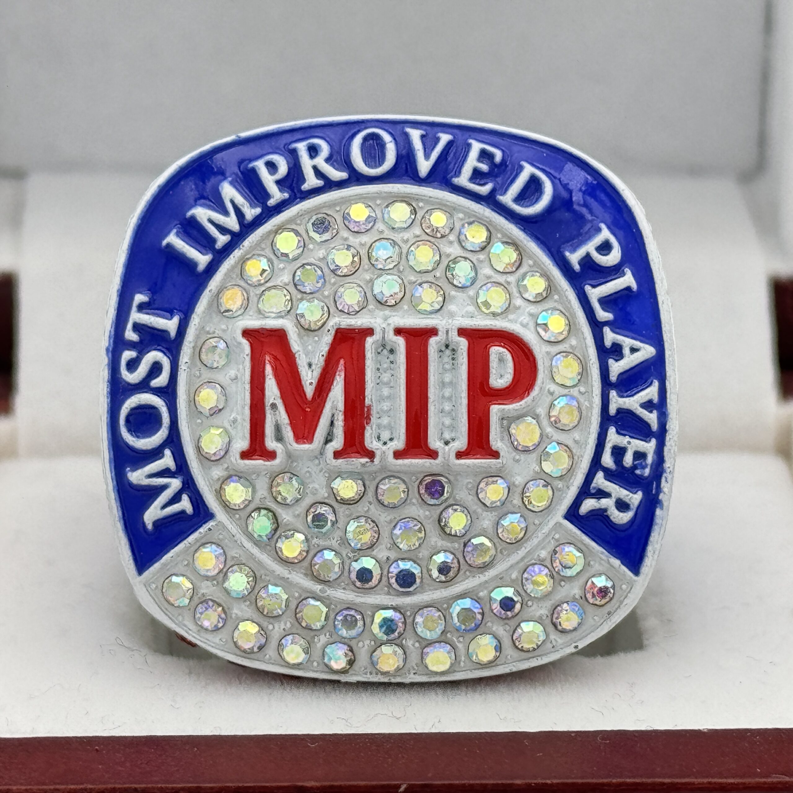 The ring body is white in color. The stones on the side bezel are red in color the stones in the top bezel are prismatic in color. There is blue color paint on the sides of the rings. The left side of the ring shows an American Flag and the right side shows a trophy cup. The top of the ring shows MIP and most improved player on the top.