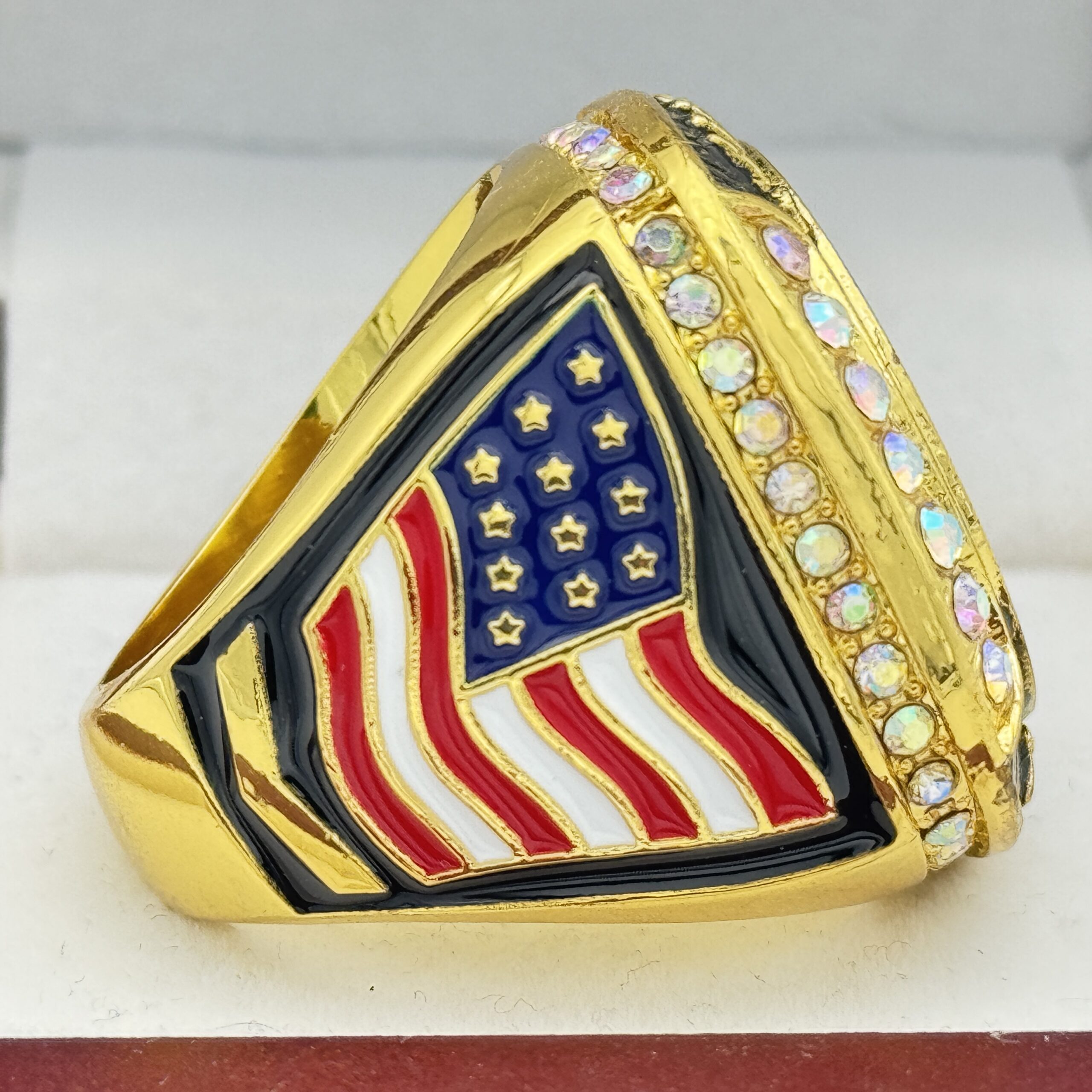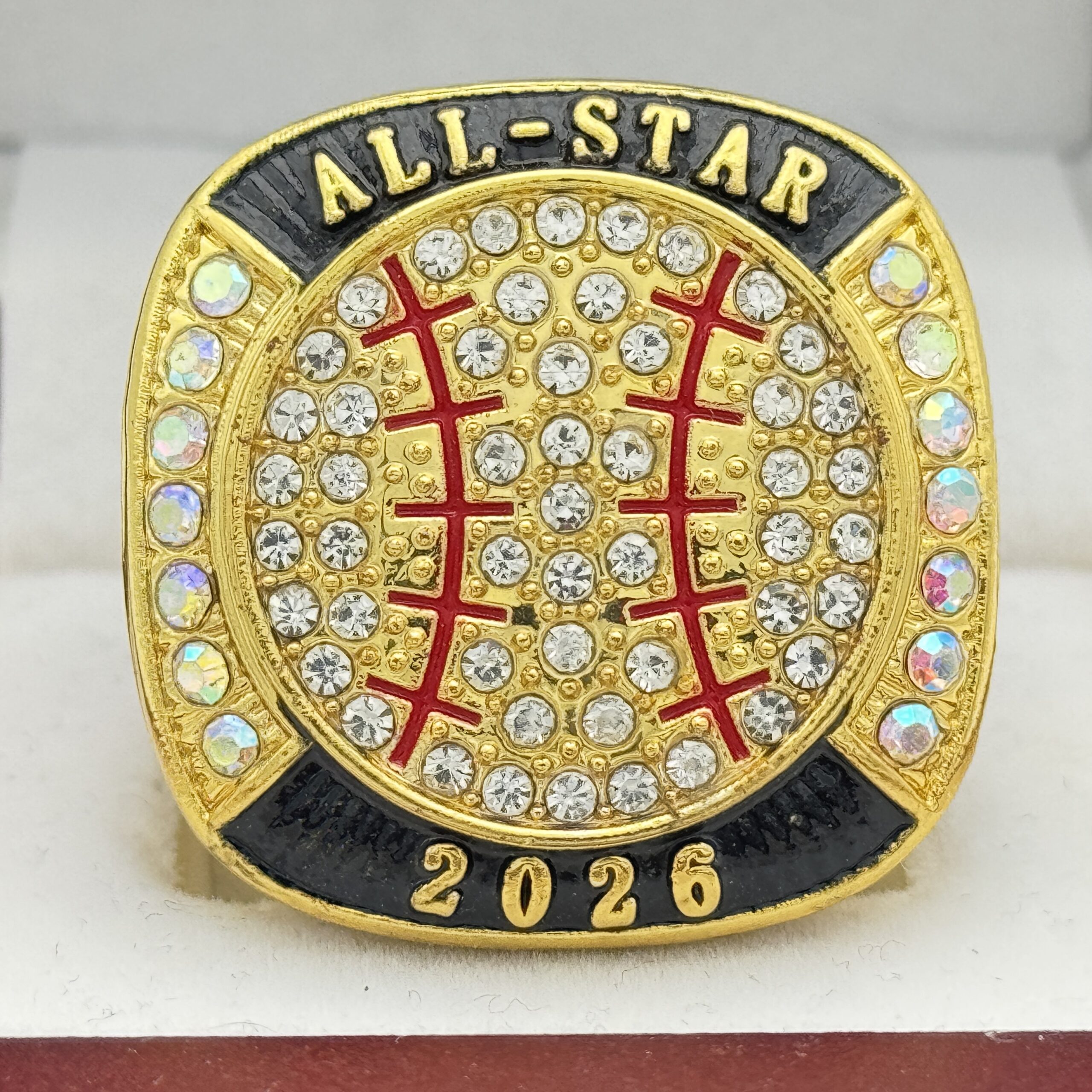This ring is made of a zinc alloy. The ring body is gold in color. The stones on the side bezel are prismatic in color the stones in the top bezel are prismatic in color. There is black color paint on the sides of the rings. The left side of the ring shows an American Flag and the right side shows a ball on top of a base with crossed bats in the background. The top of the ring is a ball with red laces with clear stones and All-Star 2026.