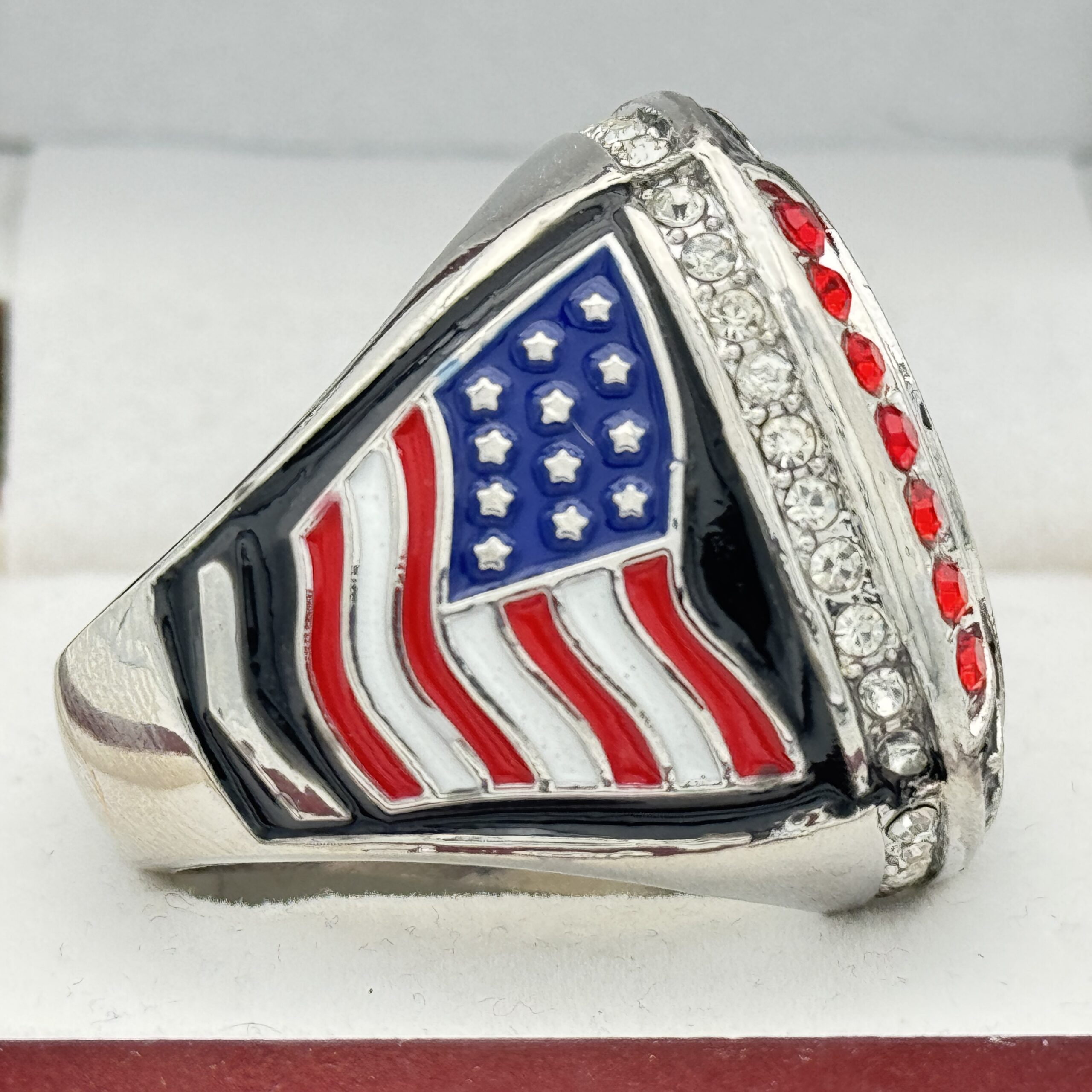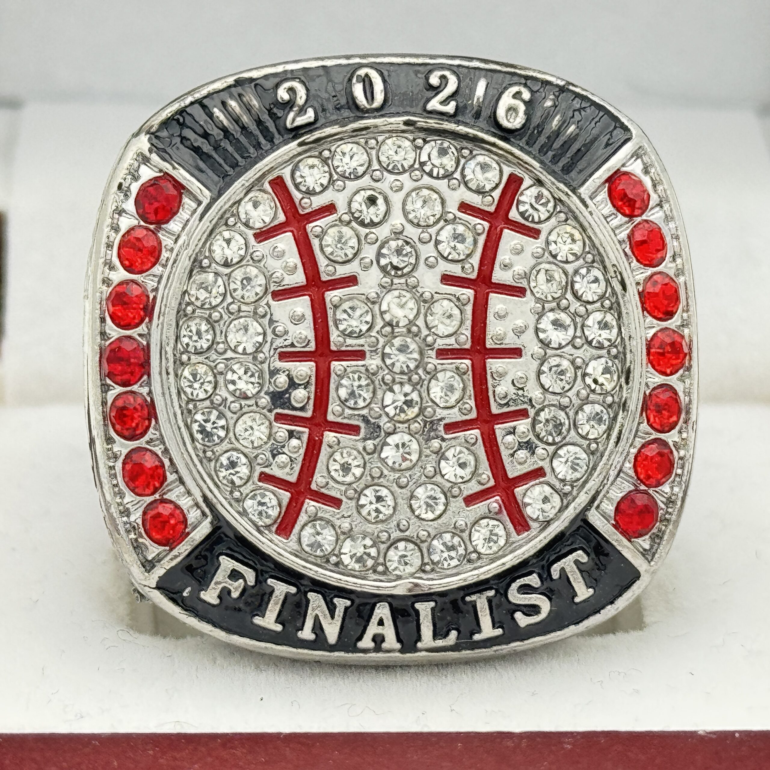 This ring is made of a zinc alloy. The ring body is silver in color. The stones on the side bezel are clear in color the stones in the top bezel are red in color. There is black color paint on the sides of the rings. The left side of the ring shows an American Flag and the right side shows a ball on top of a base with crossed bats in the background. The top of the ring is a ball with red laces with clear stones and 2026 finalist.
