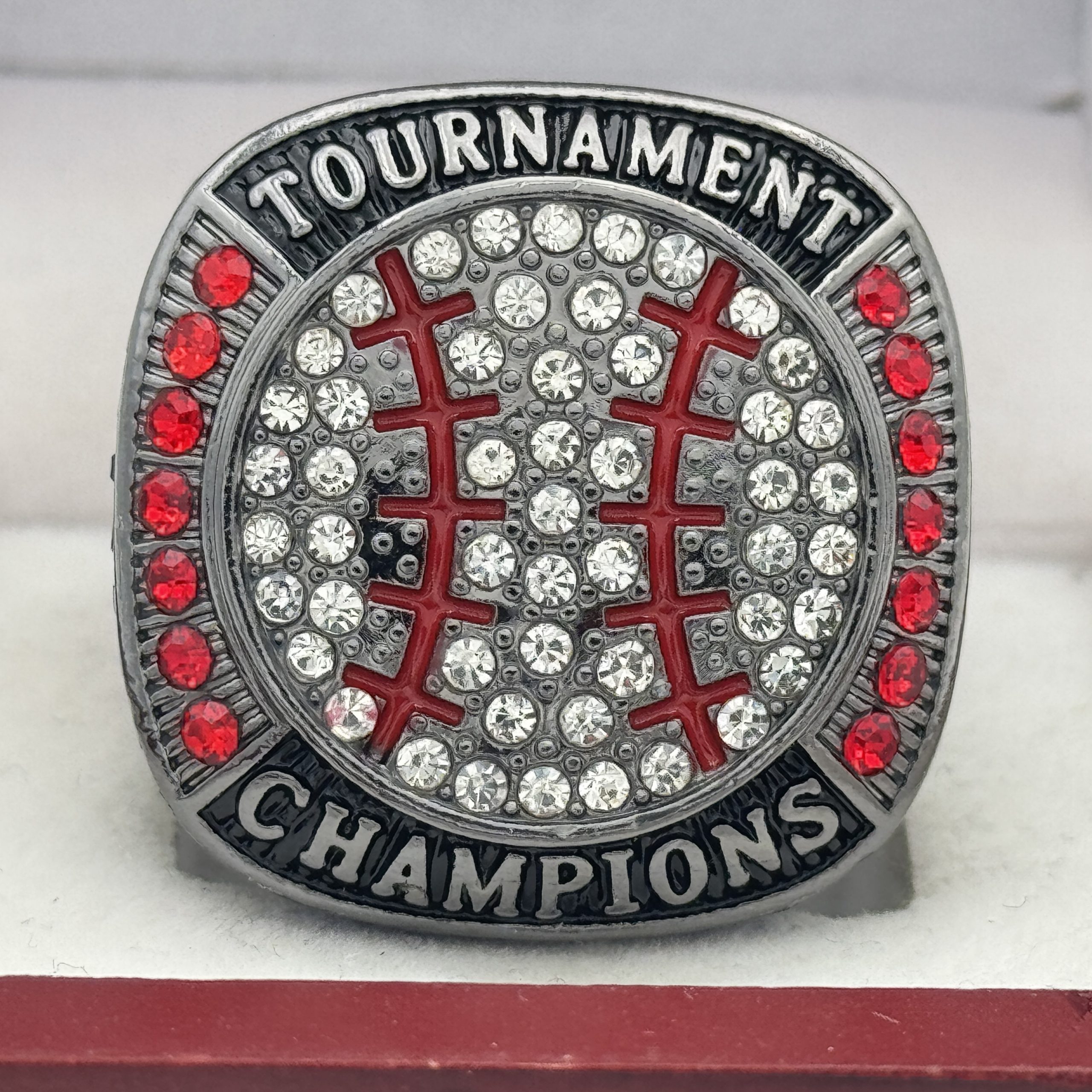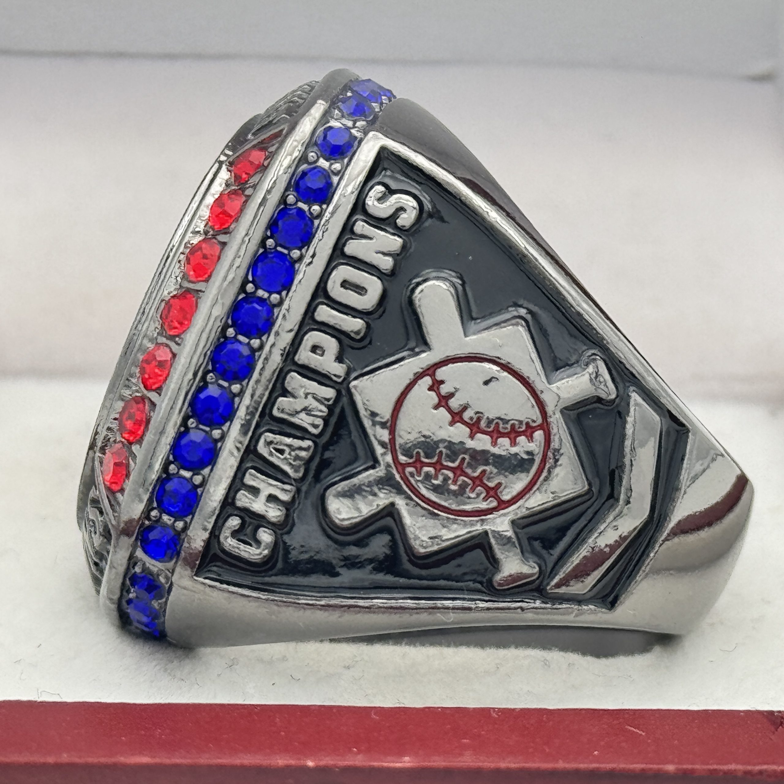 This ring is made of a zinc alloy. The ring body is gun metal in color. The stones on the side bezel are blue in color the stones in the top bezel are red in color. There is BLACK color paint on the sides of the rings. The left side of the ring shows an American Flag and the right side shows a ball on top of a base with crossed bats in the background and the word champions. The top of the ring is a ball with red laces with clear stones and TOURNAMENT champions.