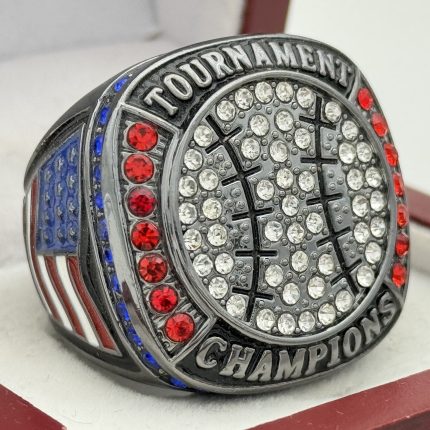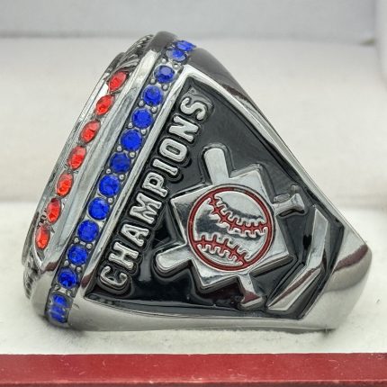 This ring is made of a zinc alloy. The ring body is blue in color. The stones on the side bezel are prismatic in color the stones in the top bezel are prismatic in color. There is white color paint on the sides of the rings. The left side of the ring shows an American Flag and the right side shows a ball on top of a base with crossed bats in the background and the word finalist. The top of the ring is a ball with red laces with prismatic stones and tournament finalist.