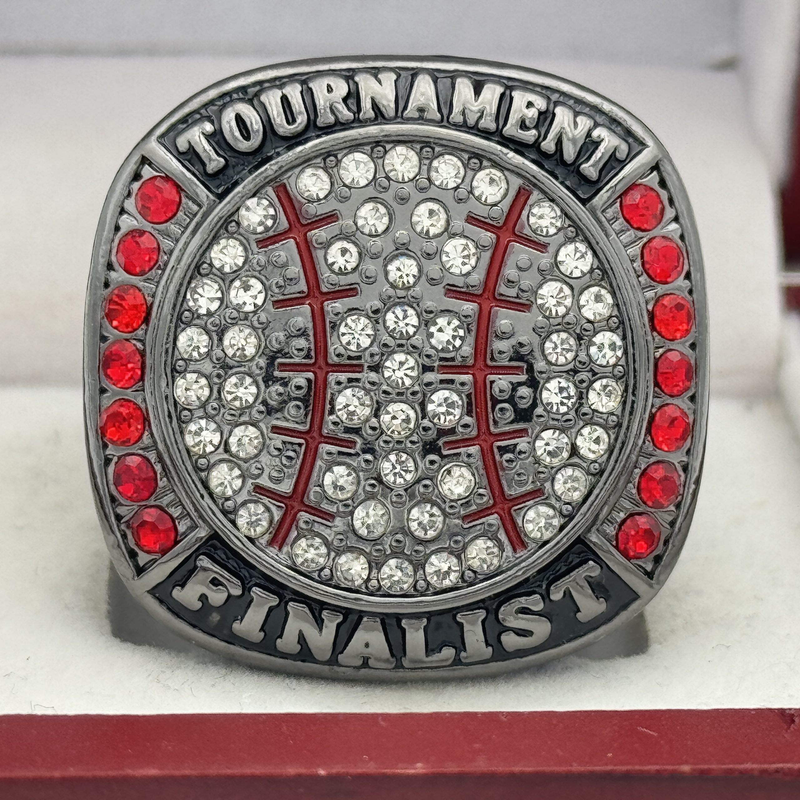 This ring is made of a zinc alloy. The ring body is gun metal in color. The stones on the side bezel are blue in color the stones in the top bezel are red in color. There is BLACK color paint on the sides of the rings. The left side of the ring shows an American Flag and the right side shows a ball on top of a base with crossed bats in the background and the word finalist. The top of the ring is a ball with red laces with clear stones and TOURNAMENT finalist.