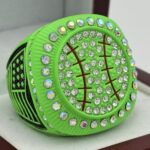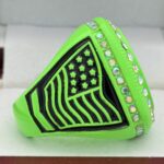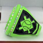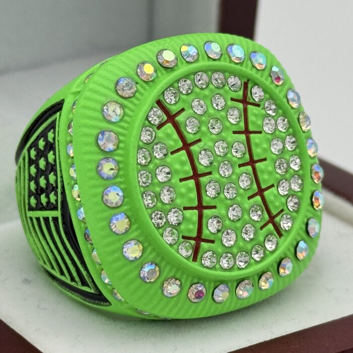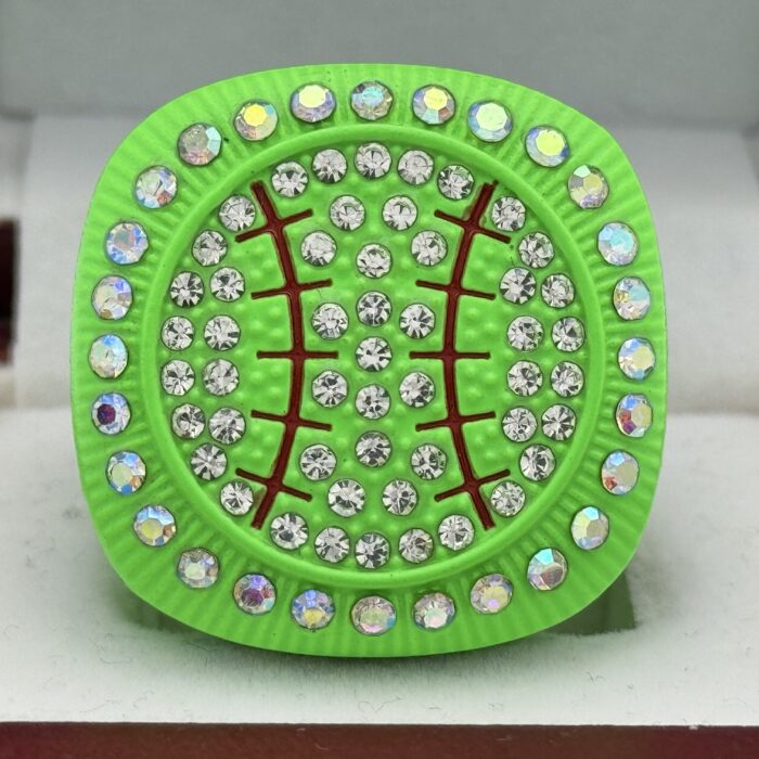 This ring is made of a zinc alloy. The ring body is neon green in color. The stones on the side bezel are prismatic in color the stones in the top bezel are prismatic in color. There is black color paint on the sides of the rings. The left side of the ring shows an American Flag and the right side shows a ball on top of a base with crossed bats in the background. The top of the ring is a ball with red laces with clear stones.