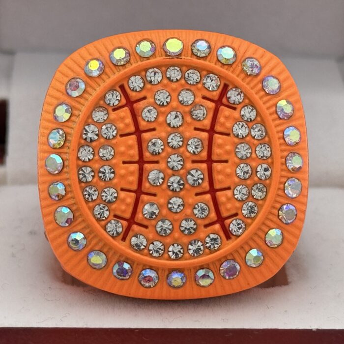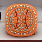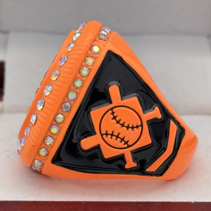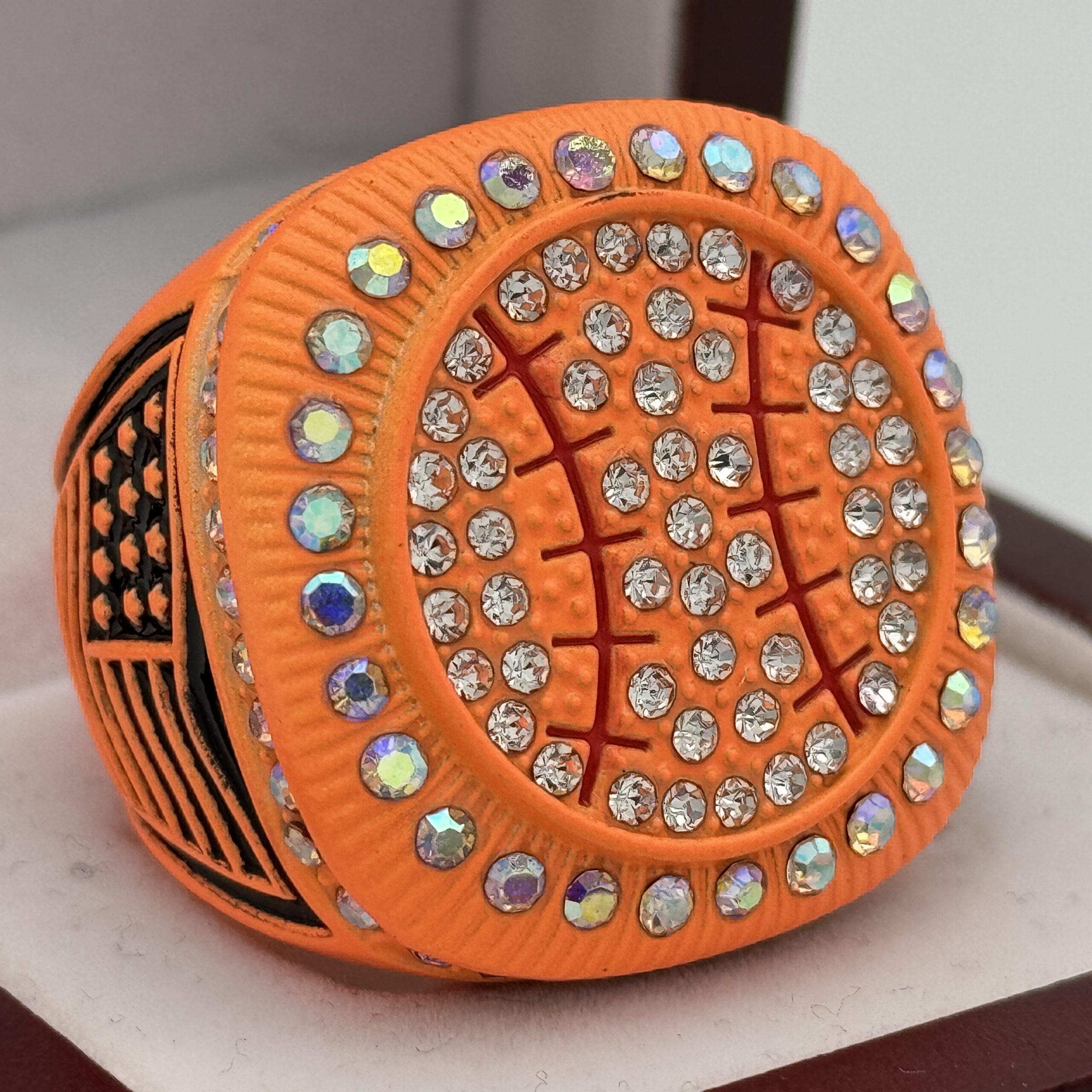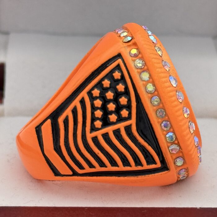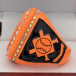 This ring is made of a zinc alloy. The ring body is neon orange in color. The stones on the side bezel are prismatic in color the stones in the top bezel are prismatic in color. There is black color paint on the sides of the rings. The left side of the ring shows an American Flag and the right side shows a ball on top of a base with crossed bats in the background. The top of the ring is a ball with red laces with clear stones.