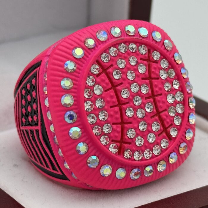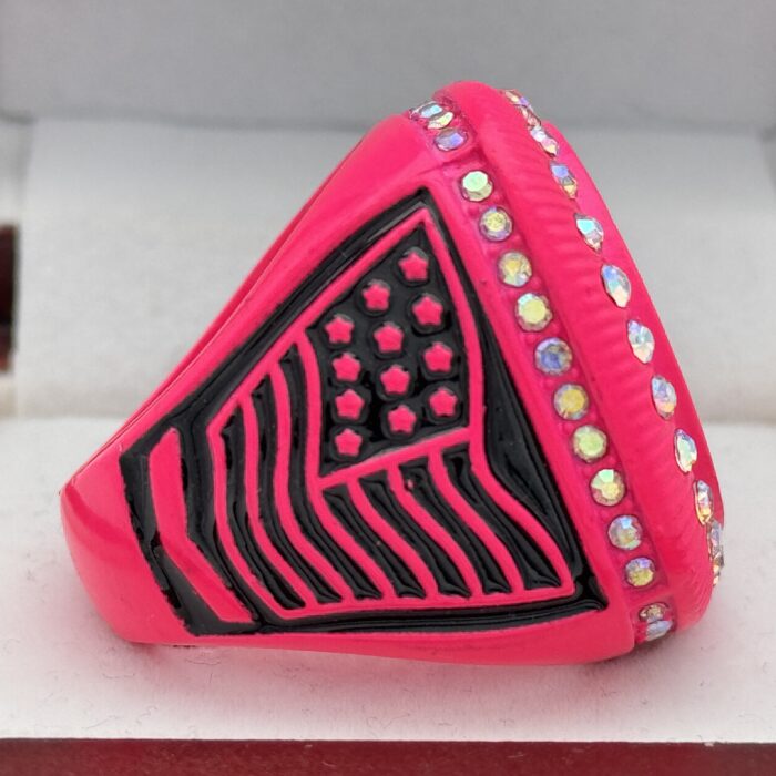 This ring is made of a zinc alloy. The ring body is neon pink in color. The stones on the side bezel are prismatic in color the stones in the top bezel are prismatic in color. There is black color paint on the sides of the rings. The left side of the ring shows an American Flag and the right side shows a ball on top of a base with crossed bats in the background. The top of the ring is a ball with red laces with clear stones.
