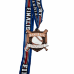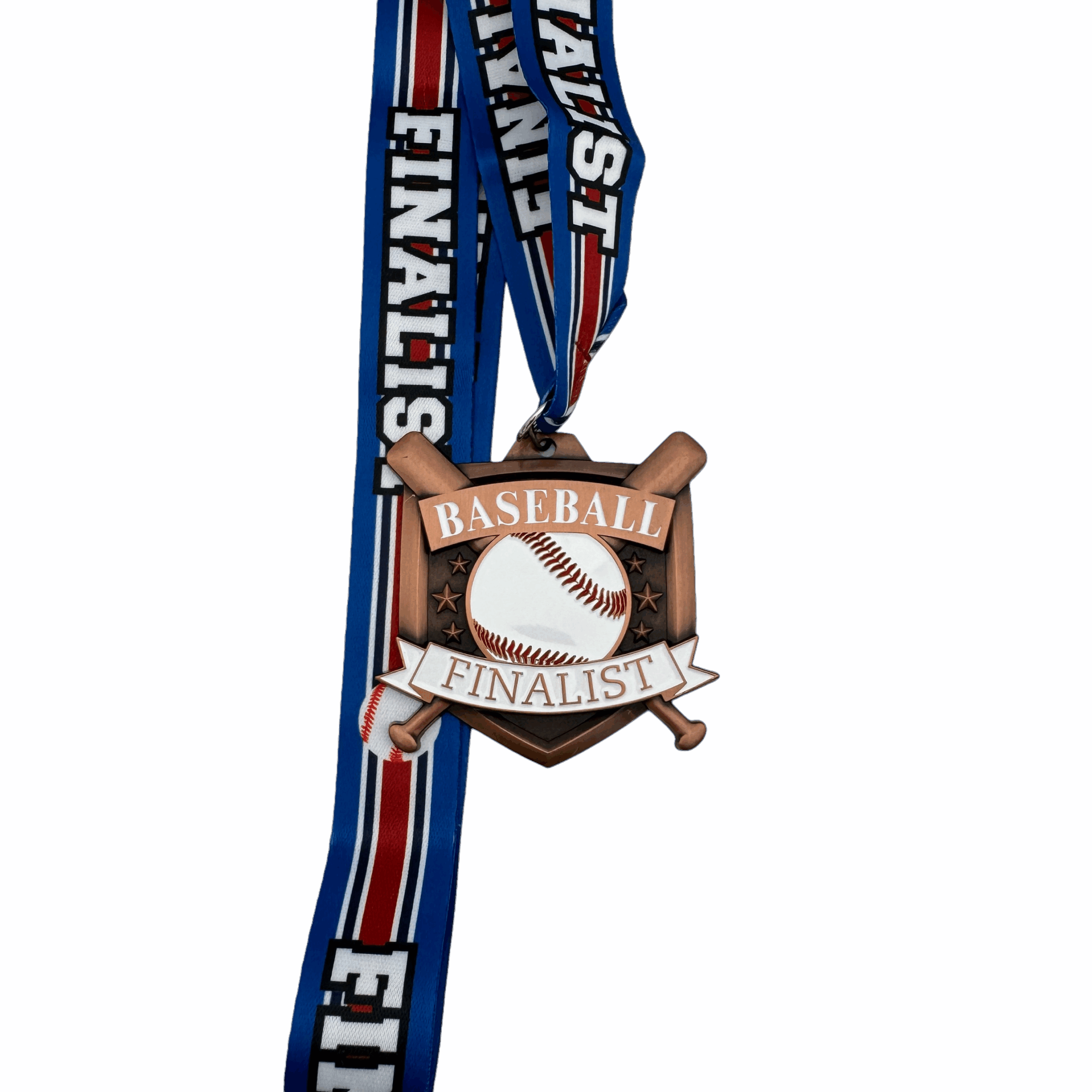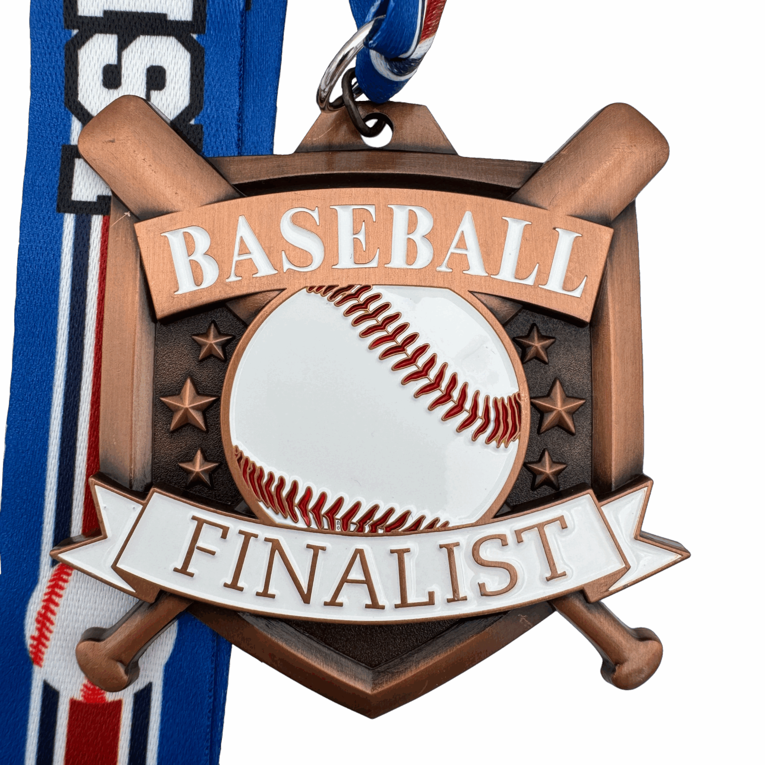 All of our medals are made of a zinc alloy. This medal is 2.75″ by 2.75″ with an 18″ ribbon. These medals are bronze in color and say baseball finalist with a painted ball and background. The ribbon is blue with red and white stripes with the word finalist and an image of a baseball.