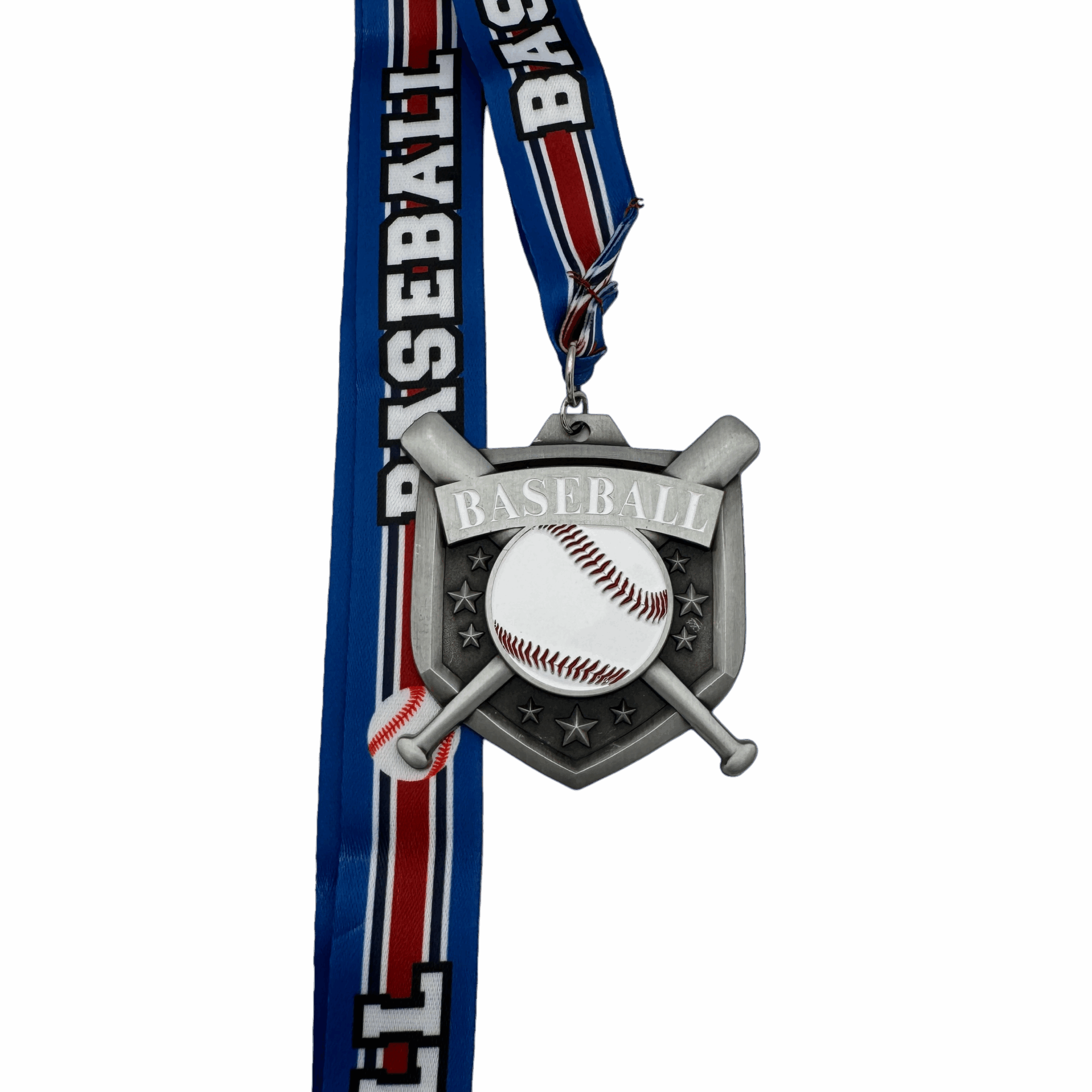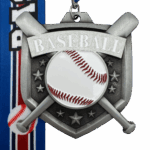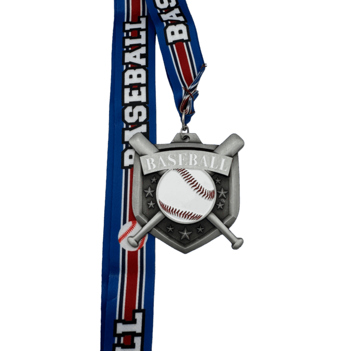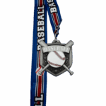 All of our medals are made of a zinc alloy. This medal is 2.75″ by 2.75″ with an 18″ ribbon. These medals are silver in color and say baseball with a painted ball and background. The ribbon is blue with red and white stripes with the word baseball and an image of a baseball.