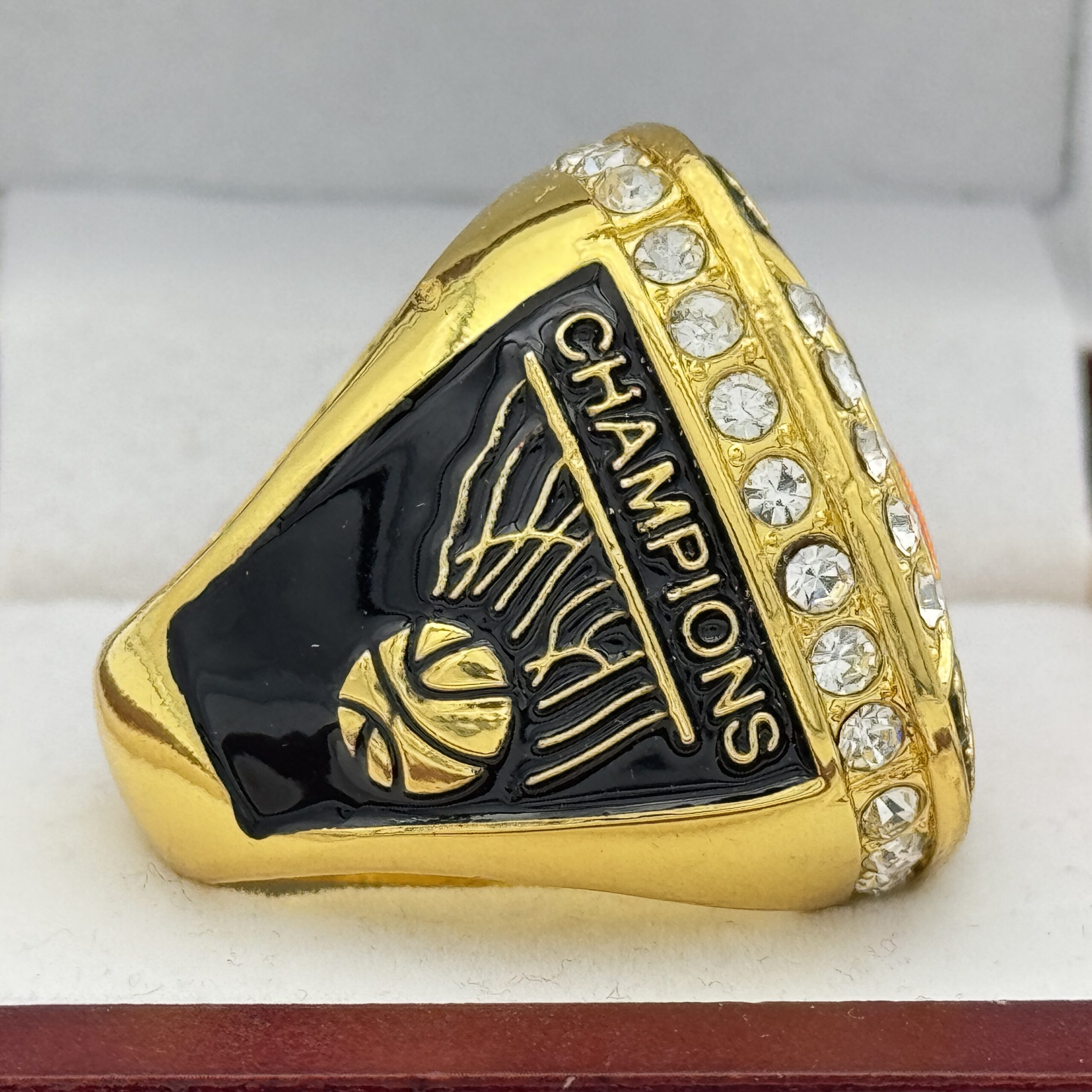 This ring is made of a zinc alloy. The ring body is gold in color. There is black paint on the sides of the ring. The side bezel has clear stones and the top bezel has clear stones. The left side of the ring shows a basketball on a trophy cup and the right side is a net. The top of the ring shows a painted basketball and 2026 Champions.