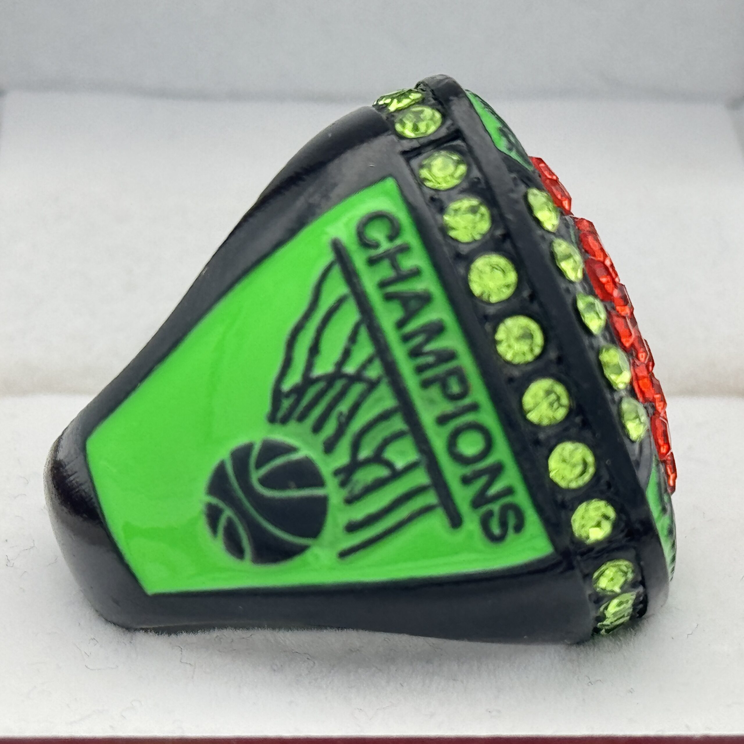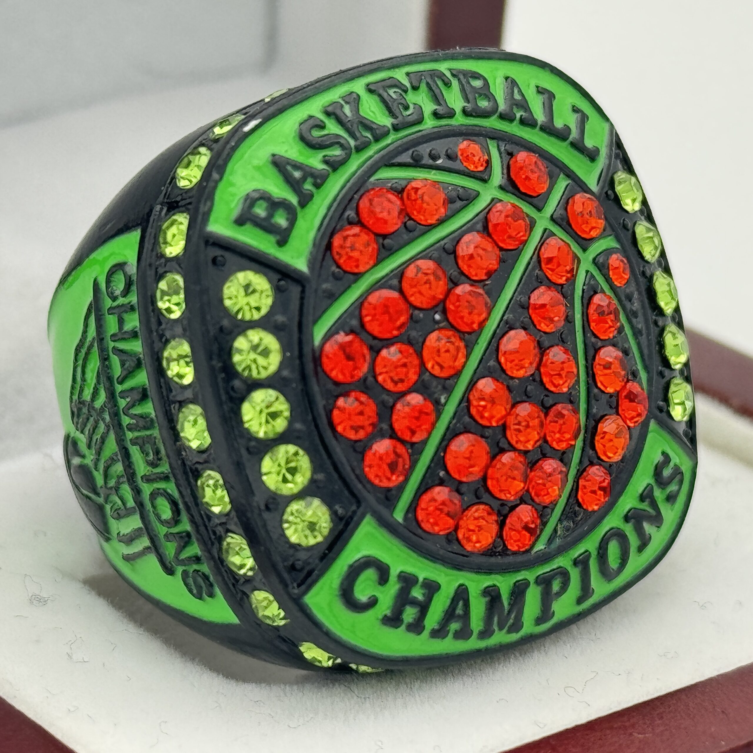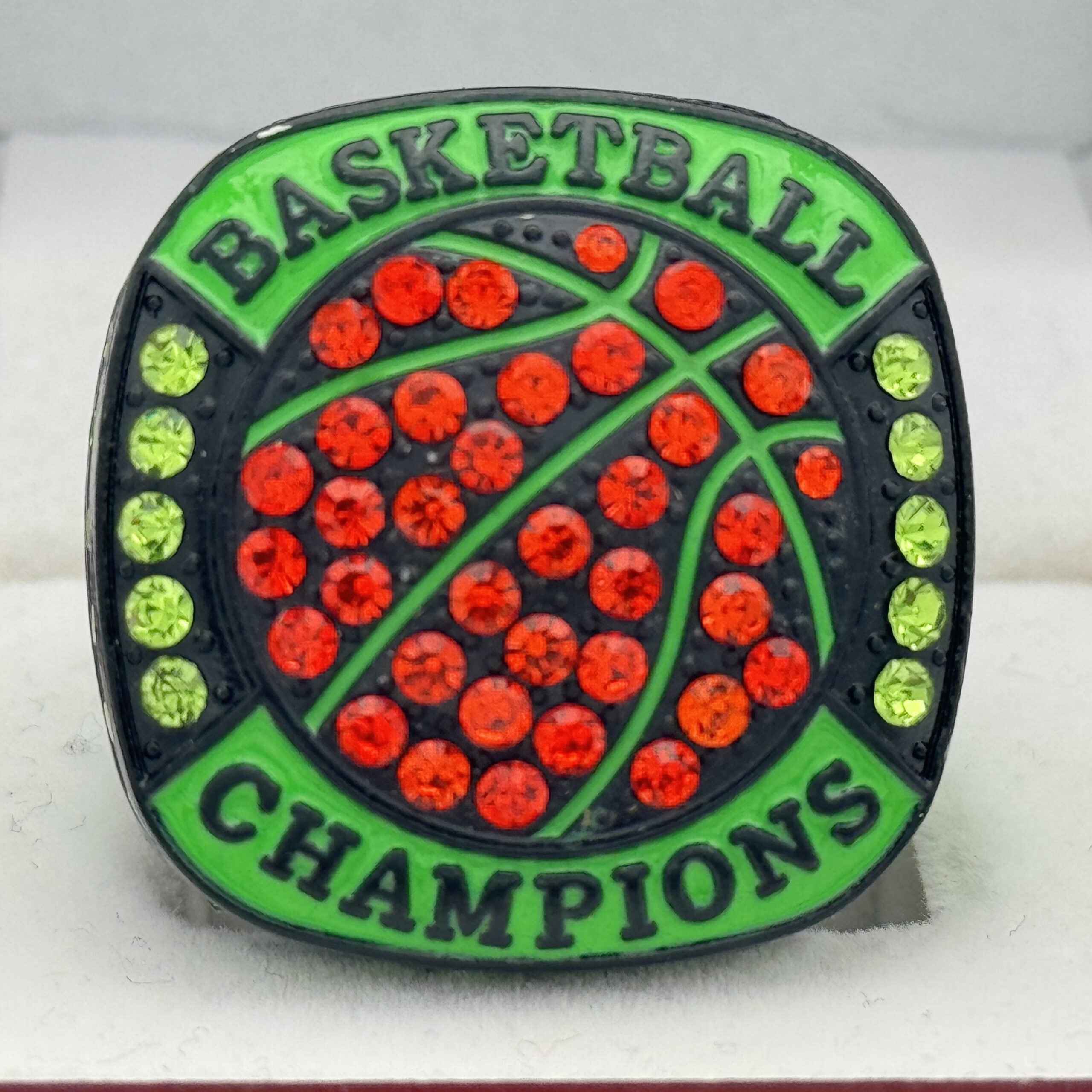 This ring is made of a zinc alloy. The ring body is black in color and the side bezel has green colored stones. There is green paint on the sides and top of the rings. The left side of the ring shows a basketball going through a net and champions the right side shows a trophy with a basketball on top. The top of the ring shows a basketball with orange stones and Basketball champions.