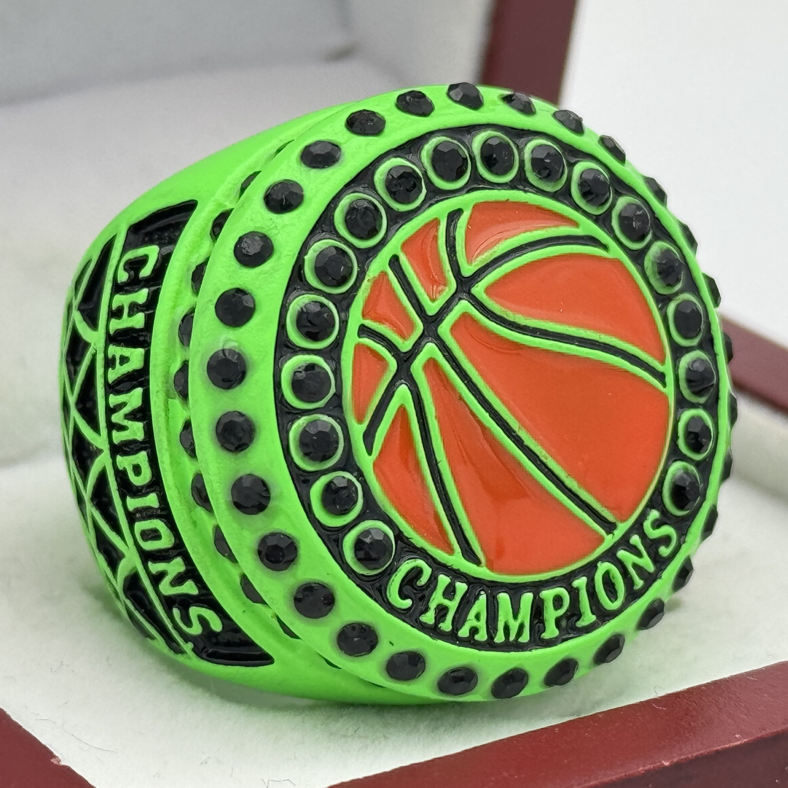 This ring is made of a zinc alloy. The ring body is neon green in color and the side bezel has black colored stones. There is black paint on the sides and top of the rings. The left side of the ring shows a basketball net and Champions the right side shows a trophy with a basketball on top. The top of the ring shows a basketball with orange paint and champions.