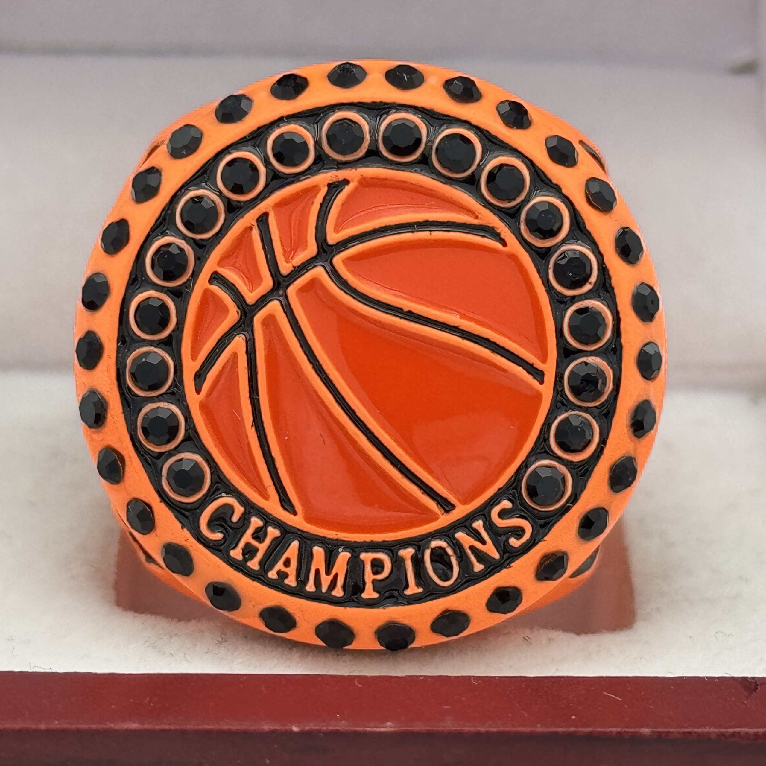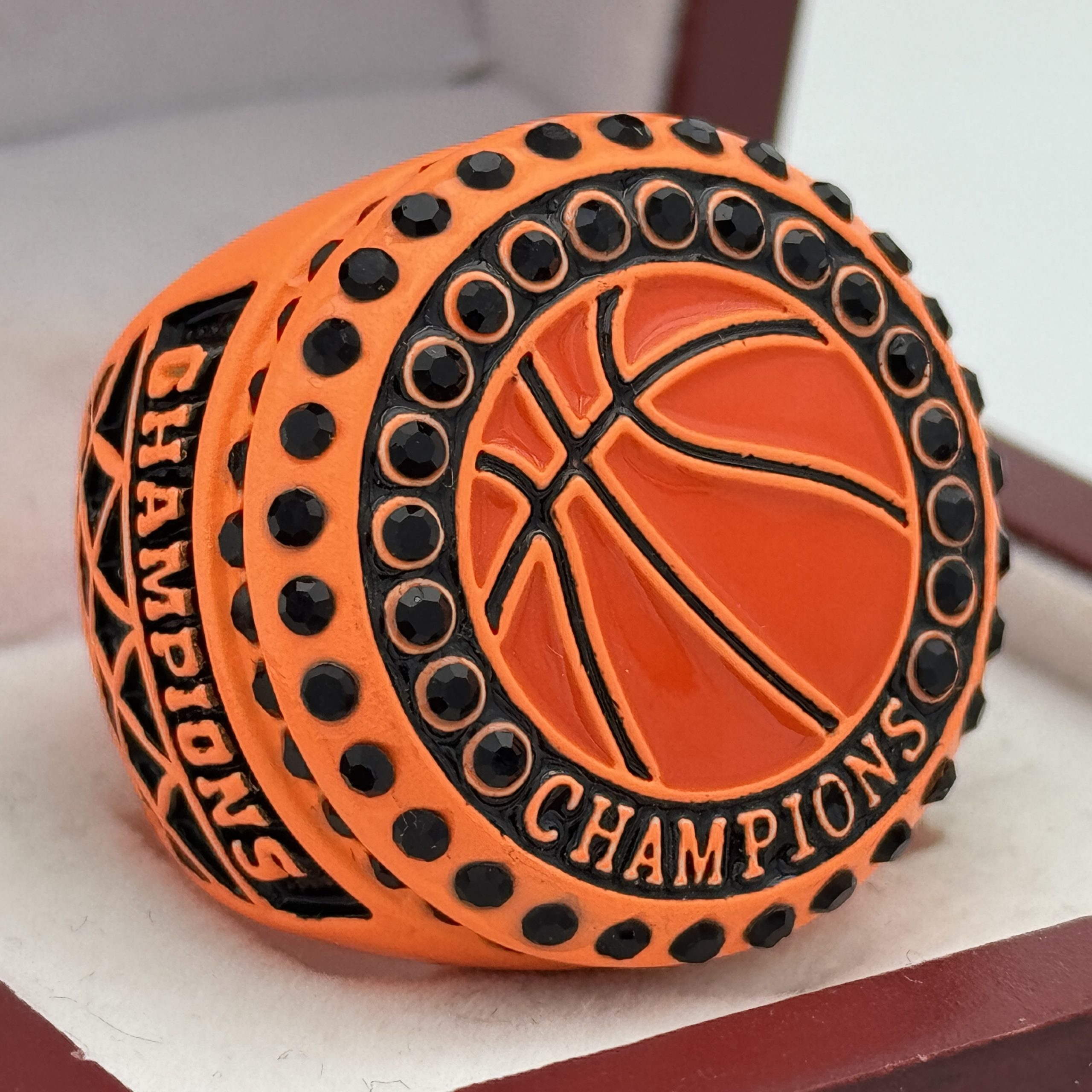 This ring is made of a zinc alloy. The ring body is neon orange in color and the side bezel has black colored stones. There is black paint on the sides and top of the rings. The left side of the ring shows a basketball net and Champions the right side shows a trophy with a basketball on top. The top of the ring shows a basketball with orange paint and champions.