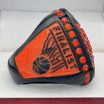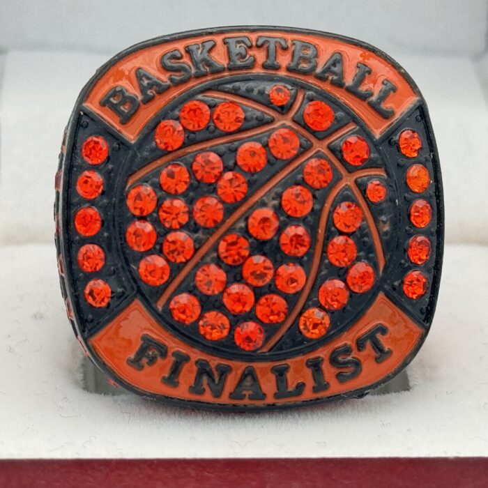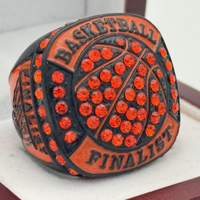 This ring is made of a zinc alloy. The ring body is black in color and the side bezel has orange colored stones. There is orange paint on the sides and top of the rings. The left side of the ring shows a basketball going through a net and finalist the right side shows a trophy with a basketball on top. The top of the ring shows a basketball with orange stones and Basketball finalist.