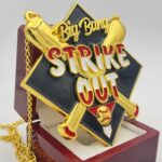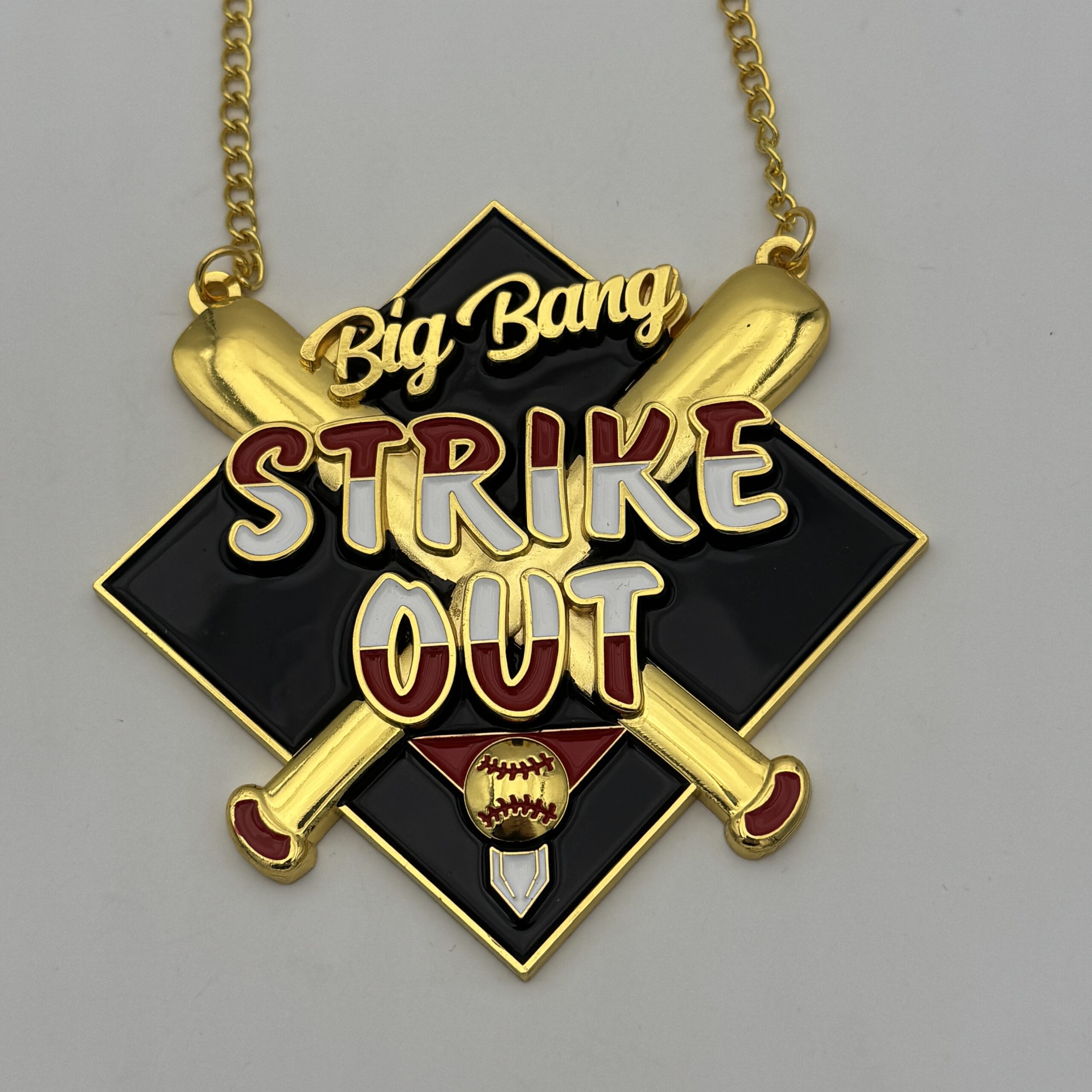 All of our medals are made of a zinc alloy. These medals are gold and black in color and say Big Bang Strike Out on top of cross bats. The chain is gold in color.Â
