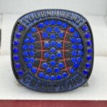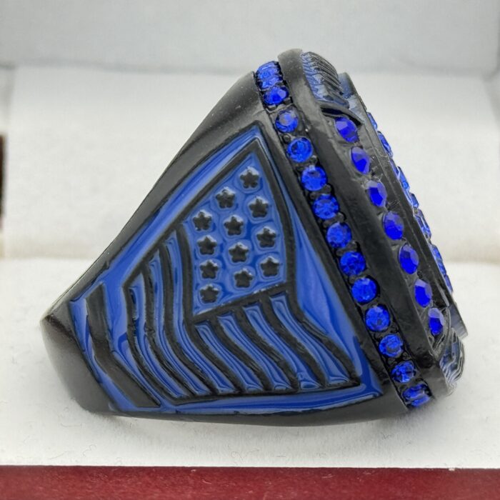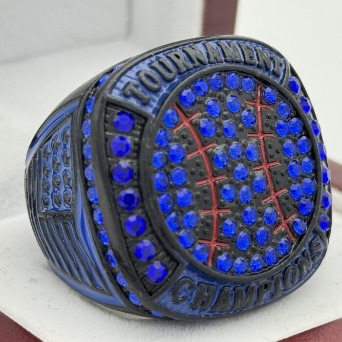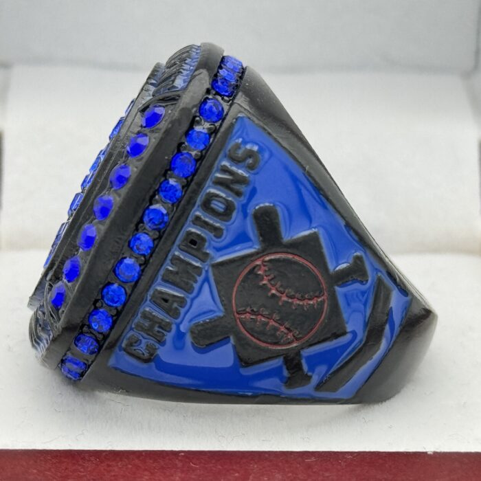This ring is made of a zinc alloy. The ring body is black in color. The stones on the side bezel are blue in color the stones in the top bezel are blue in color. There is blue color paint on the sides of the rings. The left side of the ring shows an American Flag and the right side shows a ball on top of a base with crossed bats in the background and champions. The top of the ring is a ball with red laces with blue stones and tournament champions.
