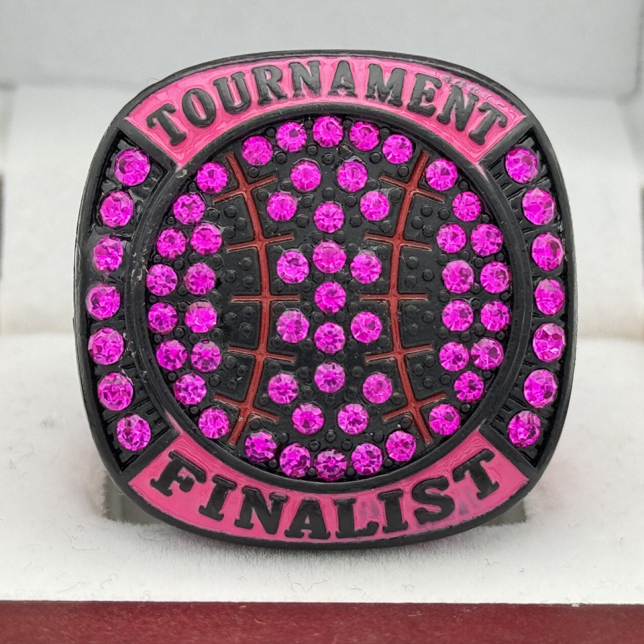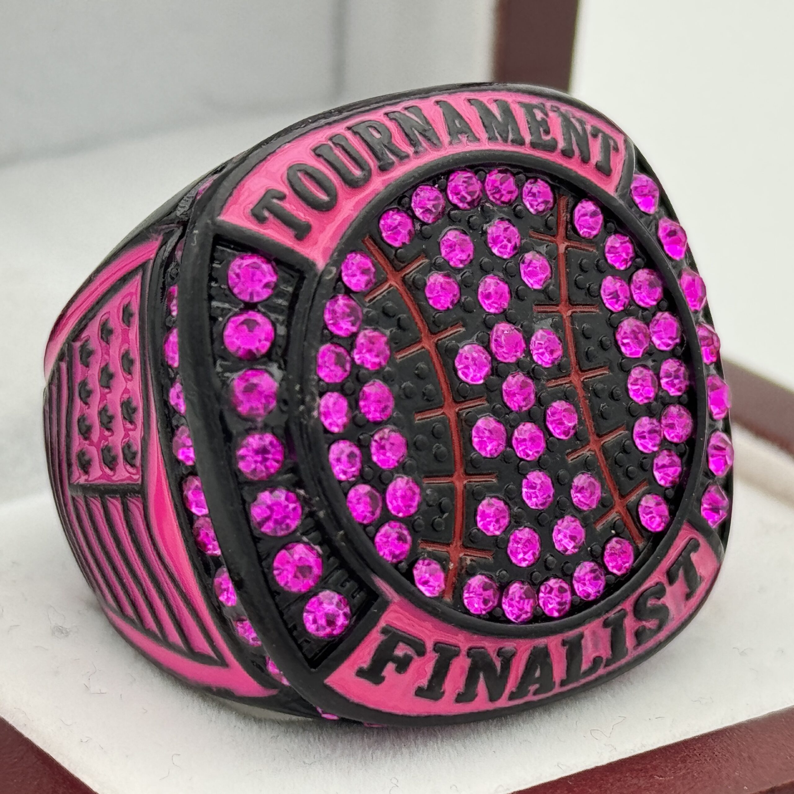 This ring is made of a zinc alloy. The ring body is black in color. The stones on the side bezel are pink in color the stones in the top bezel are pink in color. There is pink color paint on the sides of the rings. The left side of the ring shows an American Flag and the right side shows a ball on top of a base with crossed bats in the background and finalist. The top of the ring is a ball with red laces with pink stones and tournament finalist.