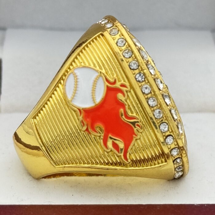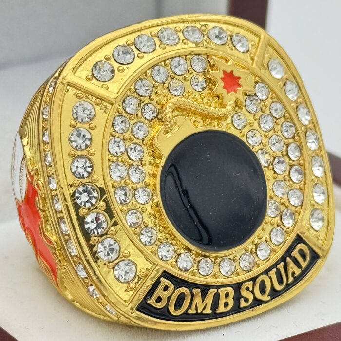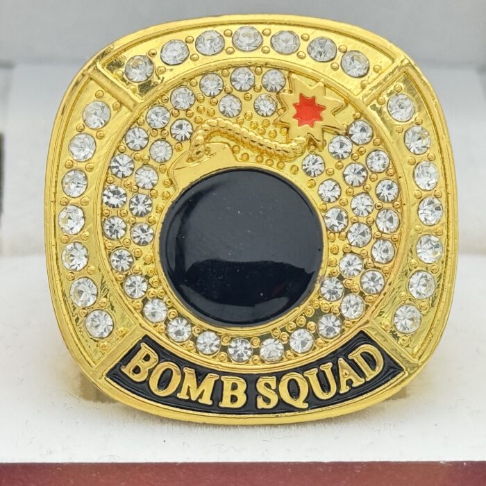 This ring is gold in color. There are clear stones on the side bezel. There are clear stones on the top bezel. There is no paint on the sides of the ring. The left side of the ring shows a baseball with a fire trail and the right side of the ring shows an explosion. The top of the ring shows a bomb with a lit fuse and says bomb squad.