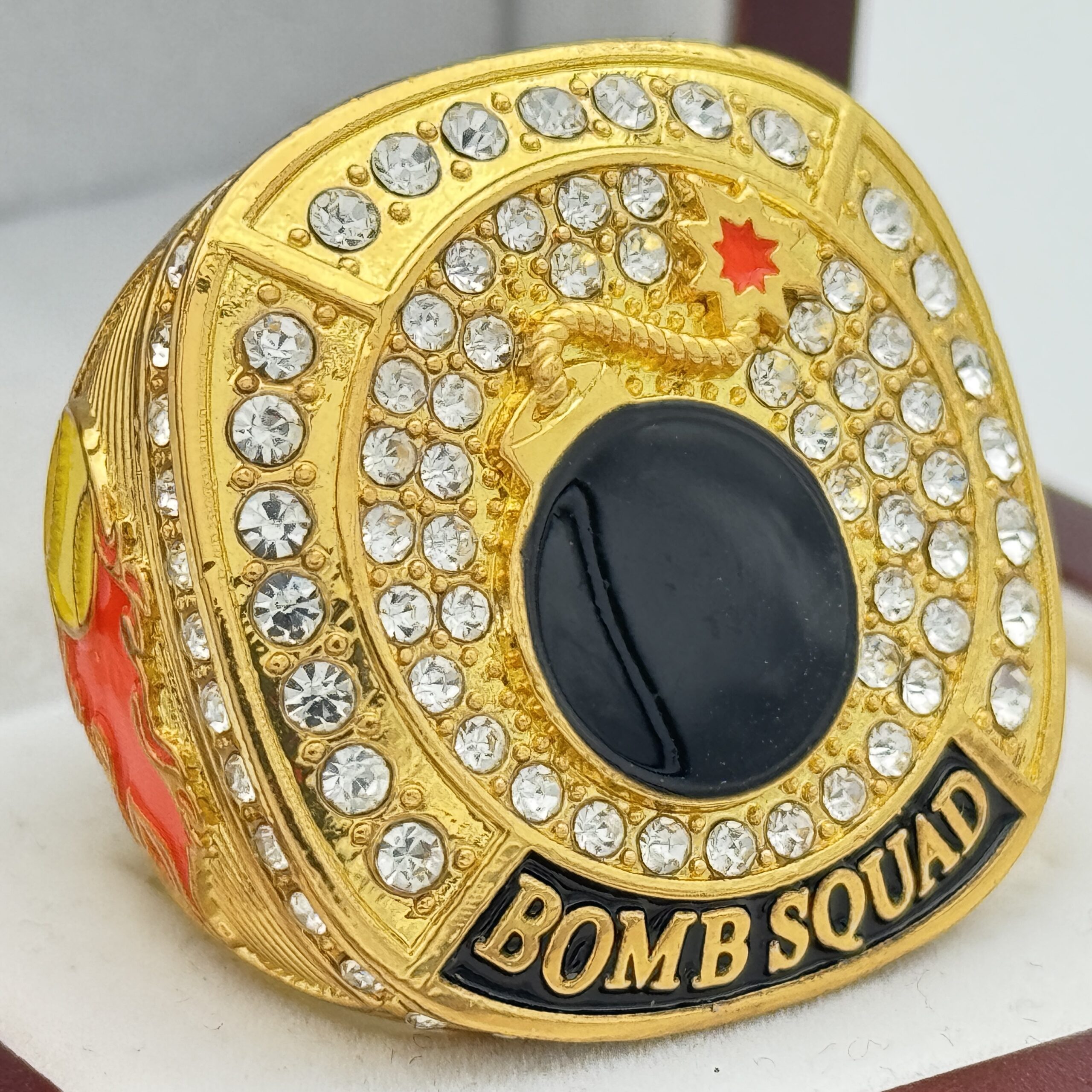 This ring is gold in color. There are clear stones on the side bezel. There are clear stones on the top bezel. There is no paint on the sides of the ring. The left side of the ring shows a softball with a fire trail and the right side of the ring shows an explosion. The top of the ring shows a bomb with a lit fuse and says bomb squad.