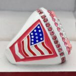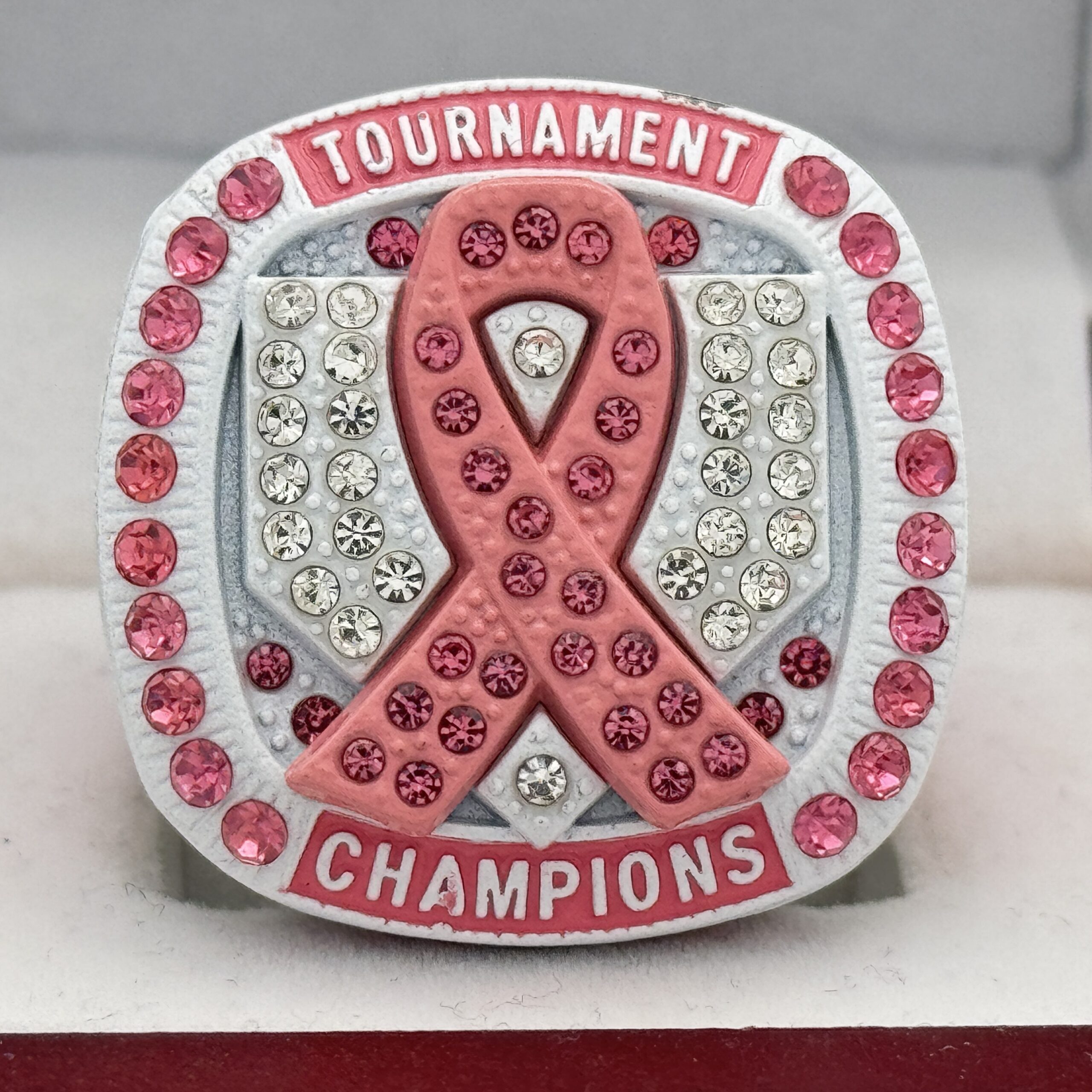 This ring is made of a zinc alloy. The ring body is white in color. The stones on the side bezel are pink in color the stones in the top bezel are pink in color. There is pink paint on the tops and sides of the rings. The left side of the ring shows an American Flag and the right side shows a glove with crossed bats in the background. The top of the ring shows a home plate with a breast cancer awareness ribbon and tournament champions on the top.
