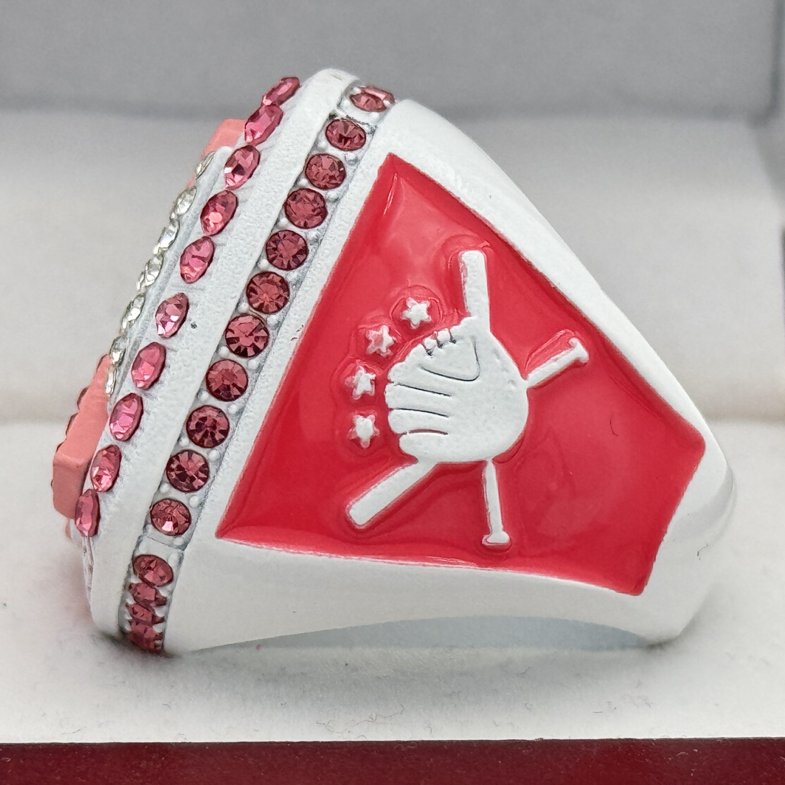 CANCER RIBBON HOME PLATE FINALIST RING --- WHITE BODY, PINK STONES, PINK SIDES, SOFTBALL/BASEBALL (Item #34-117)