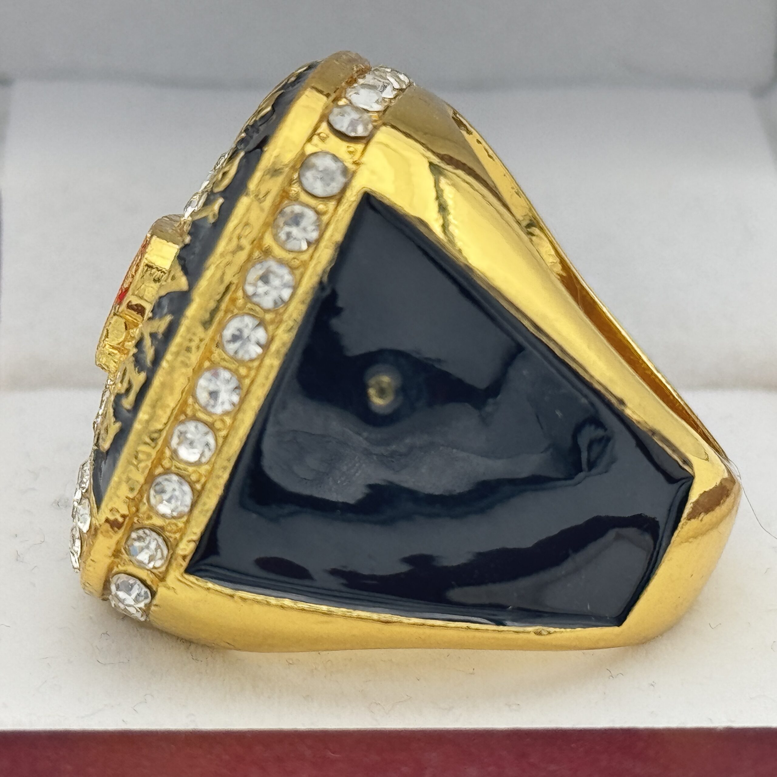 This ring is made of a zinc alloy. The ring body is GOLD in color. The stones on the side bezel are CLEAR in color the stones in the top bezel are CLEAR in color. There is BLACK color paint on the sides of the rings. The left side of the ring is blank for customization and the right side is blank for customization. The top of the ring shows MVP and Most valuable Player