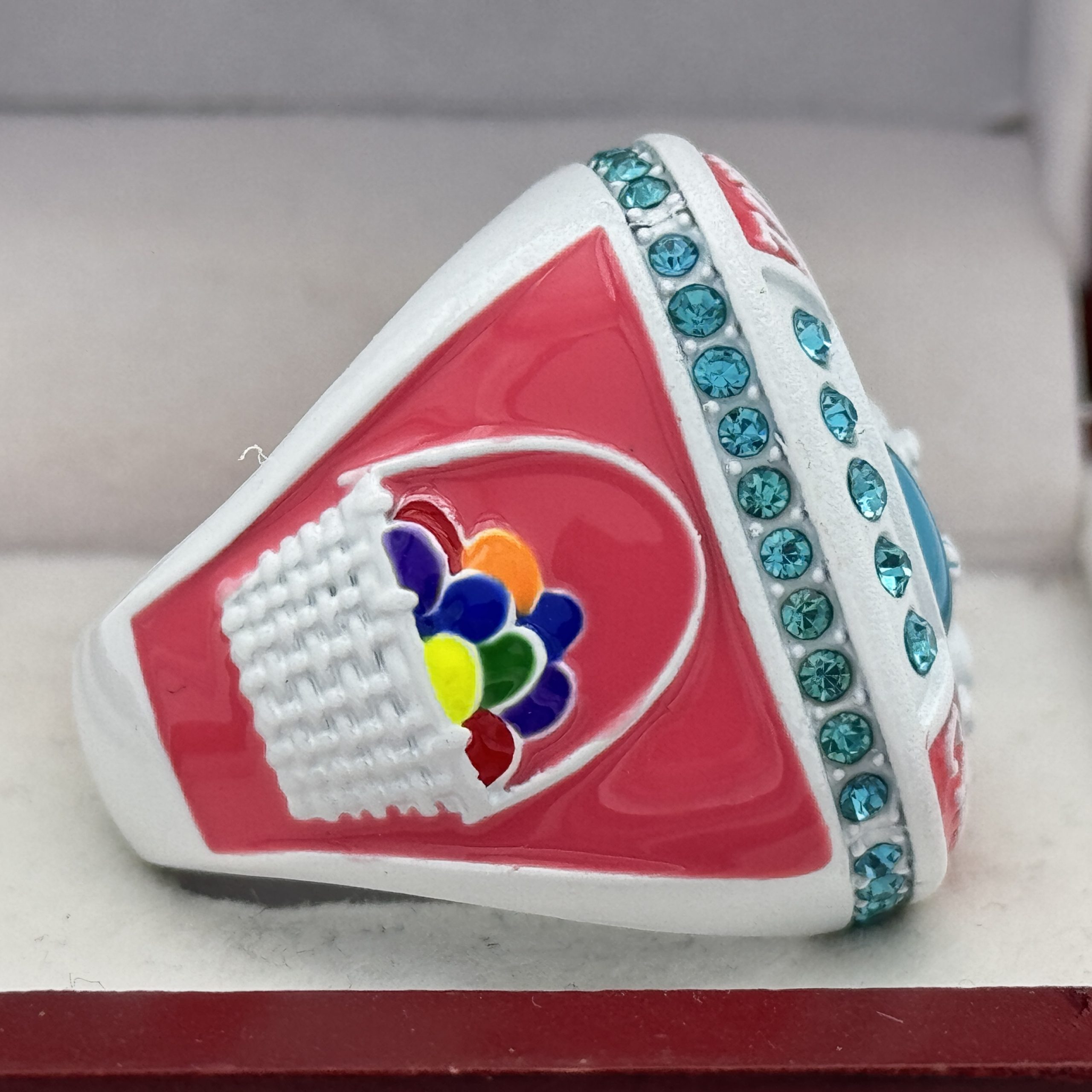 This ring is made of a zinc alloy. The ring body is white in color. The stones on the side bezel are blue and the stones in the top bezels are blue in color. There is pink paint on the sides of the rings. The left side of the ring shows an easter basket full of eggs and the right side shows an egg with bunny ears. The top of the ring shows a bunny holding an easter egg and says tournament champions.