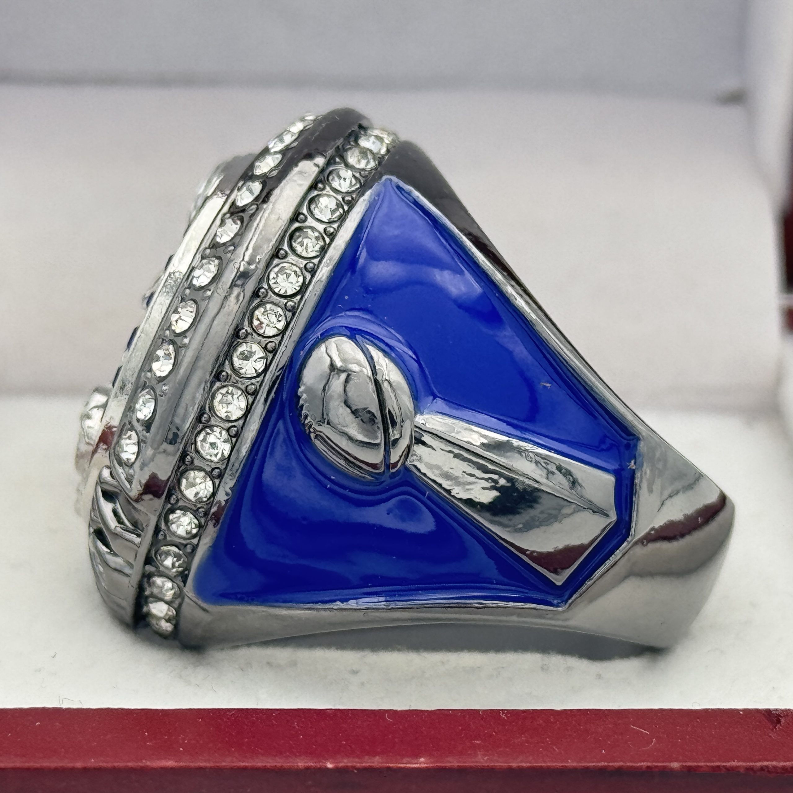 This ring is made of a zinc alloy. The ring body is gun metal in color. The stones on the side bezel are clear in color and the stones in the top bezels are clear in color. The sides have blue paint. The left side shows a player running and the right side shows a LOMBARDI inspired trophy. The top of the ring shows a player gripping a football in front of the Lombardi trophy surrounded by blue stone. The top of the ring says finalist.