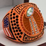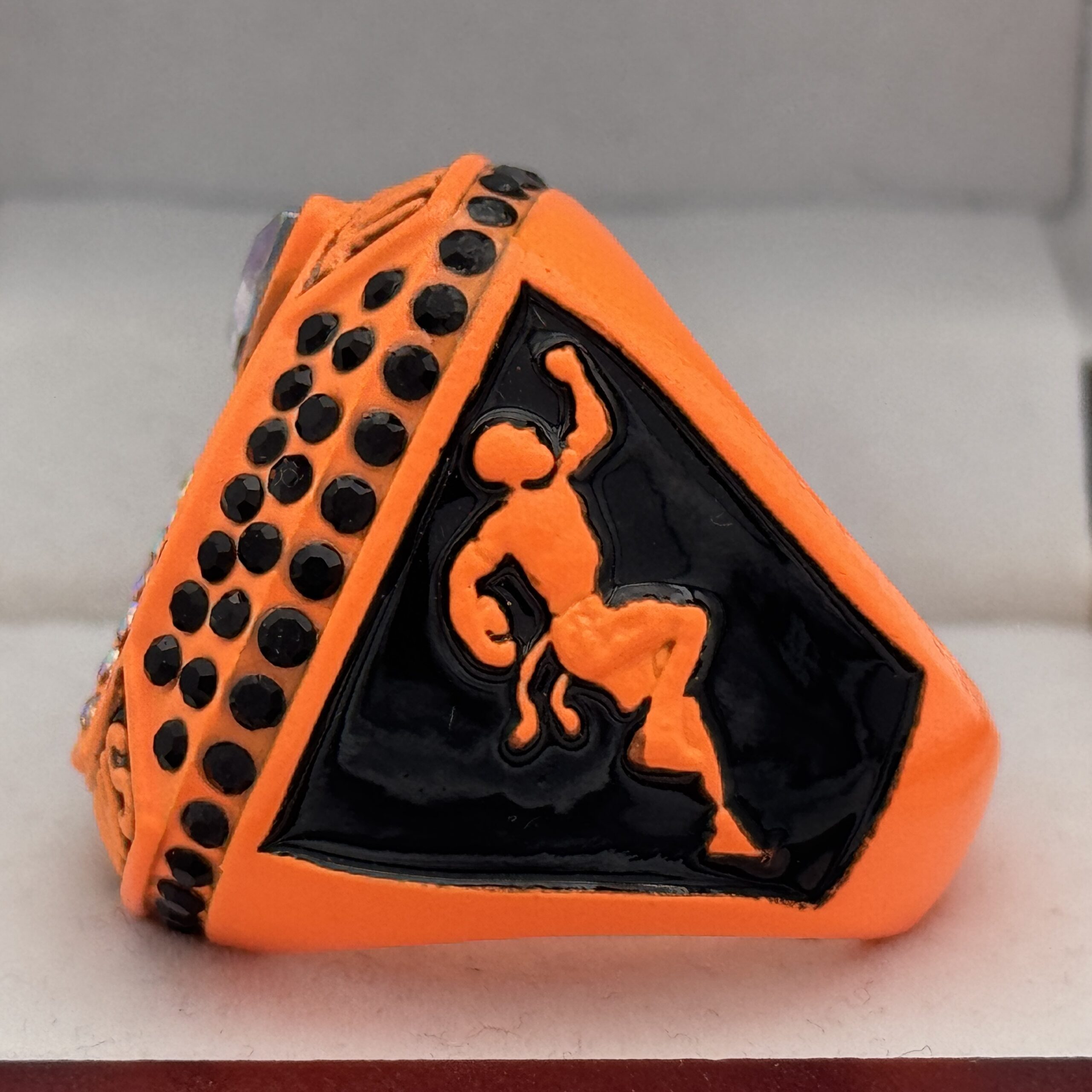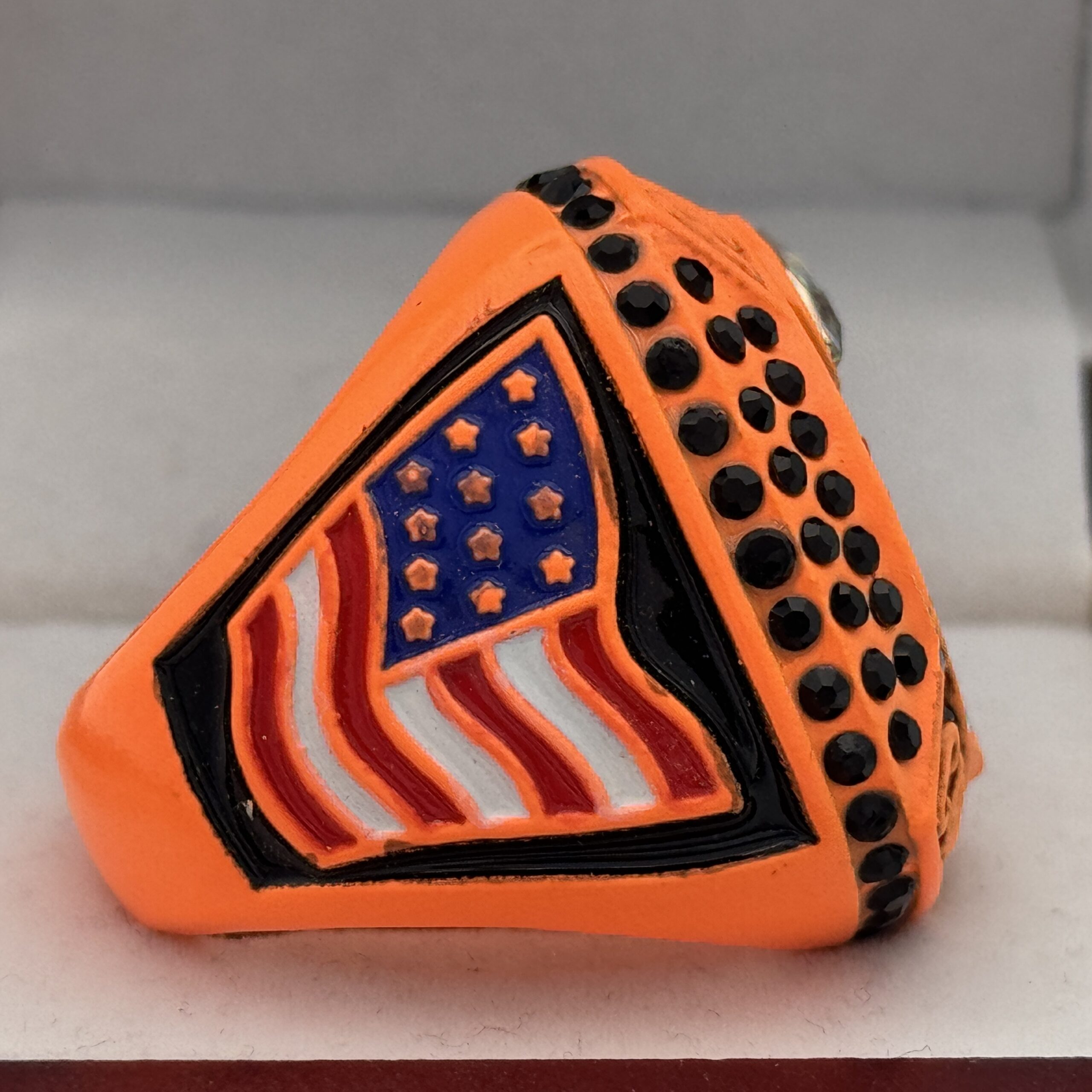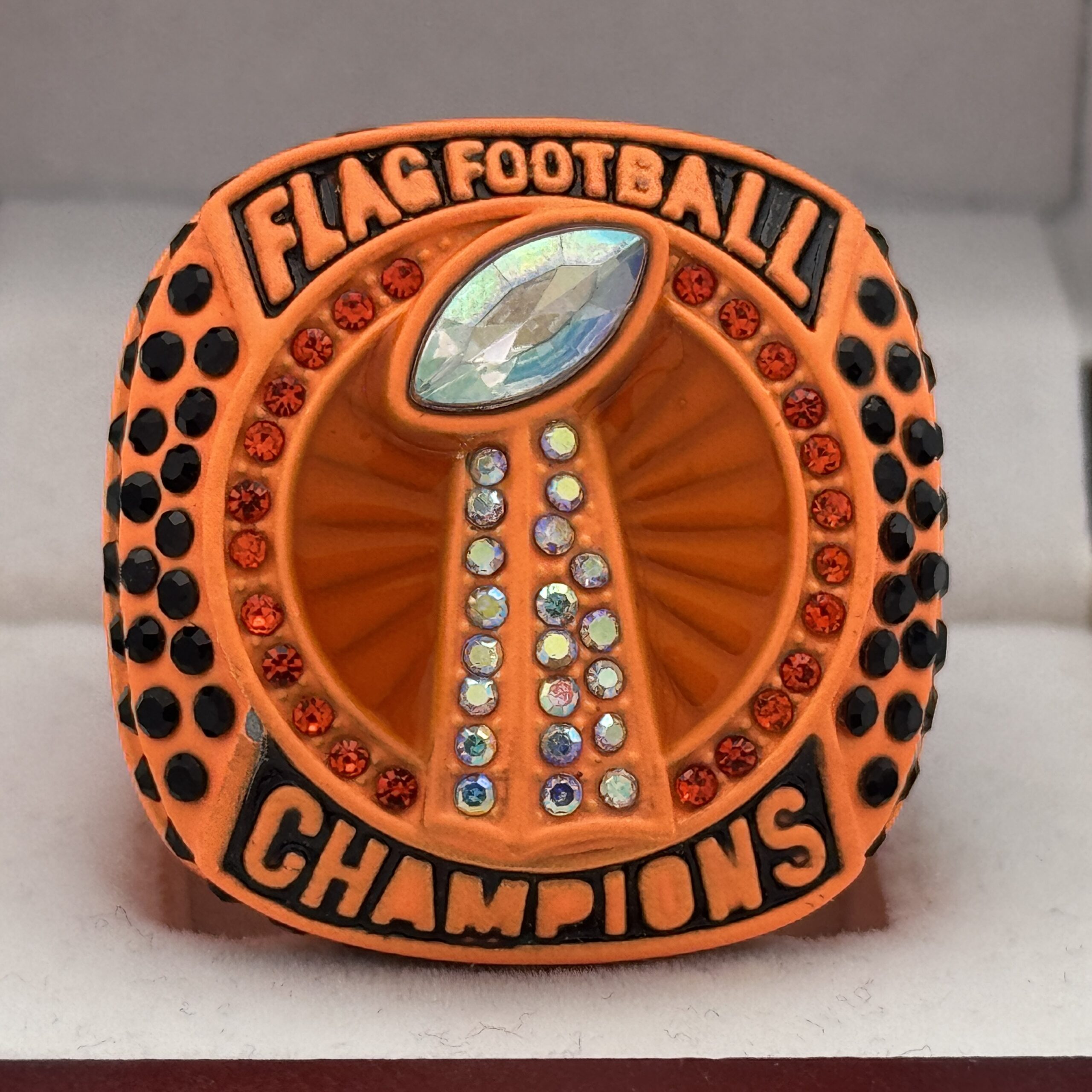This ring is made of a zinc alloy. The ring is neon orange in color. The stones on the side bezel are black in color. There is black paint on the sides of the rings and black paint on the top of the ring. The right side of the ring shows a player running with two flags on their belt and the left side shows the American flag. The top of the ring is a football and a trophy with prismatic stones and flag football champion.