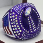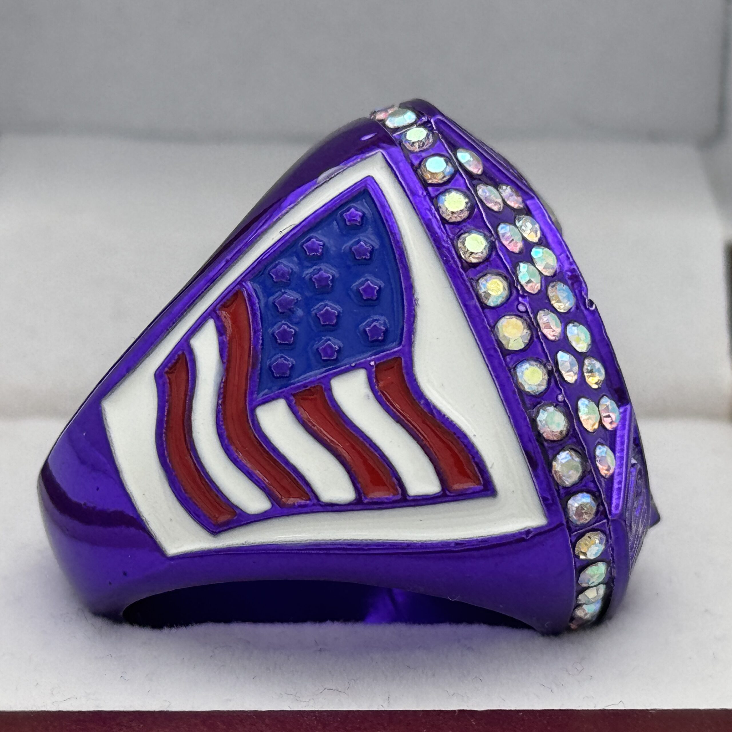 This ring is made of a zinc alloy. The ring is purple in color. The stones on the side bezel are prismatic in color. There is white paint on the sides of the rings and white paint on the top of the ring. The right side of the ring shows a player running with two flags on their belt and the left side shows the American flag. The top of the ring is a football and a trophy with prismatic stones and flag football champion.