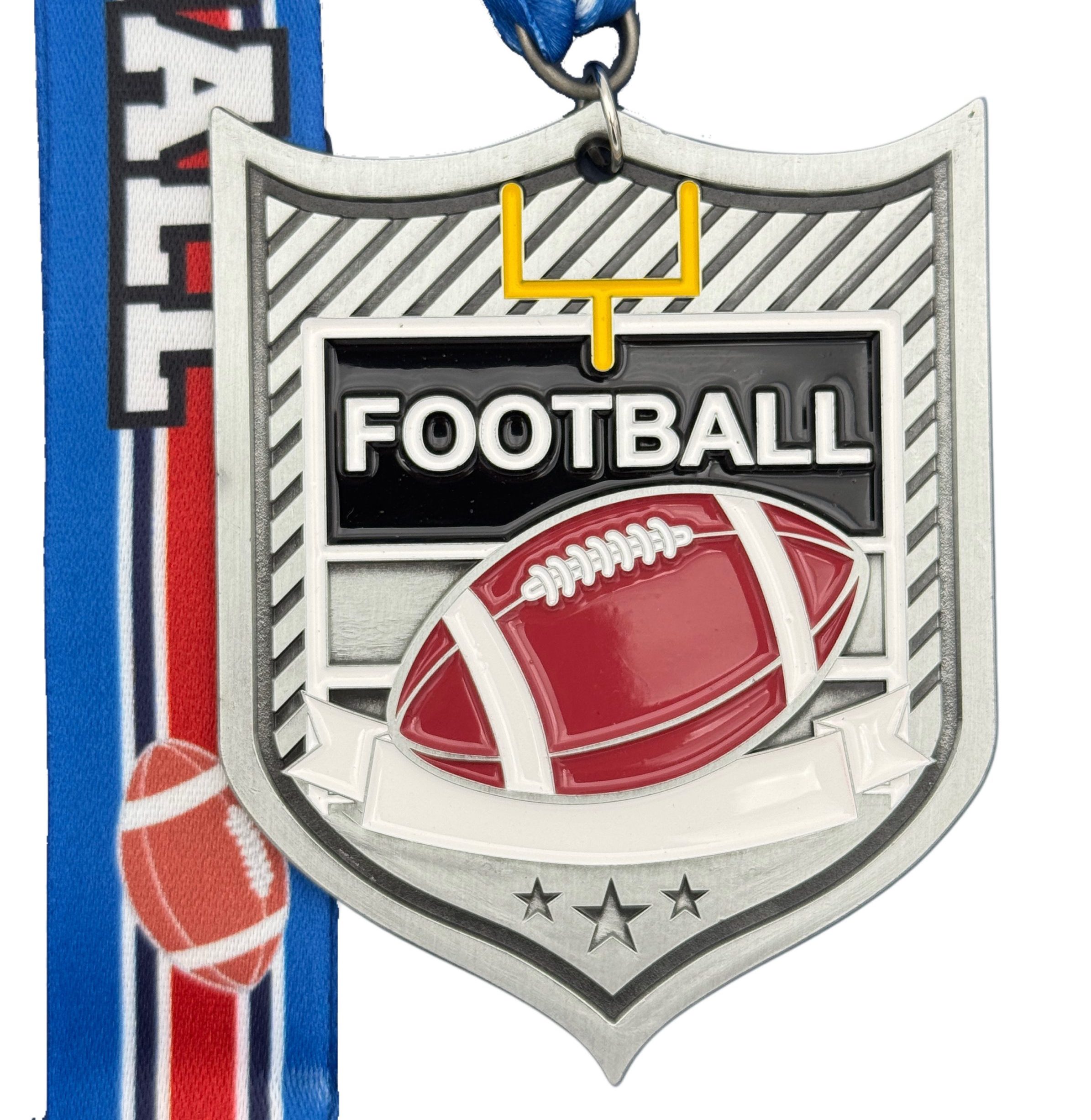 All of our medals are made of a zinc alloy. These medals are silver in color with black paint and say football. The ribbon is Red, white, and blue stripes and says football with a football.