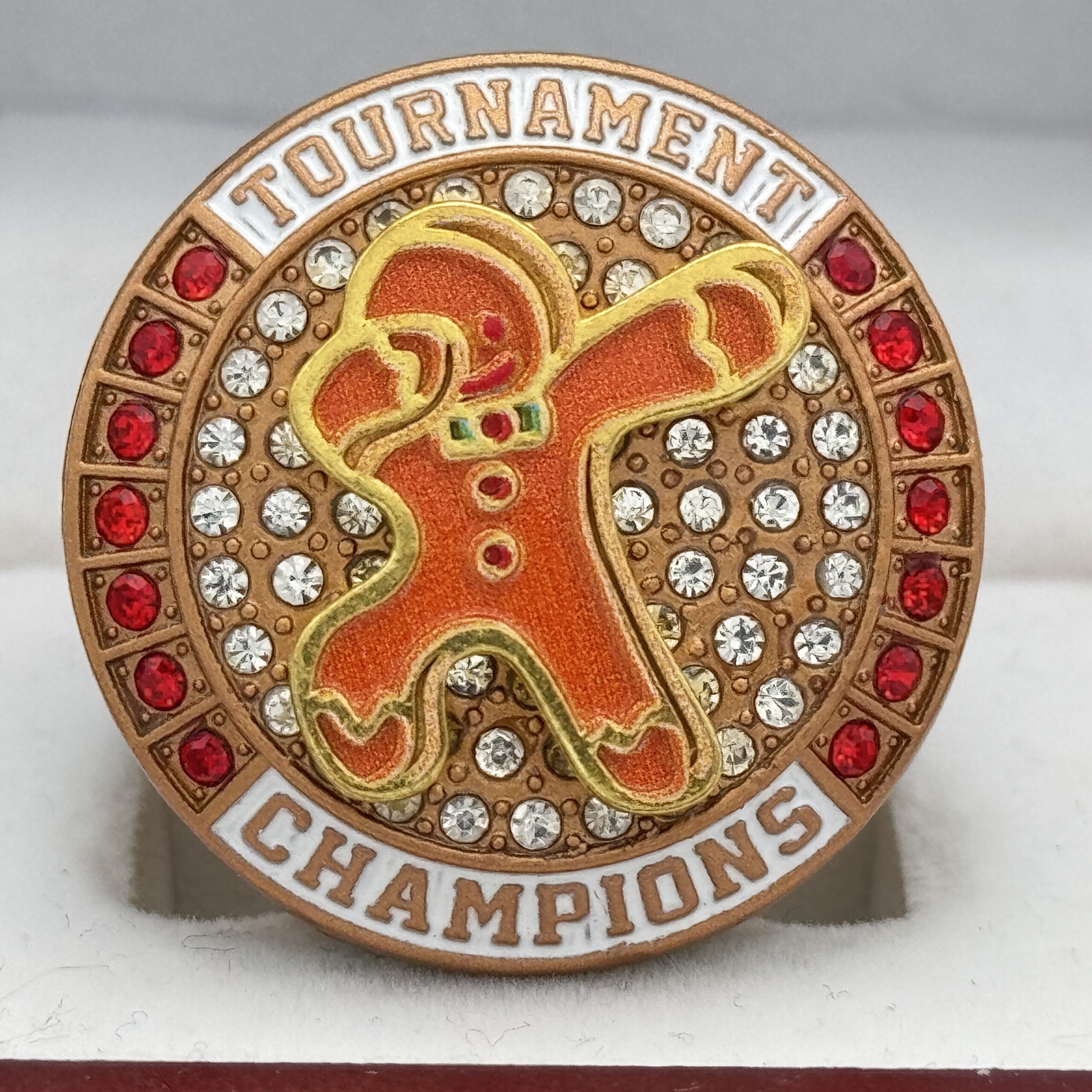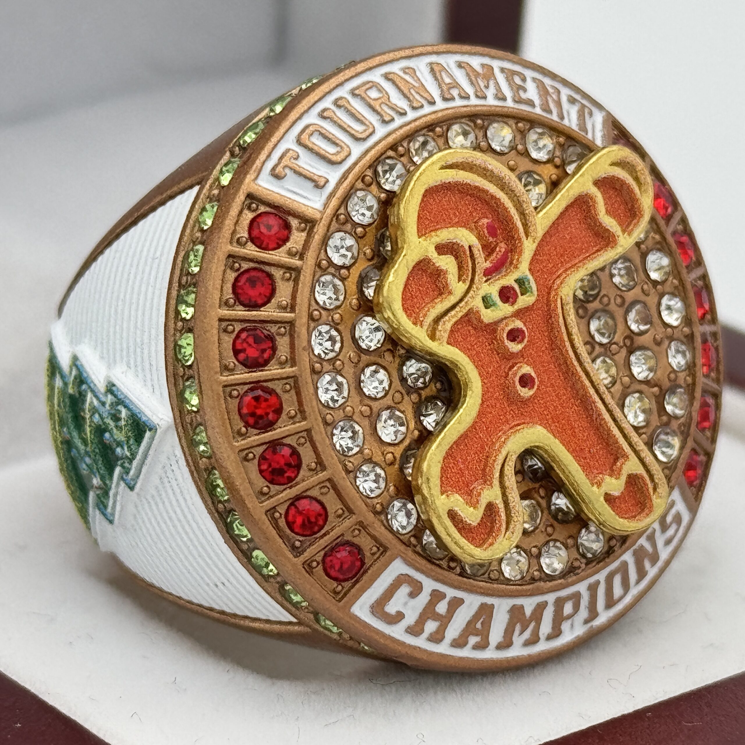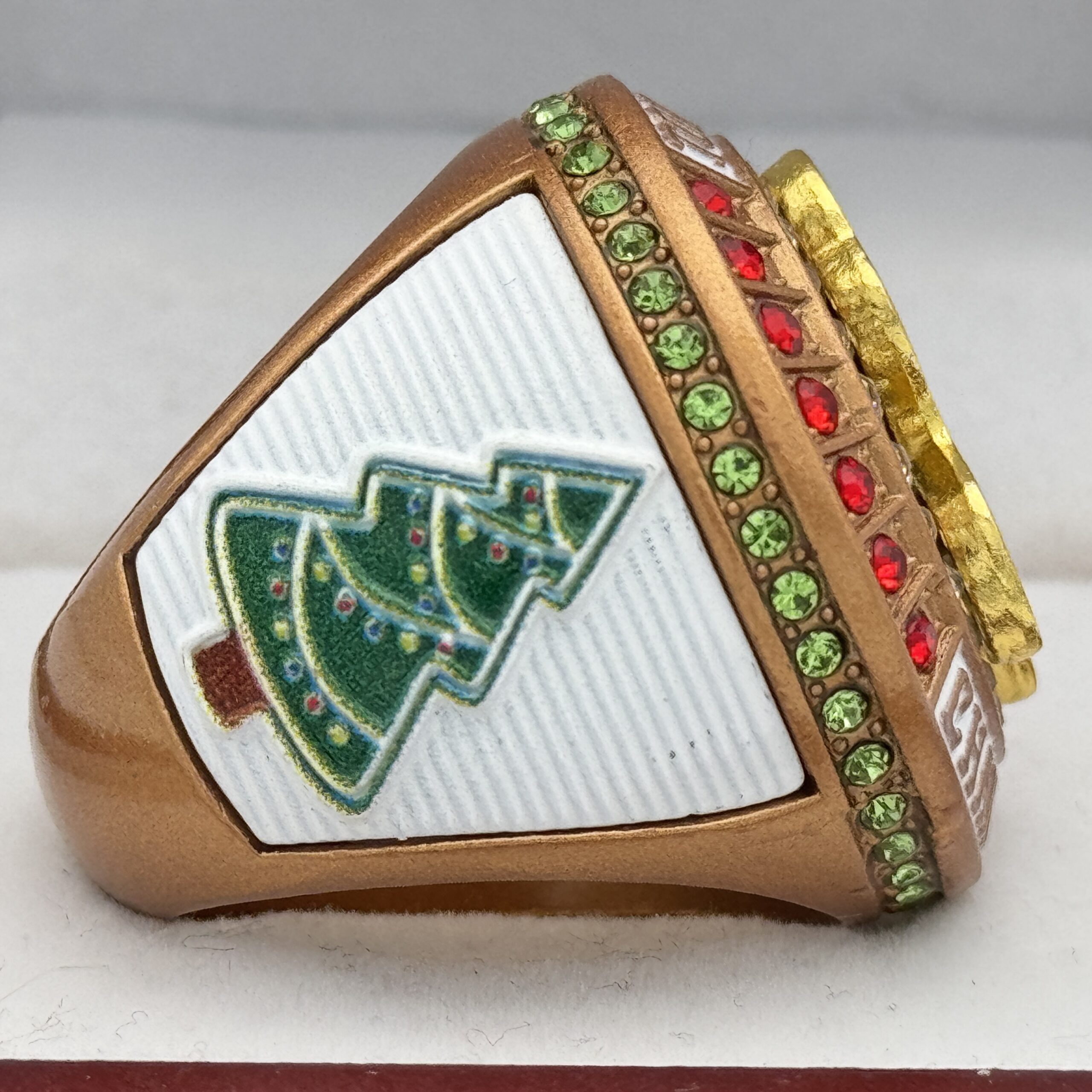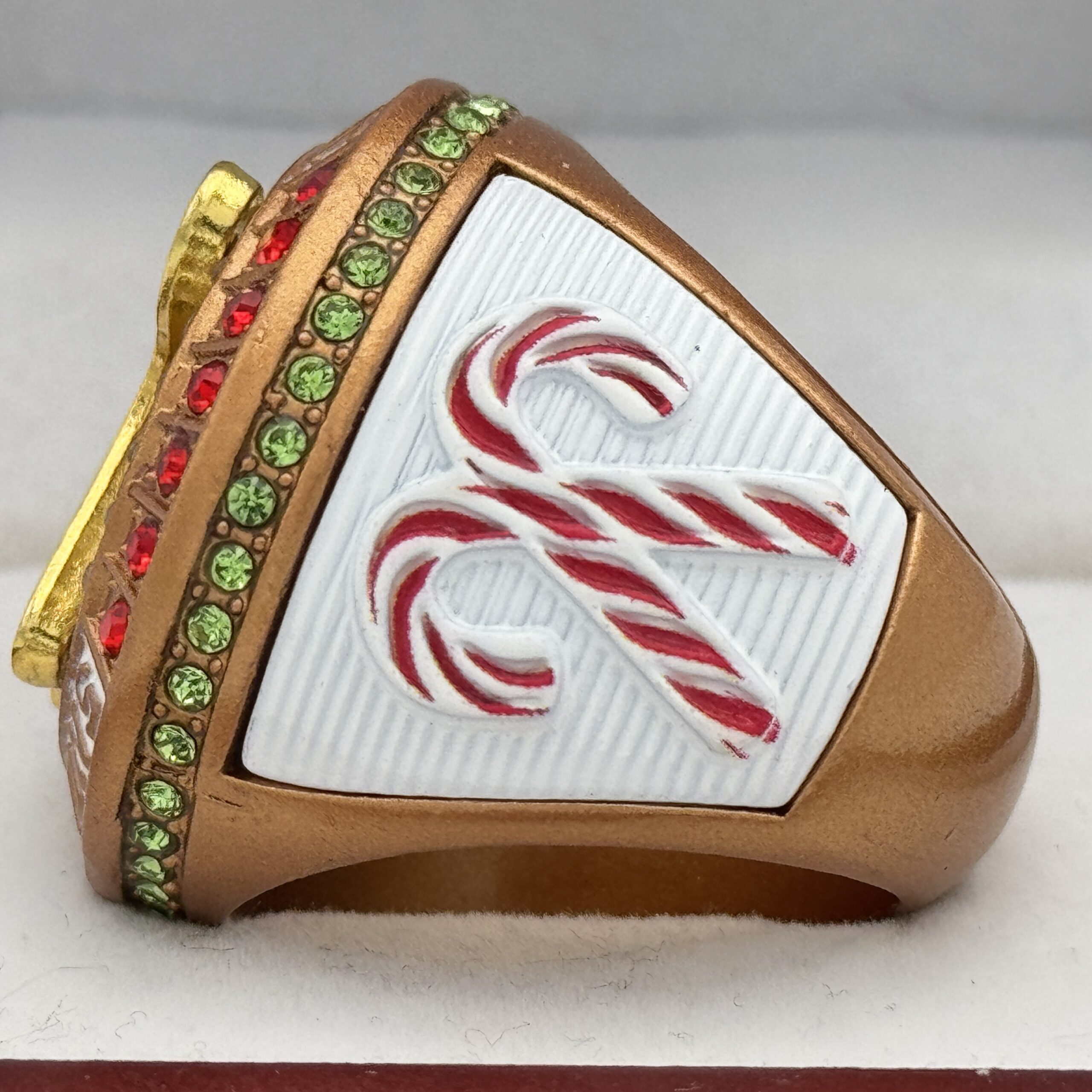 This ring is made of a zinc alloy. The ring body is bronze in color. The stones on the side bezel are green in color.  The stones in the top bezels are red in color. There are white inserts on the sides of the rings. The left side of the ring shows a Christmas tree and the right side shows candy canes. The top of the ring shows a dabbing gingerbread man with tournament champions.