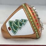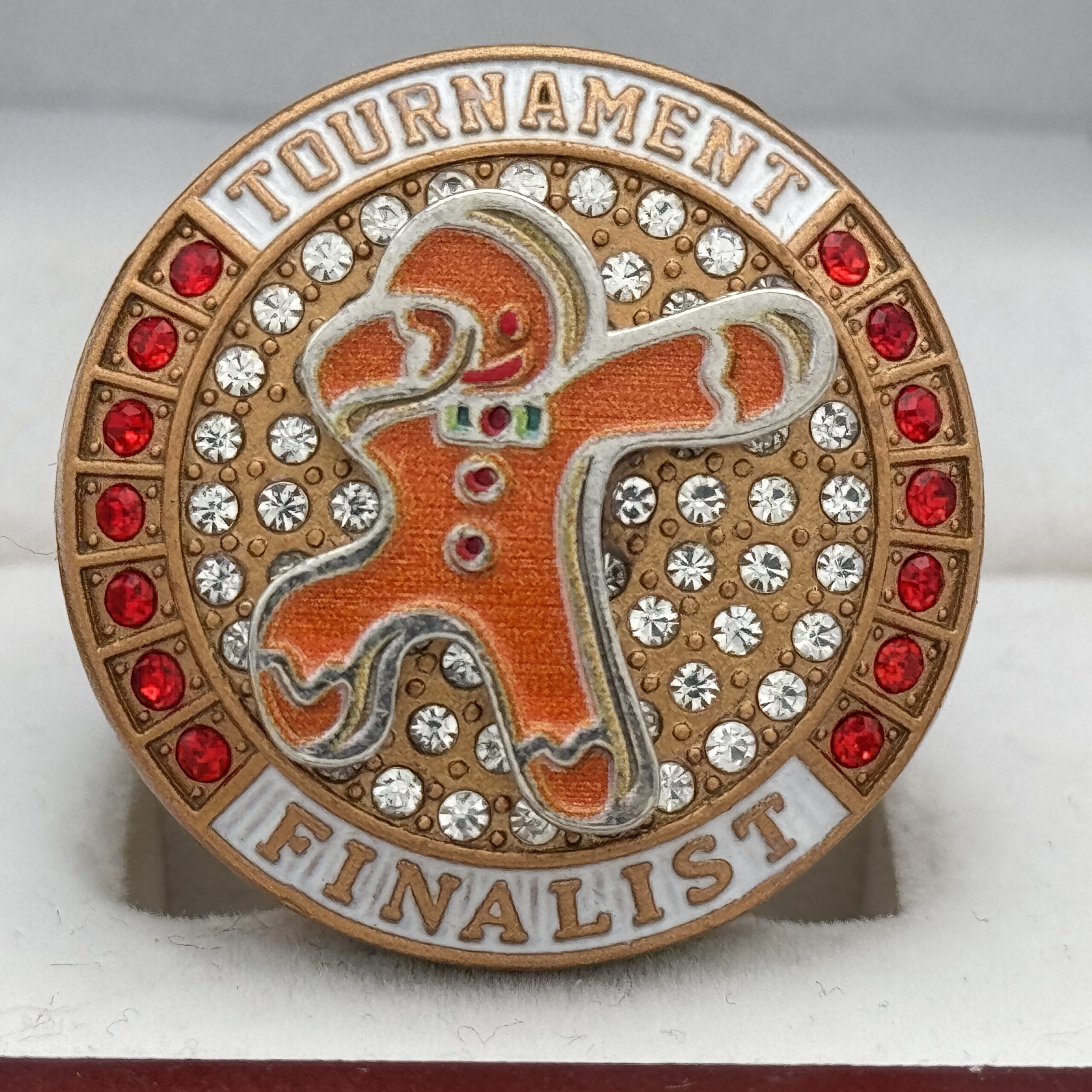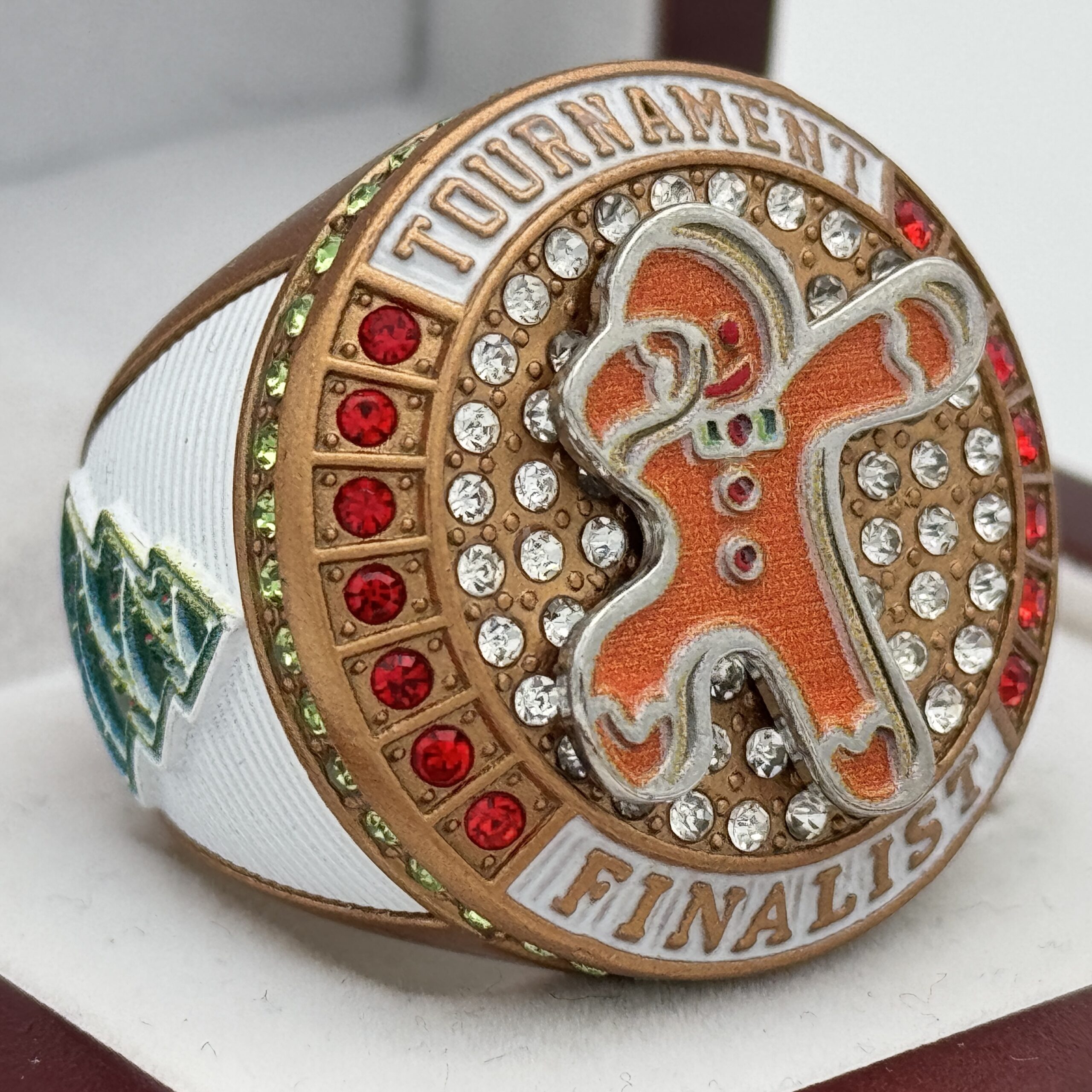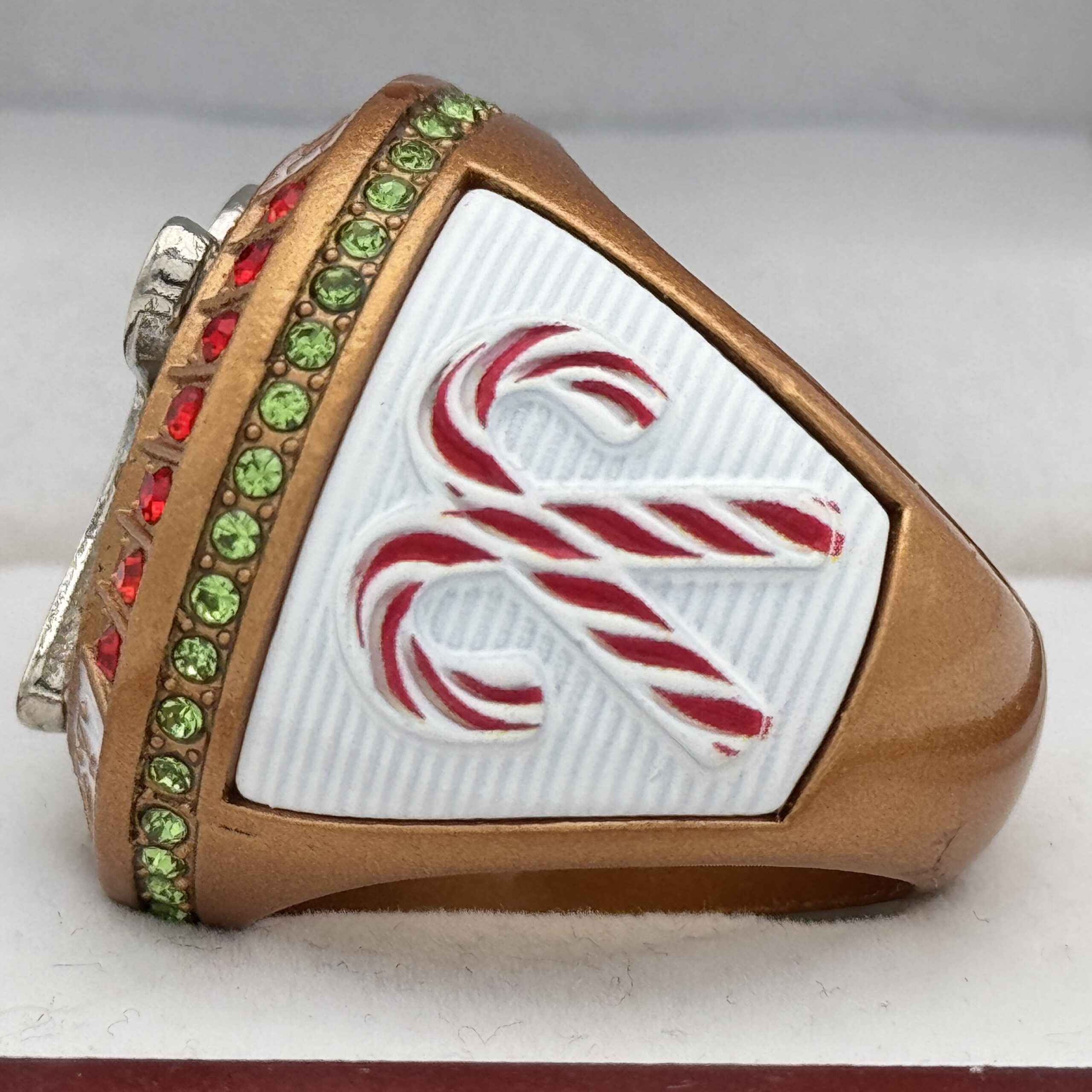 This ring is made of a zinc alloy. The ring body is bronze in color. The stones on the side bezel are green in color.  The stones in the top bezels are red in color. There are white inserts on the sides of the rings. The left side of the ring shows a Christmas tree and the right side shows candy canes. The top of the ring shows a dabbing gingerbread man with tournament finalist.