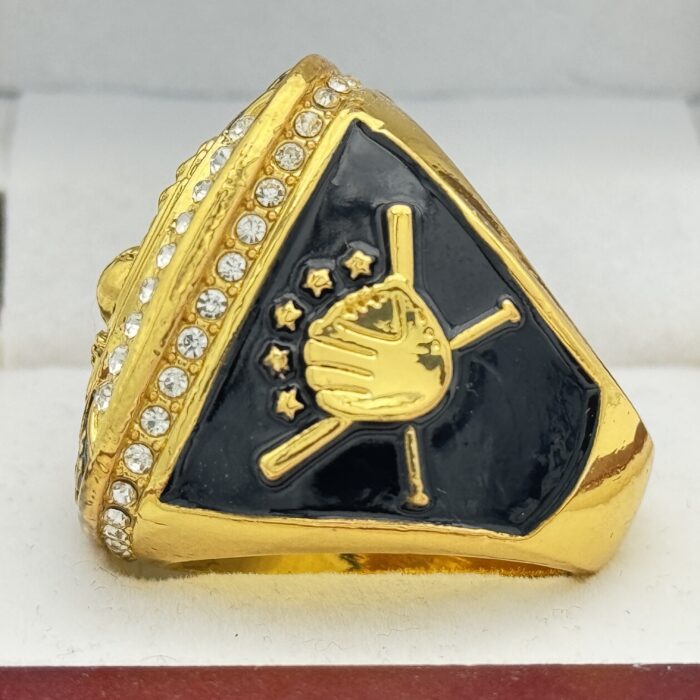 This ring is gold in color. There are clear stones on the side bezel. There are clear stones on the top bezel. There is black paint on the sides of the ring. The left side of the ring shows a player diving for a ball and the right side of the ring shows a glove and crossed bats. The top of the ring shows a glove with a ball in it and says gold glove.