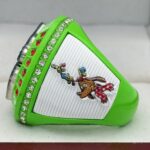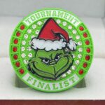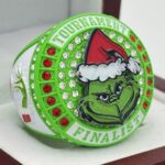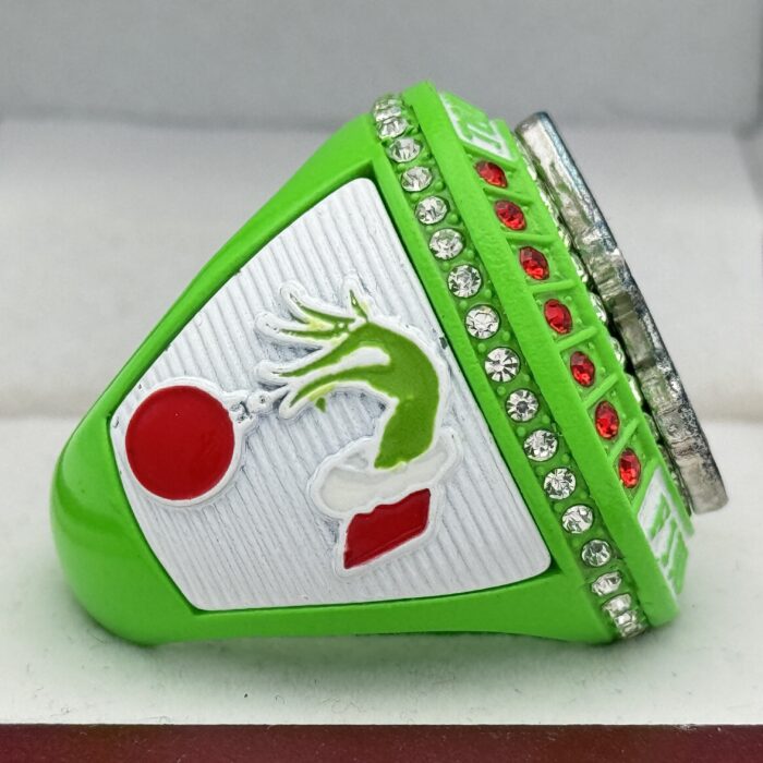 This ring is made of a zinc alloy. The ring body is green in color. The stones on the side bezel are clear in color. The stones in the top bezels are red in color. There are white inserts on the sides of the rings. The left side of the ring shows the grinch holding a Christmas ornament and the right side shows a dog with a decorated reindeer horn. The top of the ring shows the grinch smiling and tournament finalist.Â