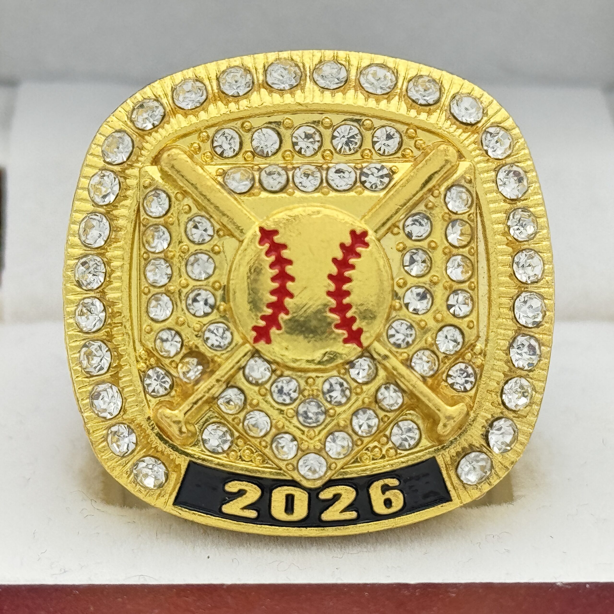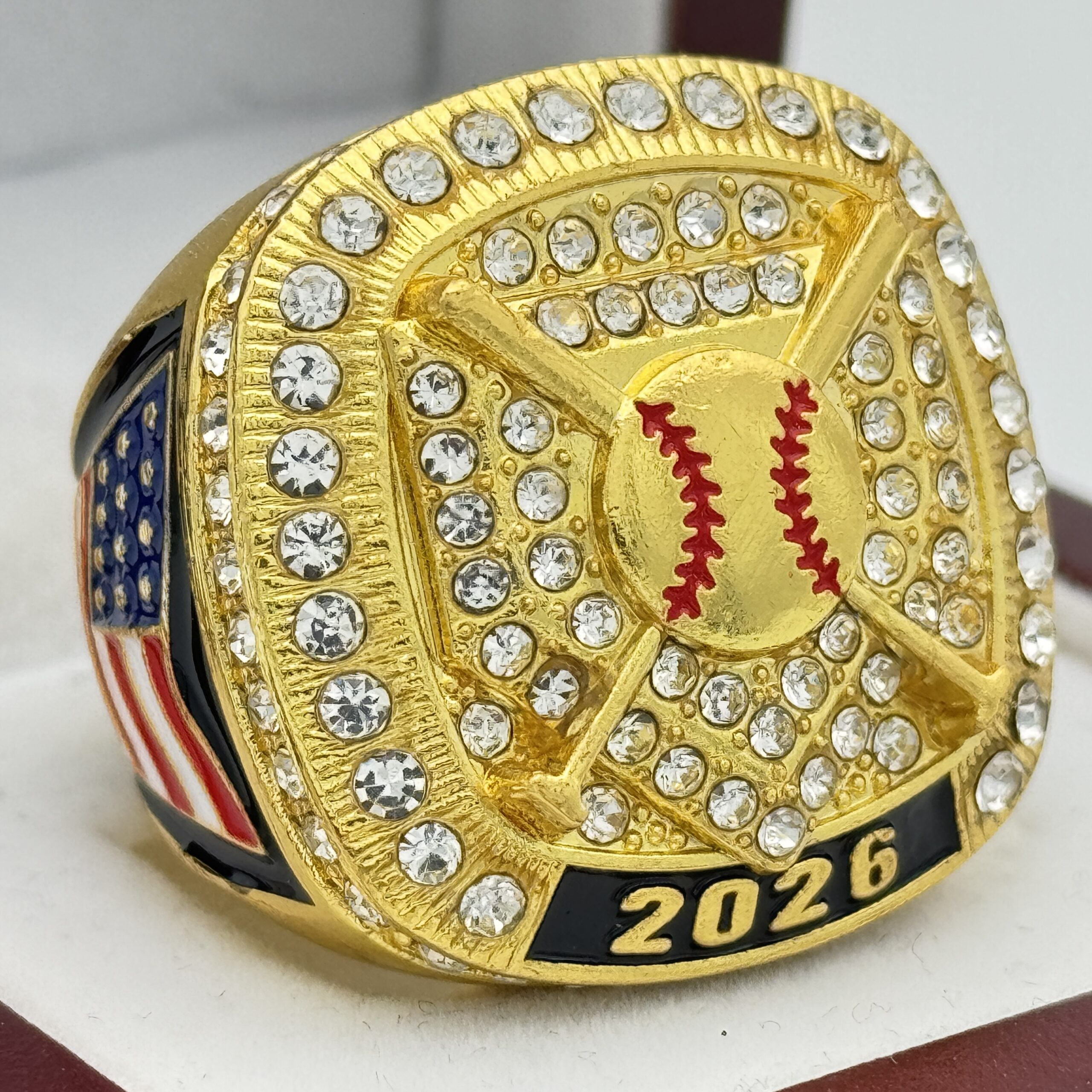 This ring is made of a zinc alloy. The ring body is gold in color. The stones on the side bezel are clear in color the stones in the top bezel are clear in color. There is black color paint on the sides of the rings. The left side of the ring shows an American Flag and the right side shows a glove with crossed bats in the background. The top of the ring shows a home plate with crossed bats in the background with clear stones and 2026.Â