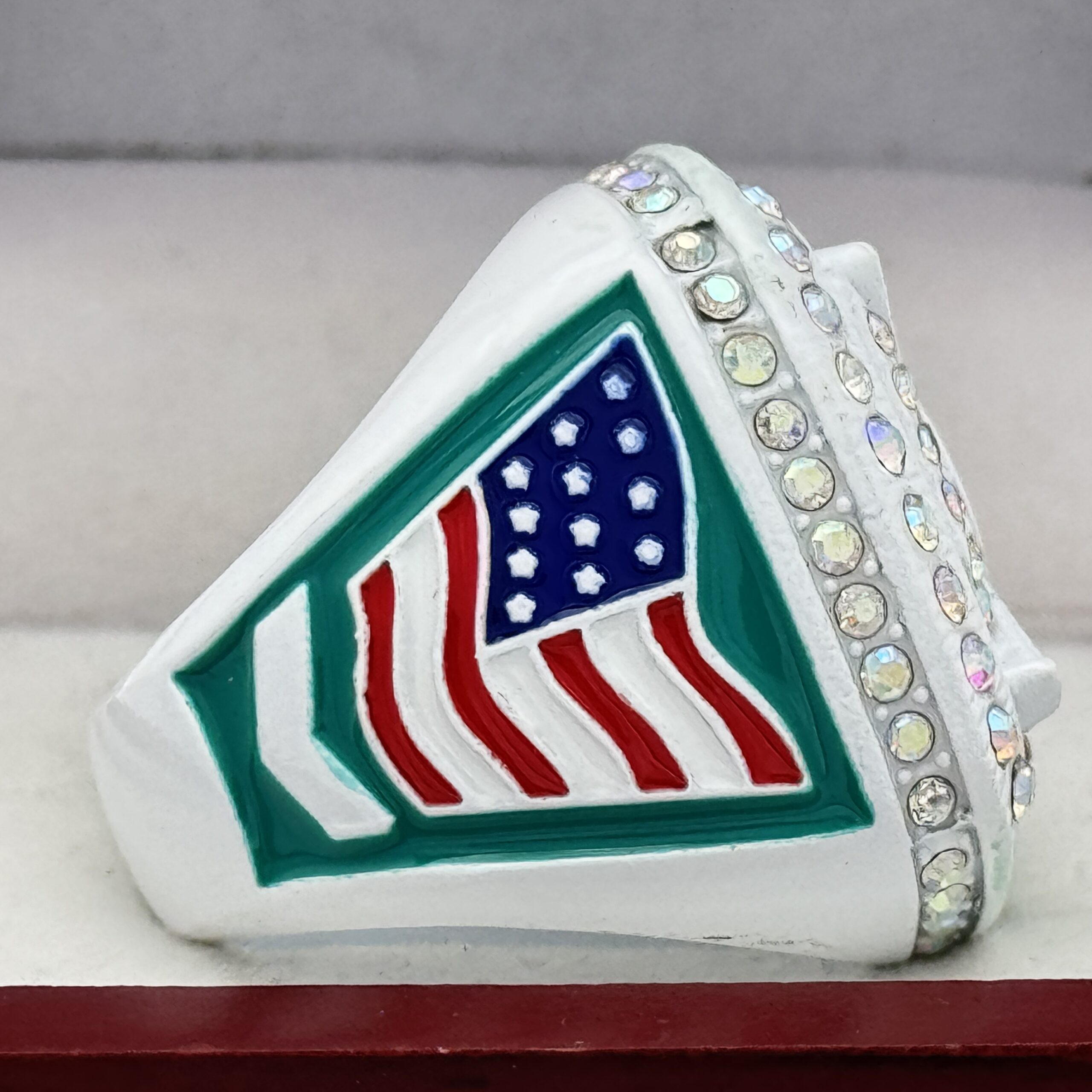 This ring is made of a zinc alloy. The ring body is white in color. The stones on the side bezel are prismatic in color the stones in the top bezel are prismatic in color. There is green color paint on the sides of the rings. The left side of the ring shows an American Flag and the right side shows a glove with crossed bats in the background. The top of the ring shows a home plate with crossed bats in the background with clear stones and TOURNAMENT champions on the top.
